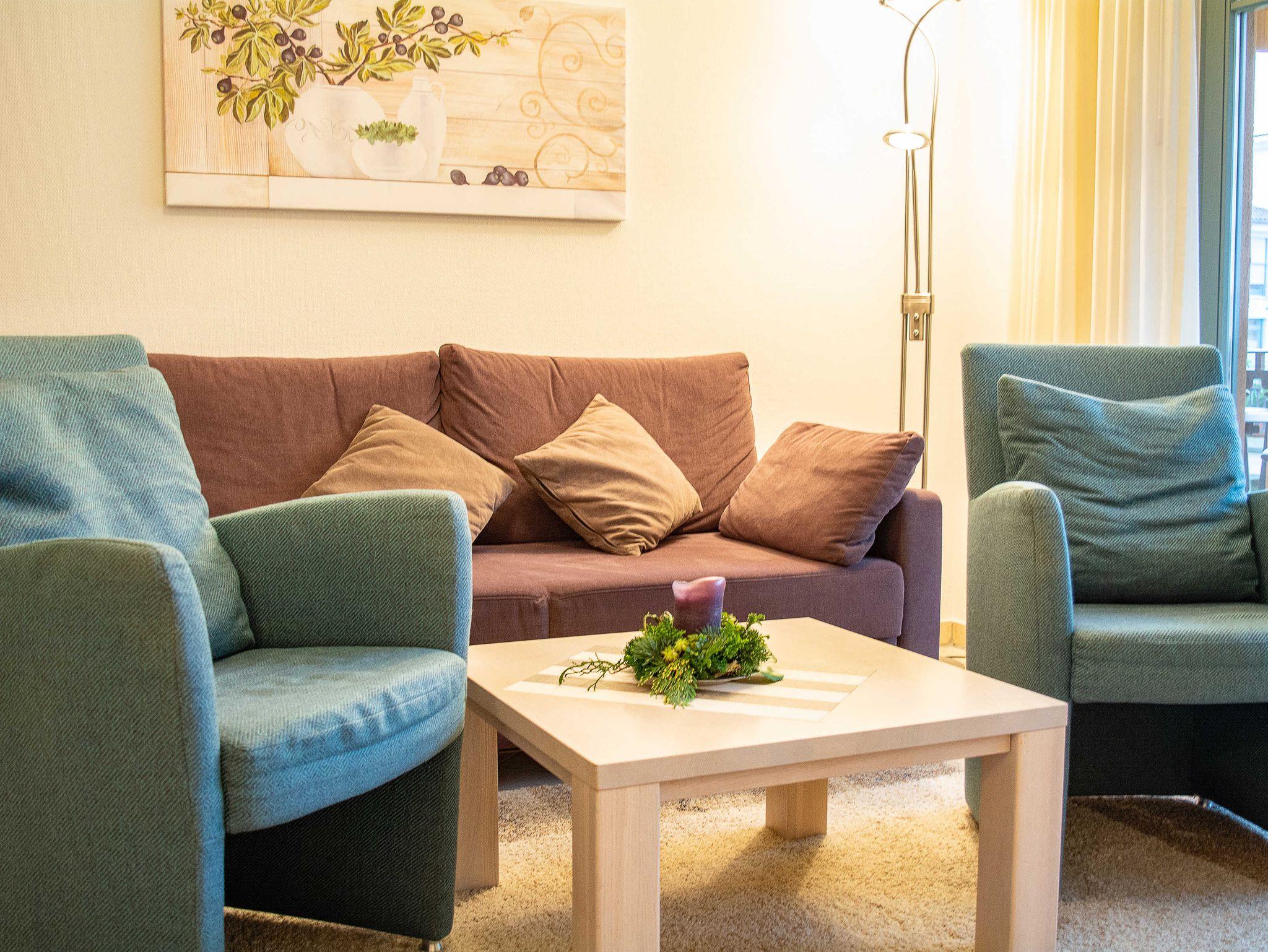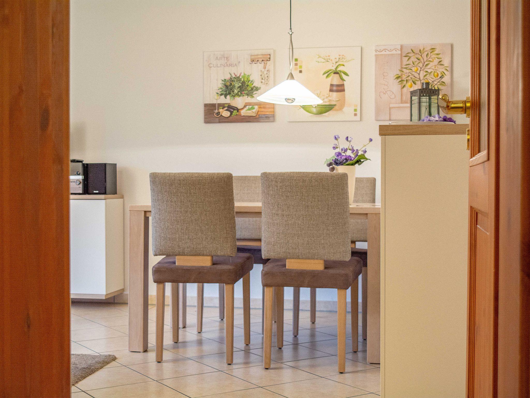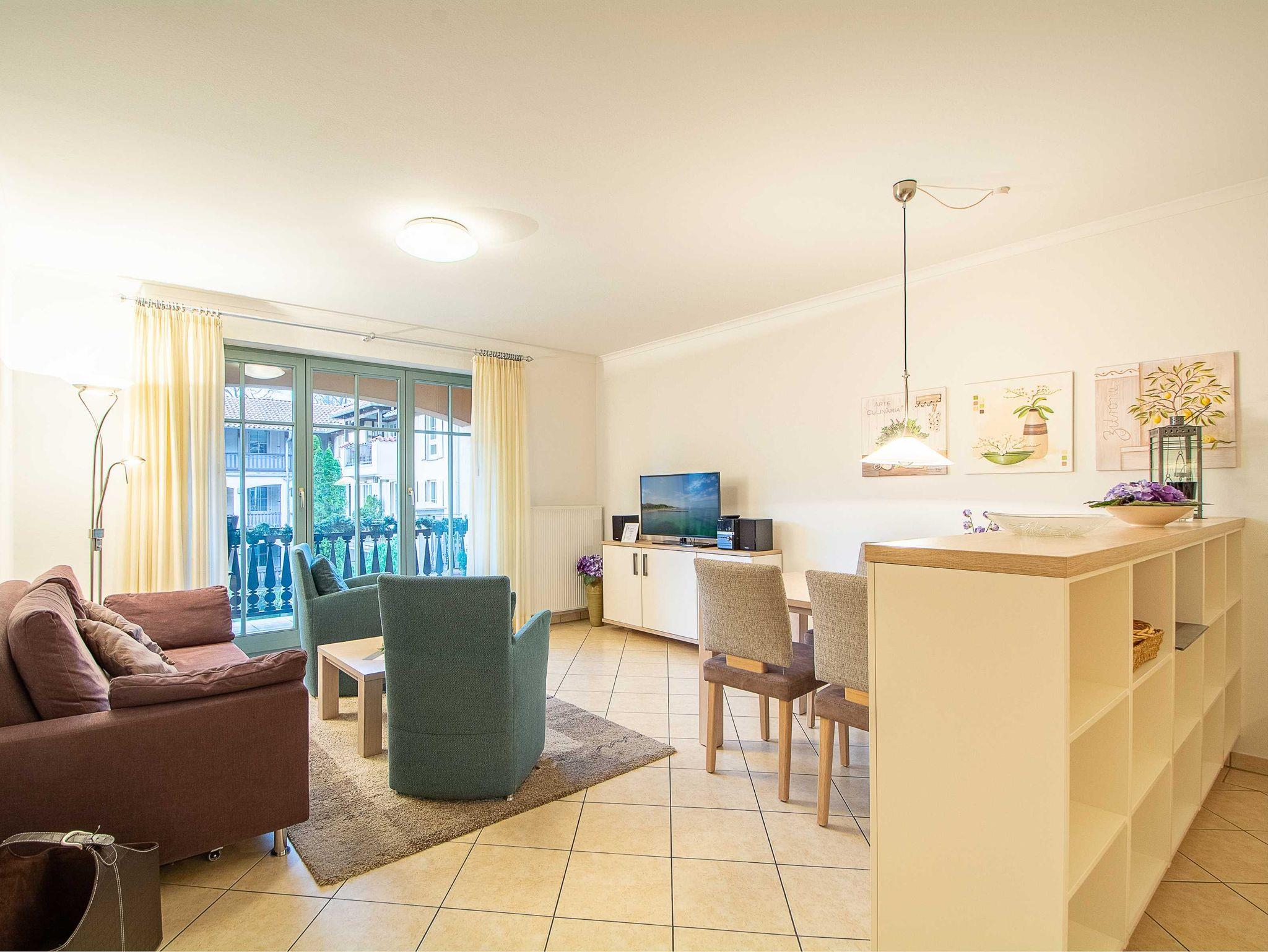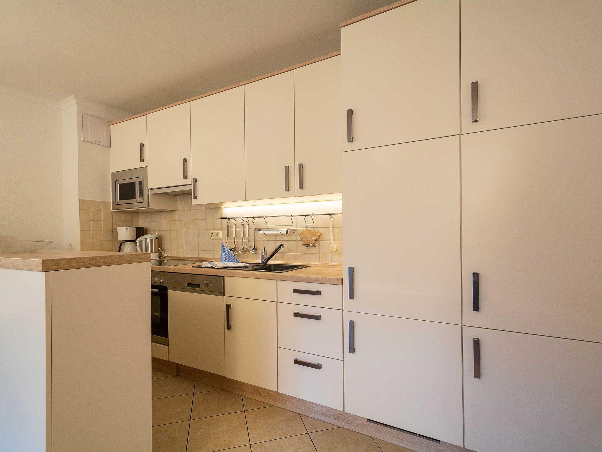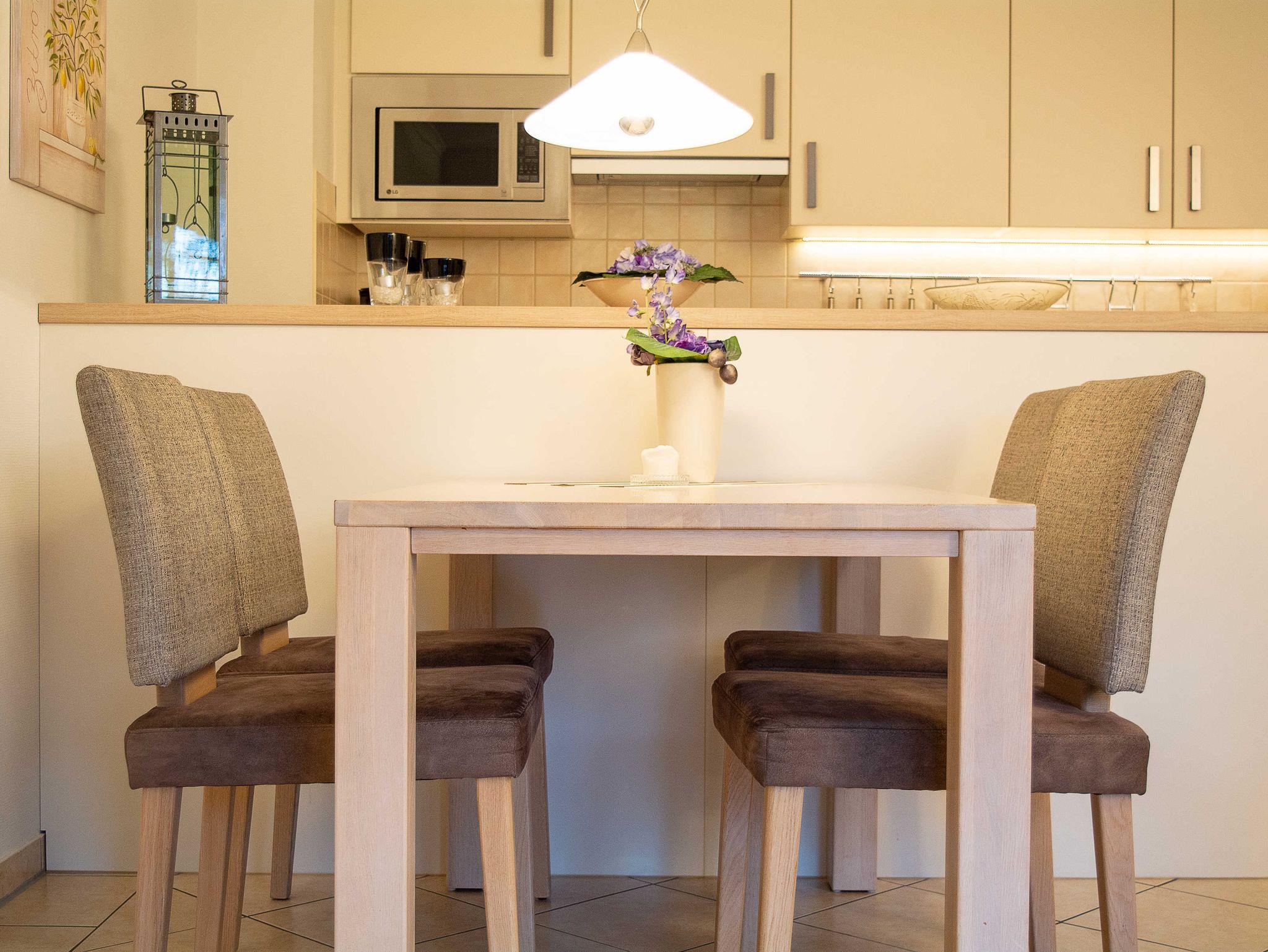 Herzlich willkommen in der Residenz Laguna! Sie wohnen in einer 76 m² großen 3-Raum-Wohnung, die sich im 1. Obergeschoss befindet und für 2 bis 4 Personen geeignet ist. Der helle freundliche Wohnraum ist ausgestattet mit einer gemütlichen Schlafcouch, einem Esstisch für 4 Personen, Flat Sreen-TV und einer Stereoanlage. Das Herz der Wohnung ist der große möblierte West-Balkon mit direktem Blick auf den wunderschönen Innenhof und die mediterrane Teichlandschaft. Hier können Sie Sonnenbaden, Relaxen oder den Abend zu einem Glas Wein ausklingen lassen. Dem Essbereich schließt sich die moderne und offen gestaltete Küchenzeile an, die mit allen wichtigen Küchengeräten und -utensilien ausgestattet ist, die Sie für Ihr „perfektes Dinner“ benötigen (4-Platten-Cerankochfeld mit Backofen und Dunstabzug, Geschirrspüler, Mikrowelle, Kühlschrank, Kaffeemaschine, Wasserkocher, Toaster etc.). Die Wohnung ist durchgehend mit mediterranen Fliesen versehen. Die beiden Schlafzimmer sind jeweils ausgestattet mit einem Doppelbett, einem geräumigen Kleiderschrank für Ihre Urlaubsgarderobe. Ein Schlafzimmer ist mit Blick in den Innenhof ausgerichtet - Sie können von hier ebenfalls den großen Balkon betreten. Das ebenfalls im mediterranen Stil geflieste Tageslichtbad ist mit einer Dusche und WC ausgestattet und sorgt dank eines Badheizkörpers für immer kuschlig warme Handtücher.