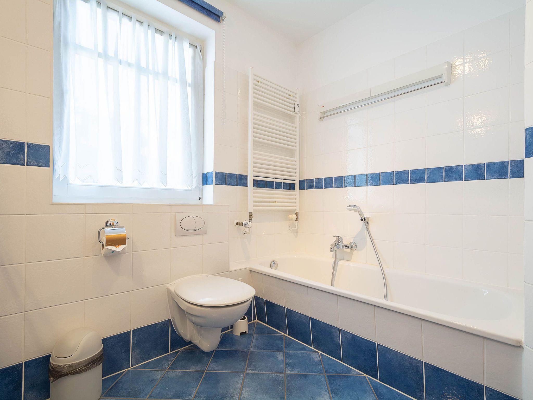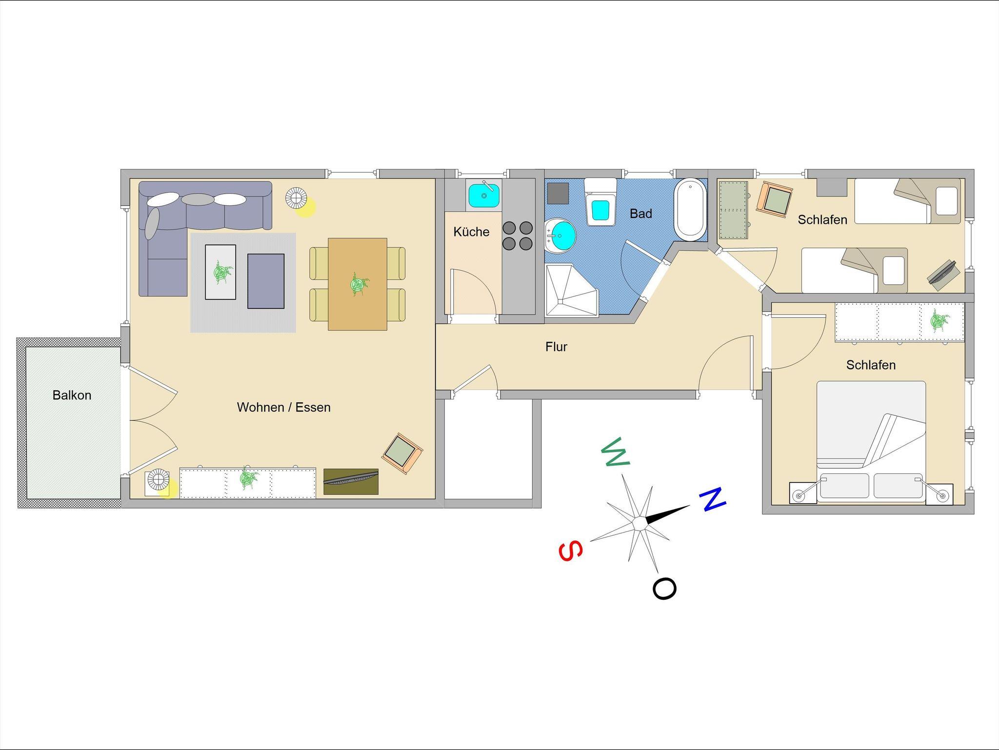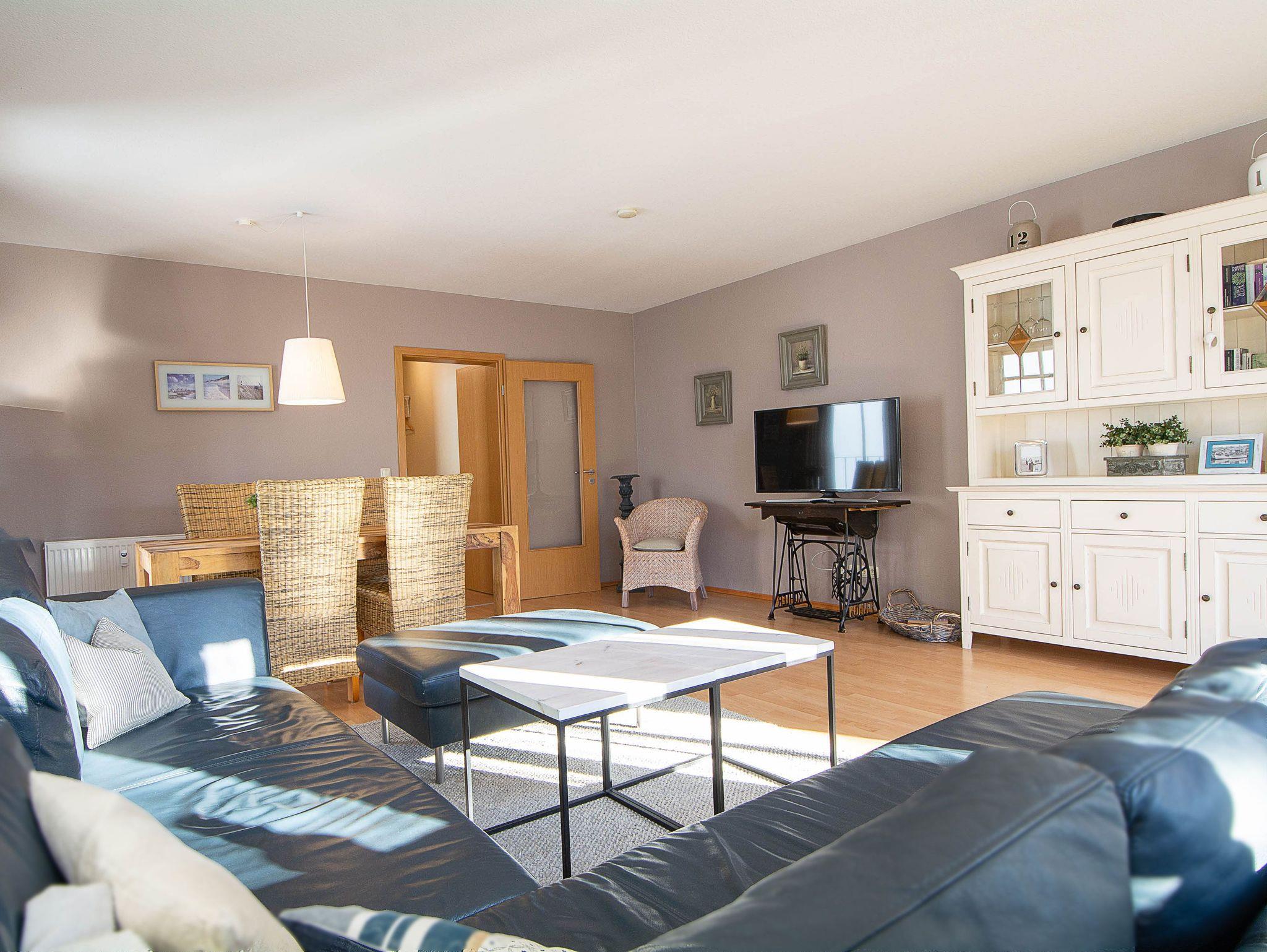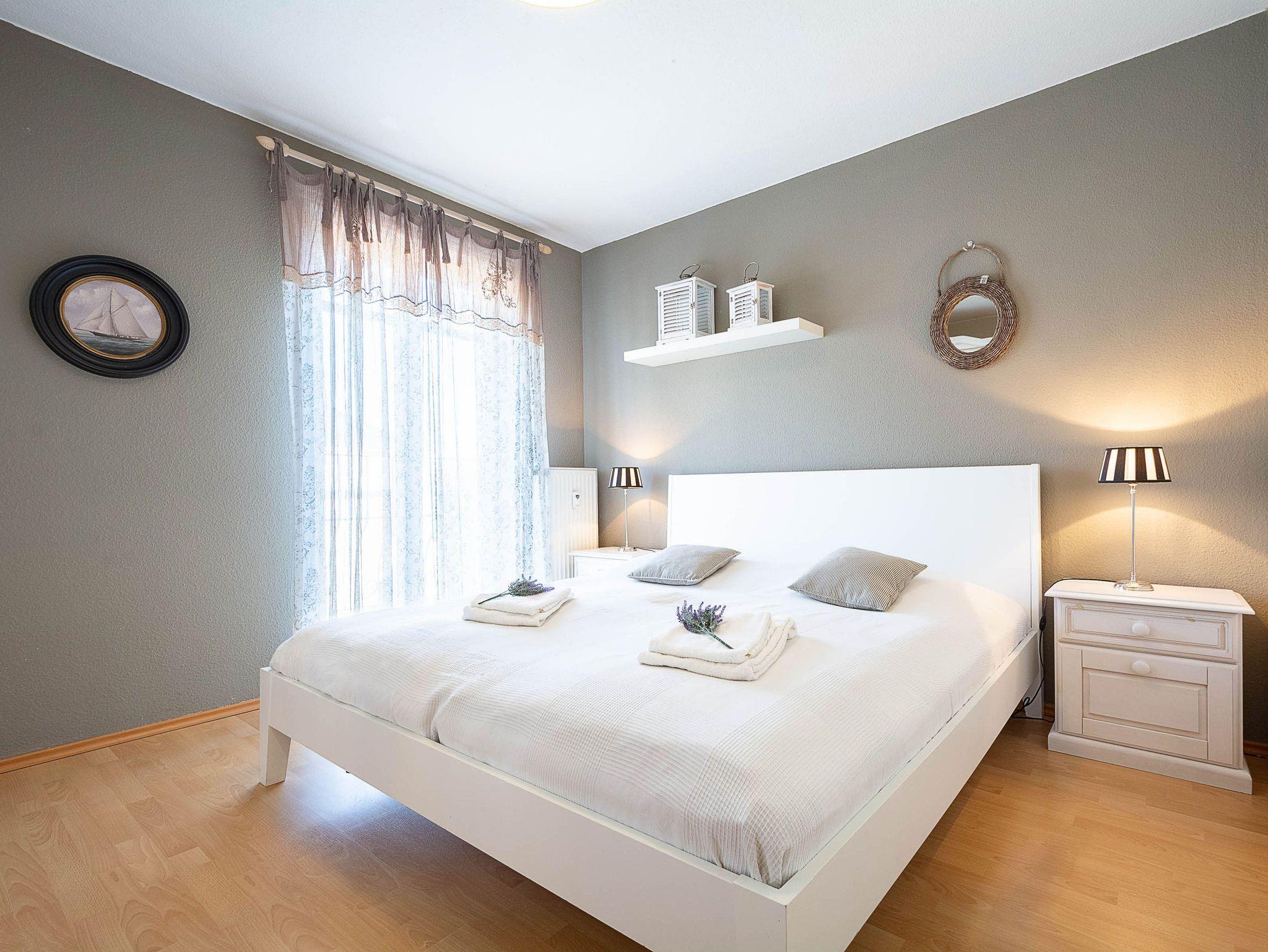 Sie erholen sich in einer komfortablen und liebevoll eingerichteten 3-Raum-Wohnung von ca. 70 qm Größe, die sich ersten Obergeschoss befindet. Das Wohnzimmer ist ausgestattet mit bequemer Couchgarnitur, Essecke, Radio und TV-Gerät. Vom Wohnraum aus betreten Sie den nach Süden ausgerichteten Balkon, der zum Sonnenbaden und langen Abenden zu einem Gläschen Wein einlädt. In der separaten Küche finden Sie Herd mit Backofen, Geschirrspüler, Mikrowelle usw. Ein Schlafzimmer mit Doppelbett und ein Schlafzimmer mit zwei Einzelbetten sowie das Bad mit Dusche und WC vervollständigen das Gesamtbild dieser Wohnung.
