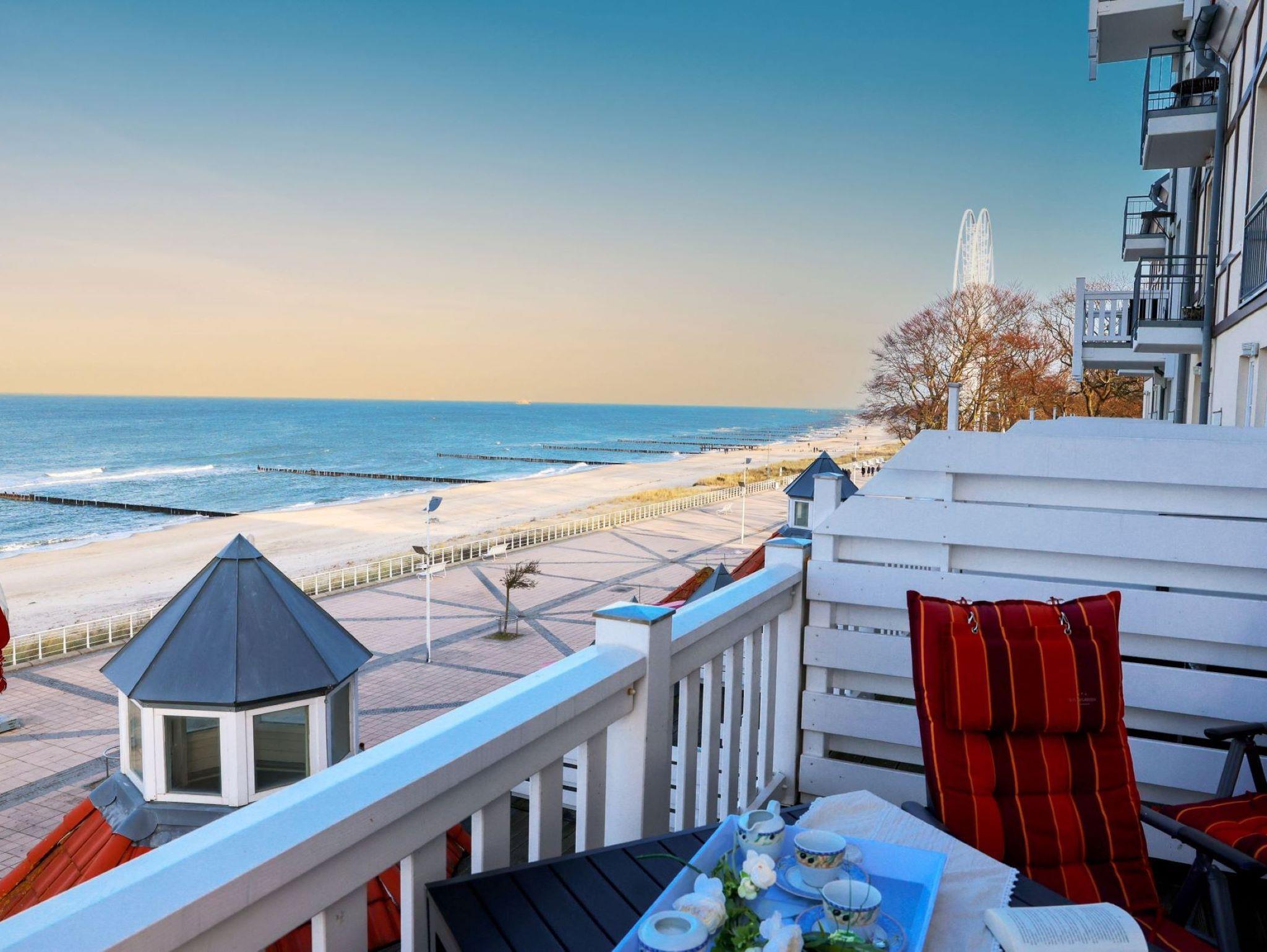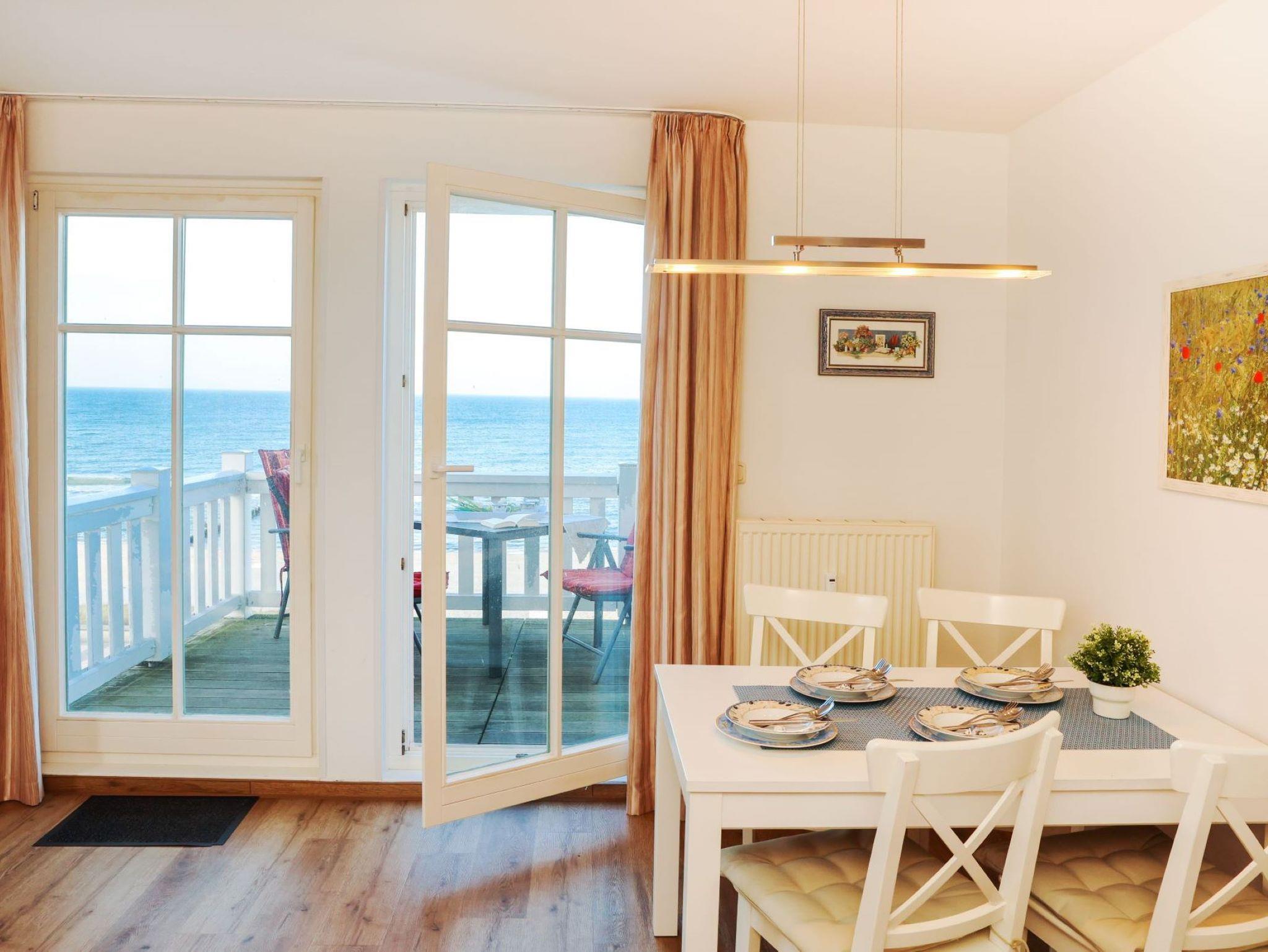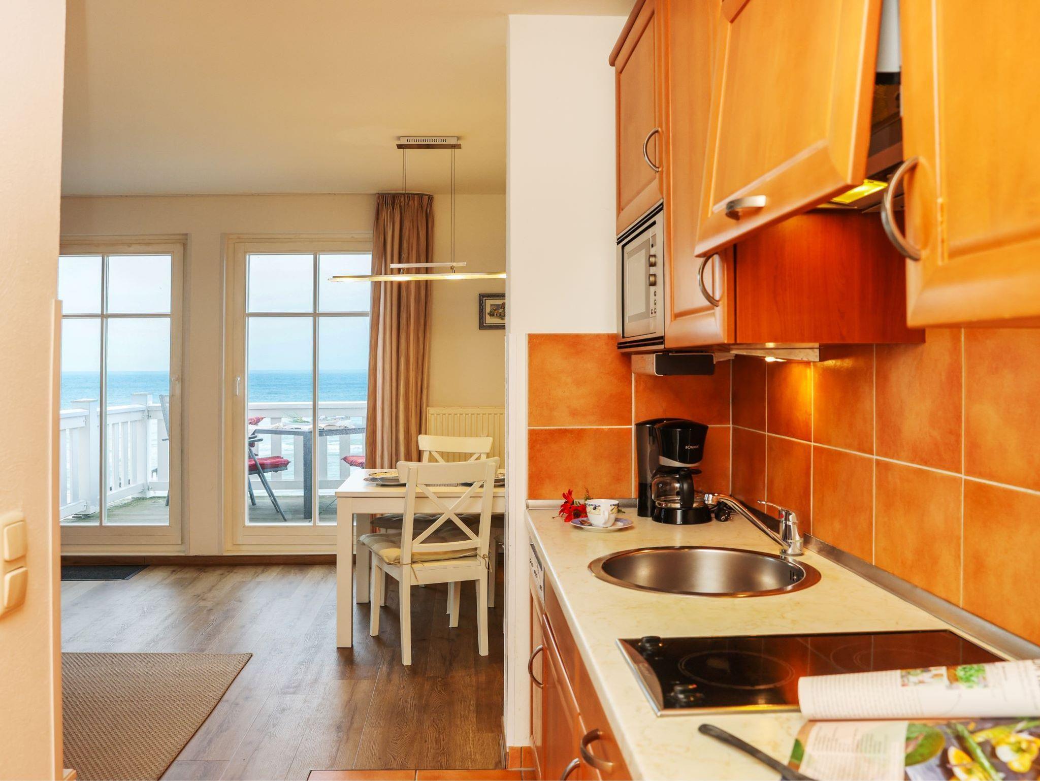 Nur 10 m vom Strand wohnen Sie in einer modern eingerichteten 3-Raum-Ferienwohnung. Die 60 qm große Wohnung liegt in der 4. Etage. Das Wohnzimmer ist mit einer Schlafcouch, Couchtisch, zwei Sessel, Anrichte, Kabel-TV, Radio, Essbereich (Esstisch und 4 Stühle) und Küchenzeile ausgestattet. Das französische Fenster bietet einen freien Blick auf die Ostsee. Im Schlafzimmer stehen ein Doppelbett und ein Kleiderschrank und im Gästezimmer ein Ausziehbares Bett und ein Wäscheschrank. Die Küchenzeile wurde modern ausgestattet mit Mikrowelle, Kühlschrank, Kaffeemaschine, Zweiplattenkochfeld, Geschirrspüler, Toaster und Wasserkocher. Das Bad mit Dusche/WC und der Flur mit Garderobe komplettieren die Wohnung.