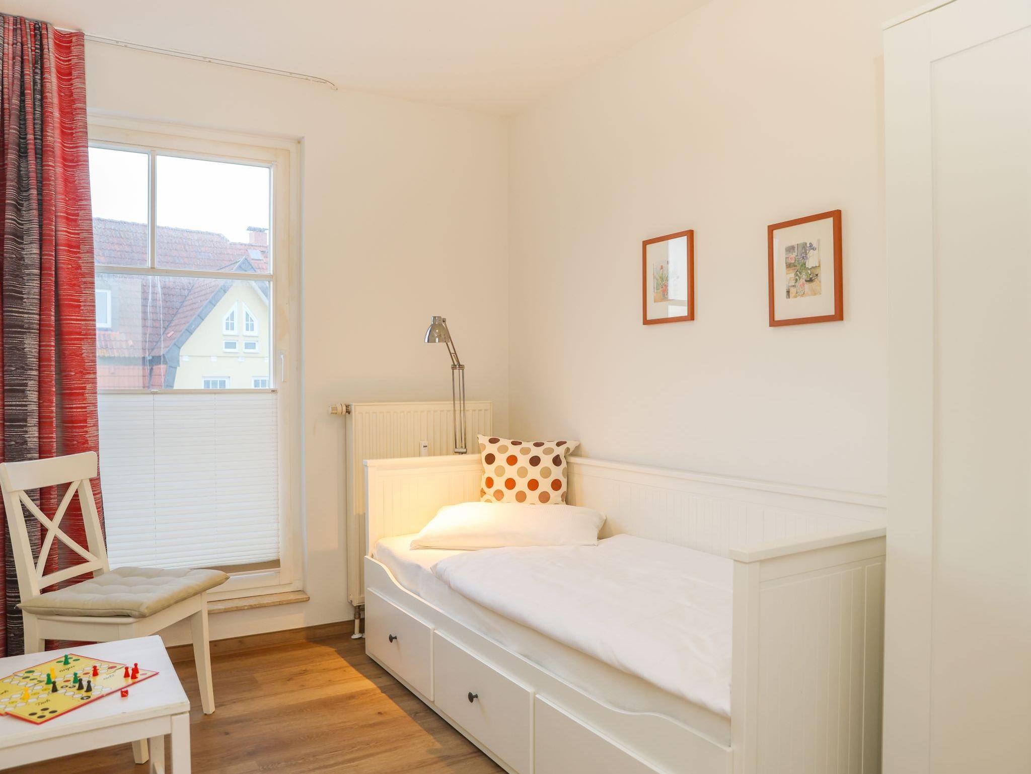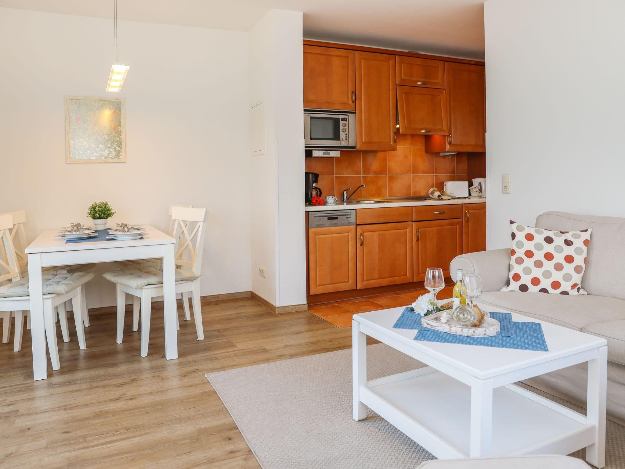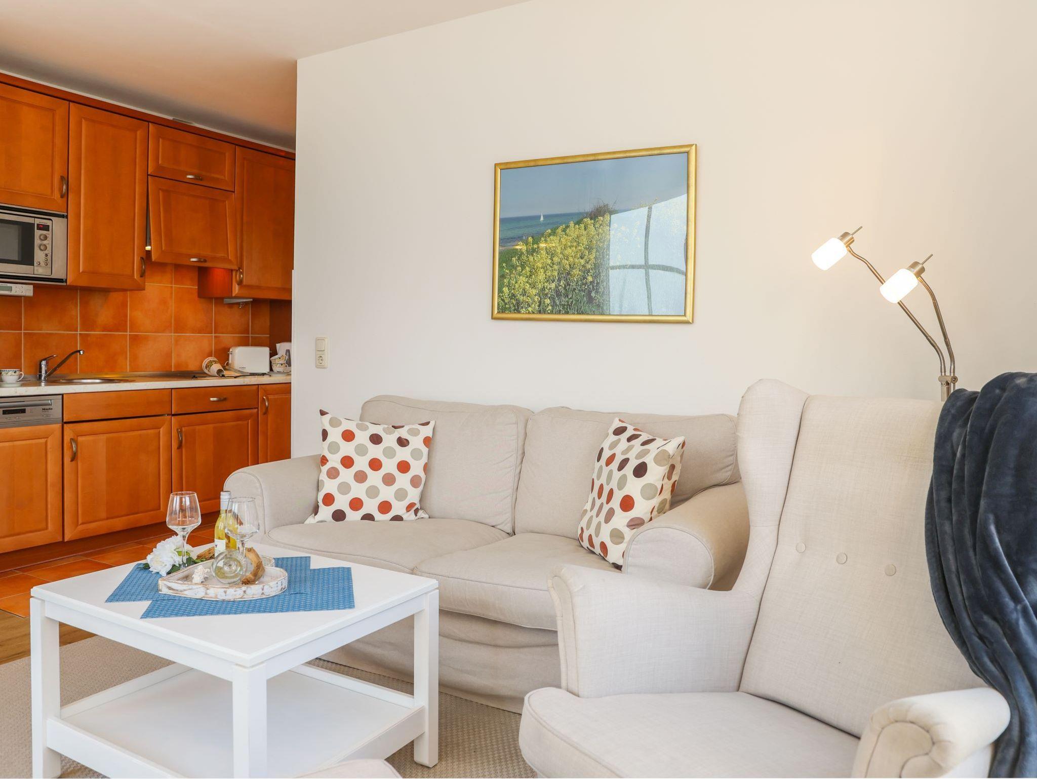 Nur 10 m vom Strand wohnen Sie in einer modern eingerichteten 3-Raum-Ferienwohnung. Die 60 qm große Wohnung liegt in der 4. Etage. Das Wohnzimmer ist mit einer Schlafcouch, Couchtisch, zwei Sessel, Anrichte, Kabel-TV, Radio, Essbereich (Esstisch und 4 Stühle) und Küchenzeile ausgestattet. Das französische Fenster bietet einen freien Blick auf die Ostsee. Im Schlafzimmer stehen ein Doppelbett und ein Kleiderschrank und im Gästezimmer ein Ausziehbares Bett und ein Wäscheschrank. Die Küchenzeile wurde modern ausgestattet mit Mikrowelle, Kühlschrank, Kaffeemaschine, Zweiplattenkochfeld, Geschirrspüler, Toaster und Wasserkocher. Das Bad mit Dusche/WC und der Flur mit Garderobe komplettieren die Wohnung.