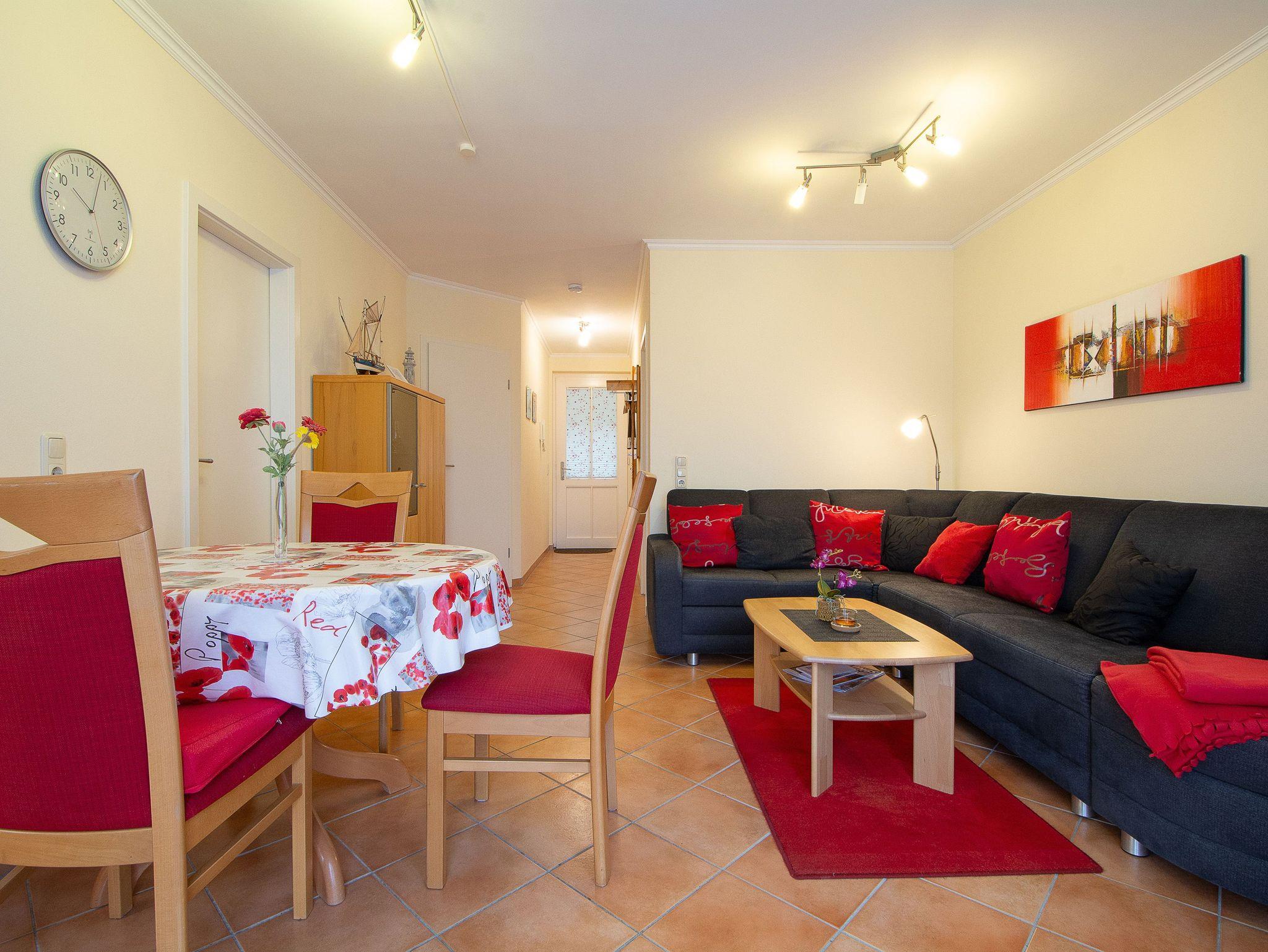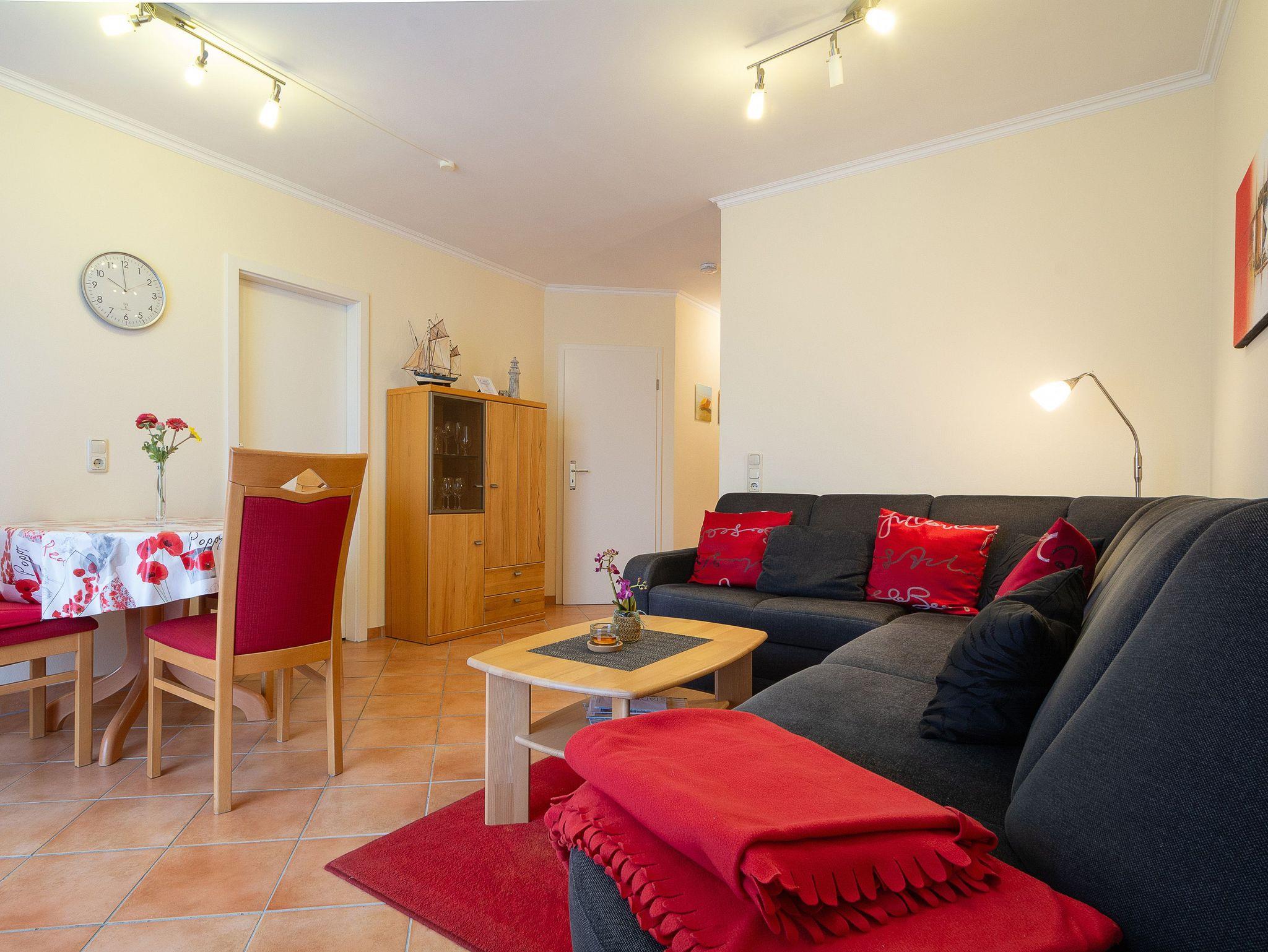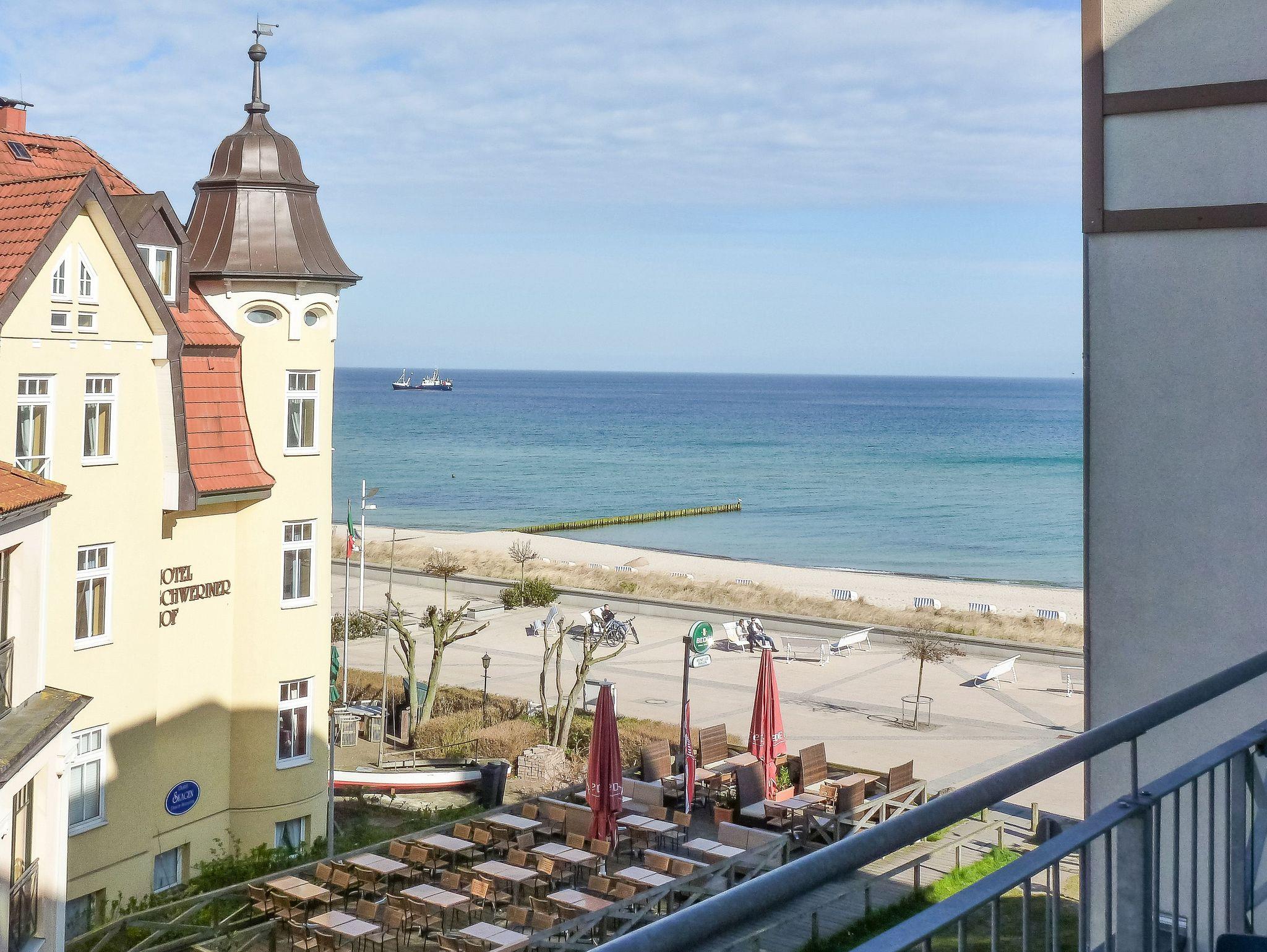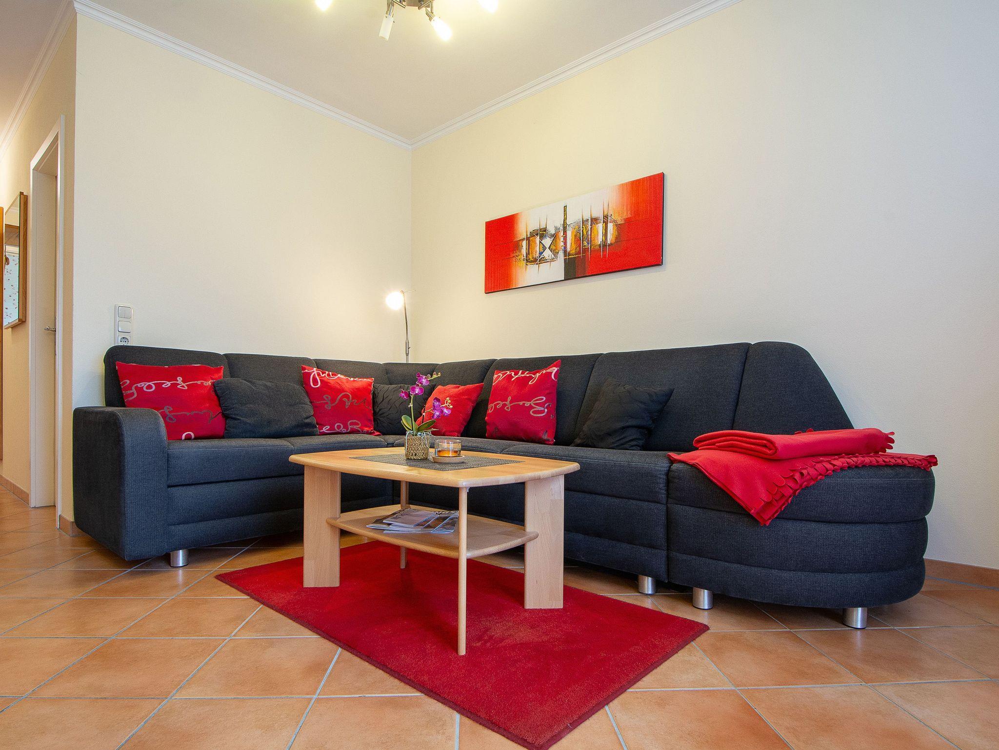 Herzlich Willkommen in unserer liebevoll eingerichteten Ferienwohnung Nr. 3.17 im Haus Meeresblick. Die gemütliche 3-Raum-Ferienwohnung von etwa 55qm Größe befindet sich auf der westlichen Seite des Hauses Meeresblick im dritten Obergeschoss und ist hervorragend für 2 bis 3 Personen geeignet. Die Wohnung bietet all jenen Komfort, den der anspruchsvolle Gast für seinen erholsamen Urlaub erwartet. Es begrüßt Sie ein freundlicher offener Wohn- und Essbereich mit großer und bequemer Couchecke sowie 94-cm LED-Fernseher mit Kabelempfang, Blu-Ray-Player und Kompaktmusikanlage. Über den USB-Anschluss können Sie Ihre Lieblingsmusik von zuhause auch im Urlaub genießen. Die offene Küchenzeile ist mit allen wichtigen Küchengeräten ausgestattet, die Sie für Ihr „perfektes Dinner“ benötigen: Geschirrspüler, Kühlschrank mit Eisfach, 4 Platten-Kochfeld, Mikrowelle, Kaffeemaschine, Toaster, Wasserkocher sowie reichlich Geschirr, Gläser, Besteck und Kochutensilien sind vorhanden. Vom Wohnbereich betreten Sie den möblierten West-Balkon mit herrlichem seitlichen Ausblick über die Strandpromenade auf die Ostsee. Von hier können Sie in der Abendsonne den Tag ausklingen lassen. Im zum bepflanzten Atrium des Hauses ausgerichteten Schlafzimmer befinden sich ein Doppelbett in massiver Kernbuche sowie mit Komforthöhe, 180 x 200 cm Liegefläche und 7-Zonen-Taschen-Federkernmatratzen und ein Kleiderschrank. Das zweite kleine Schlafzimmer hat ebenfalls ein Fenster zum begrünten Atrium und bietet ein zusätzliches Einzelbett für eine weitere Schlafgelegenheit. Das Duschbad ist funktionell eingerichtet u.a. mit Dusche, Waschbecken und großem Spiegel.