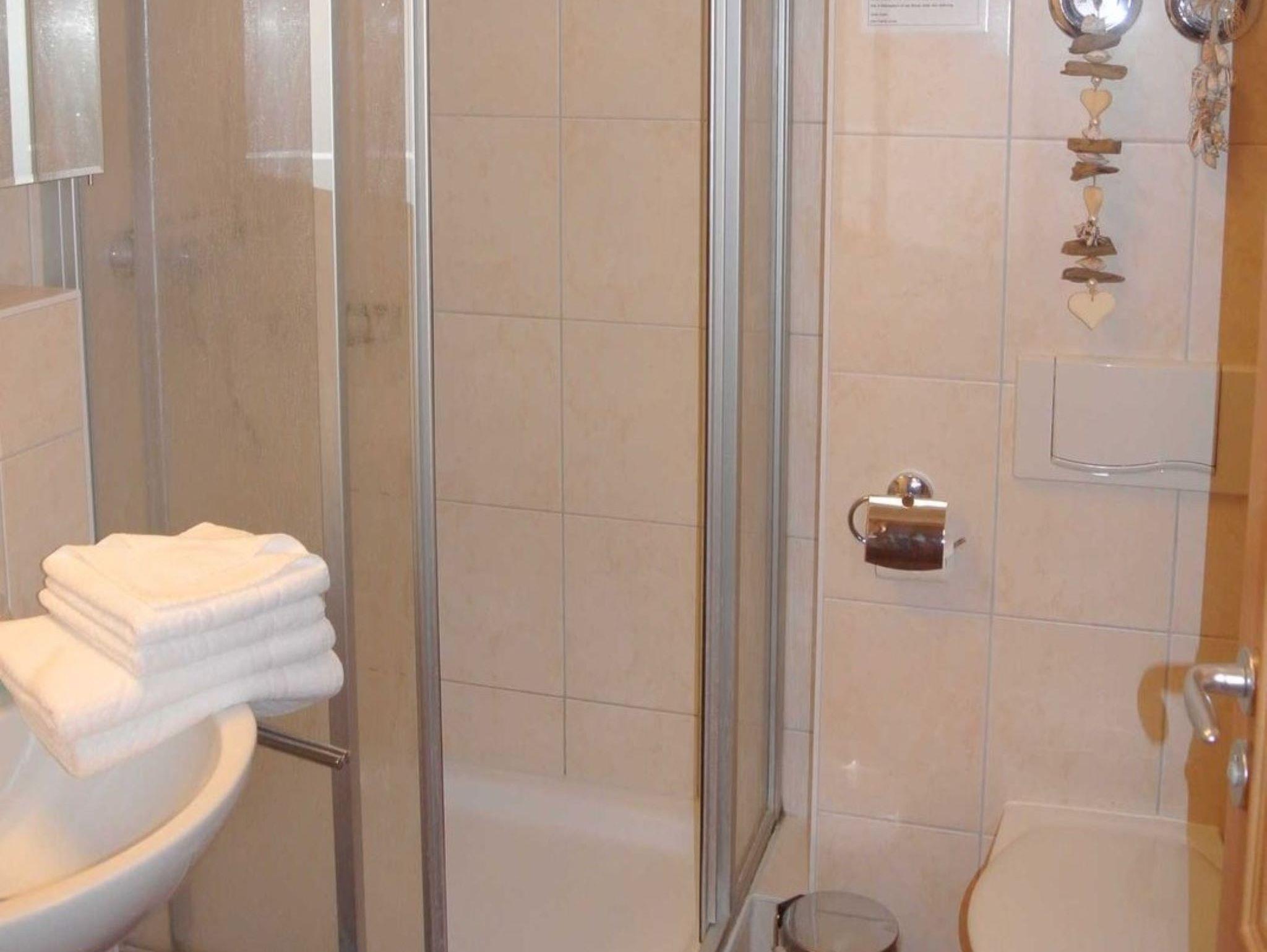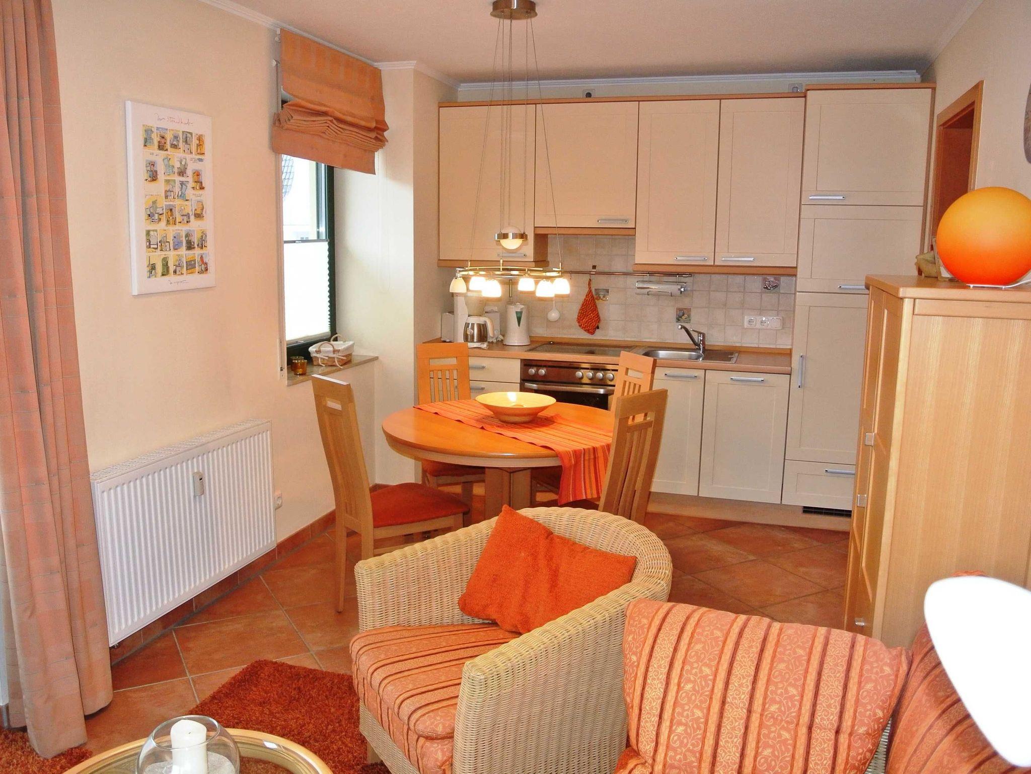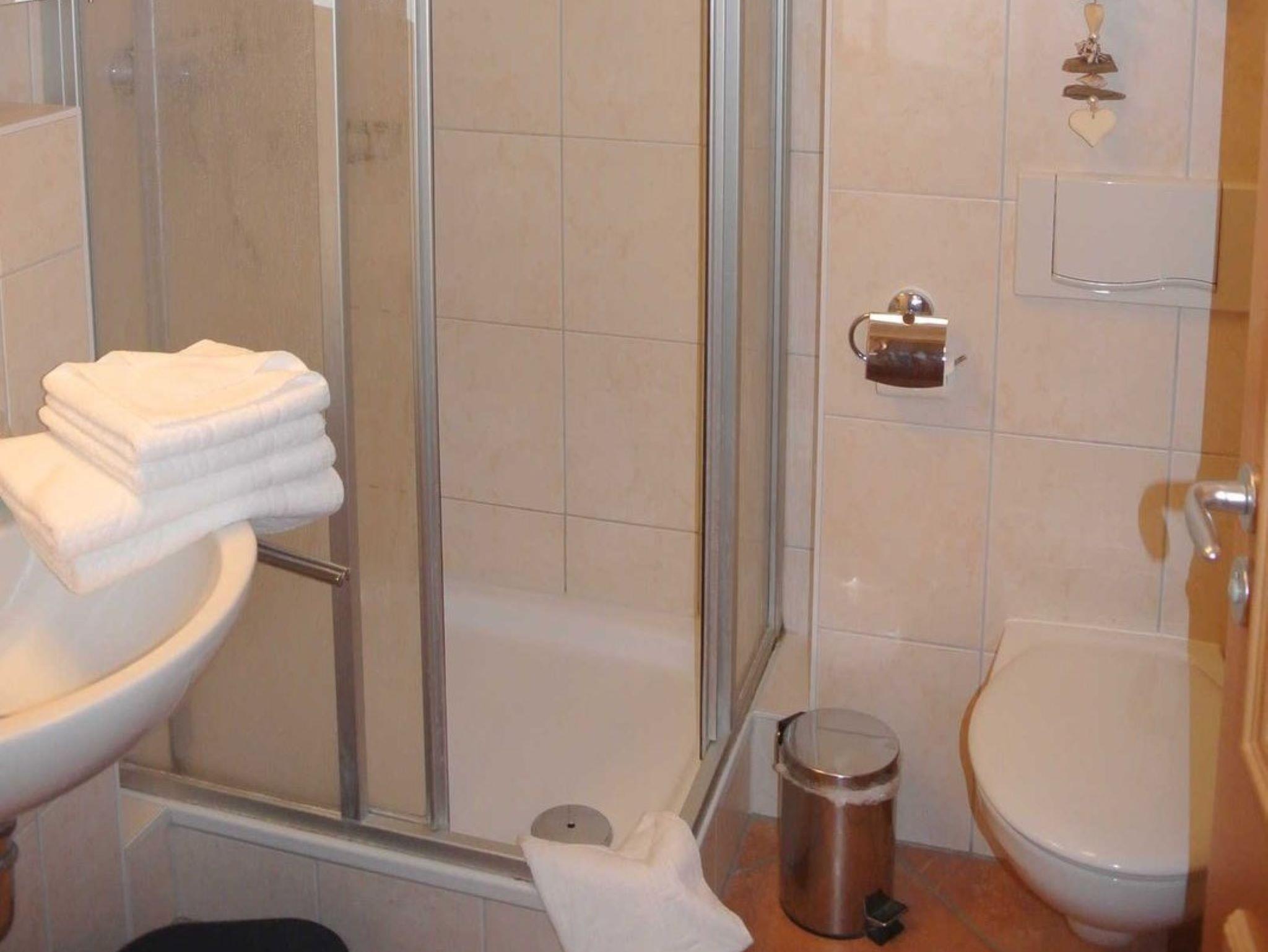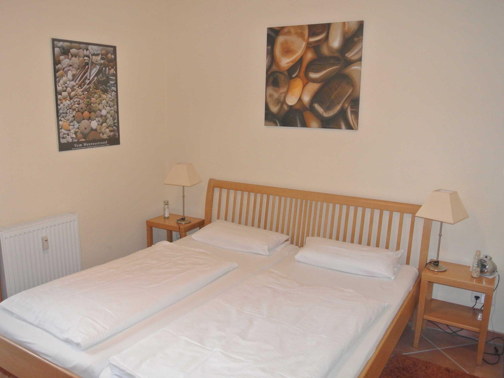 Die Nichtraucher-Wohnung Nr. 12 (2. OG) hat ca. 52 qm und bietet Platz für bis zu 4 Personen. Sie hat zwei Balkone zur Ost- und Südseite. Auf beiden Balkonen stehen Balkonmöbeln. In der vollausgestatteten Küchenzeile finden Sie Geschirrspüler, Mikrowelle, Backofen mit 4-Platten-Ceranfeld, Kaffeemaschine, Wasserkocher, Kühlschrank und reichlich Geschirr. Das Wohnzimmer hat ein Sofa, Kabel-TV, DVD-HiFi-Player/Anlage und ein Sideboard mit Spielen und Büchern. Ein Tisch mit 4 Stühlen lädt zum gemütlichen Essen oder Kartenspielen ein. Das Schlafzimmer ist mit einem Doppelbett, Nachtkonsolen und Kleiderschrank ausgestattet und im Gästezimmer stehen zwei Betten, eine Kommode und ein weiterer Fernseher. Die Fenster sind bequem mit Rollos zu verdunkeln. Das Duschbad mit WC hat einen großen beleuchteten Spiegelschrank und ein Handtuchheizkörper.