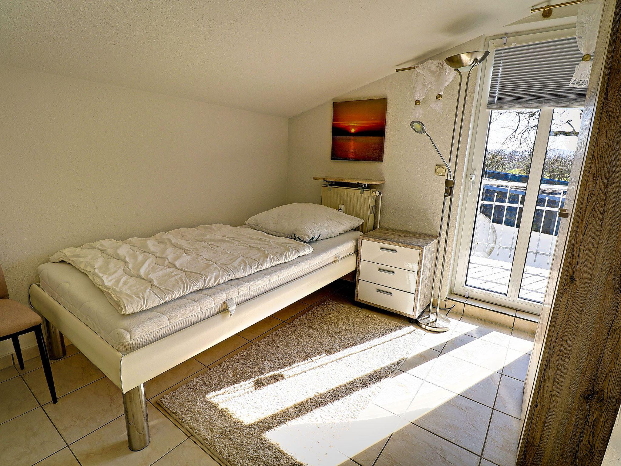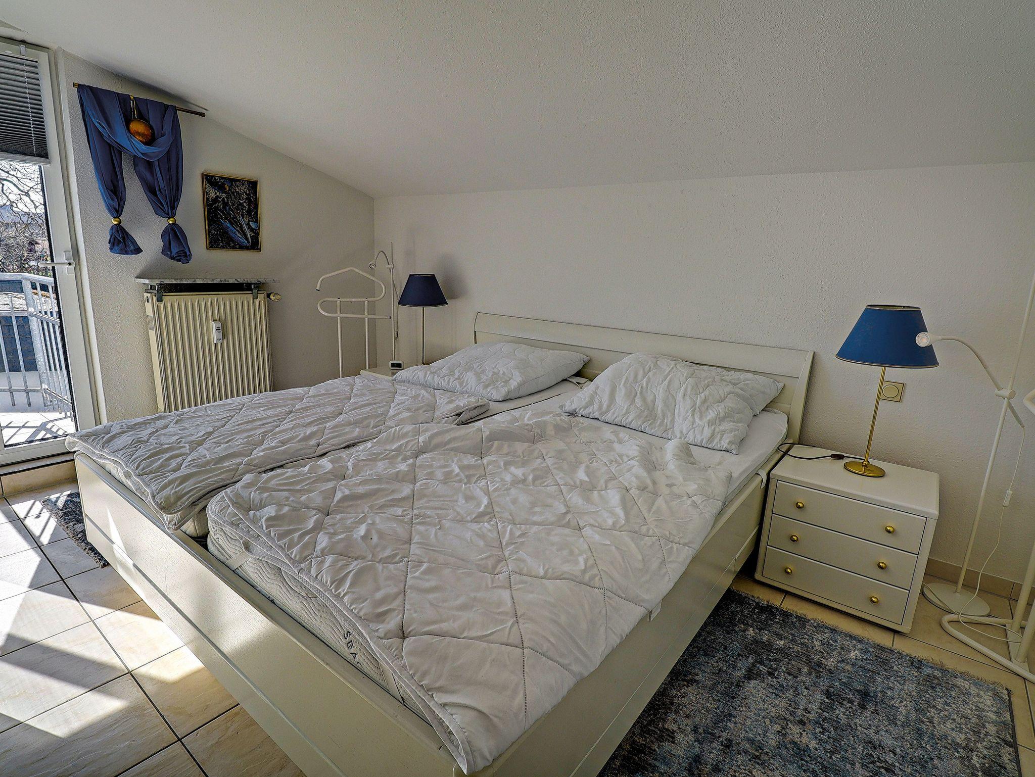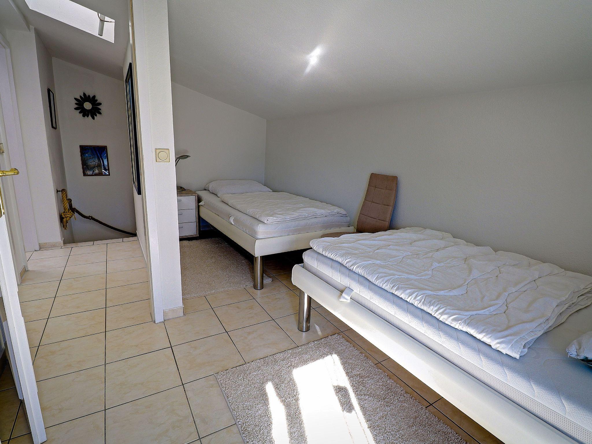 65 m² große 3-Raumwohnung über 2 Etagen. Das Schlafzimmer mit Doppelbett und ein Kinderzimmer mit zwei Einzelbetten sowie das Badezimmer befinden sich im Obergeschoss. Von den Schlafzimmern ausgehend befindet sich ein Balkon.