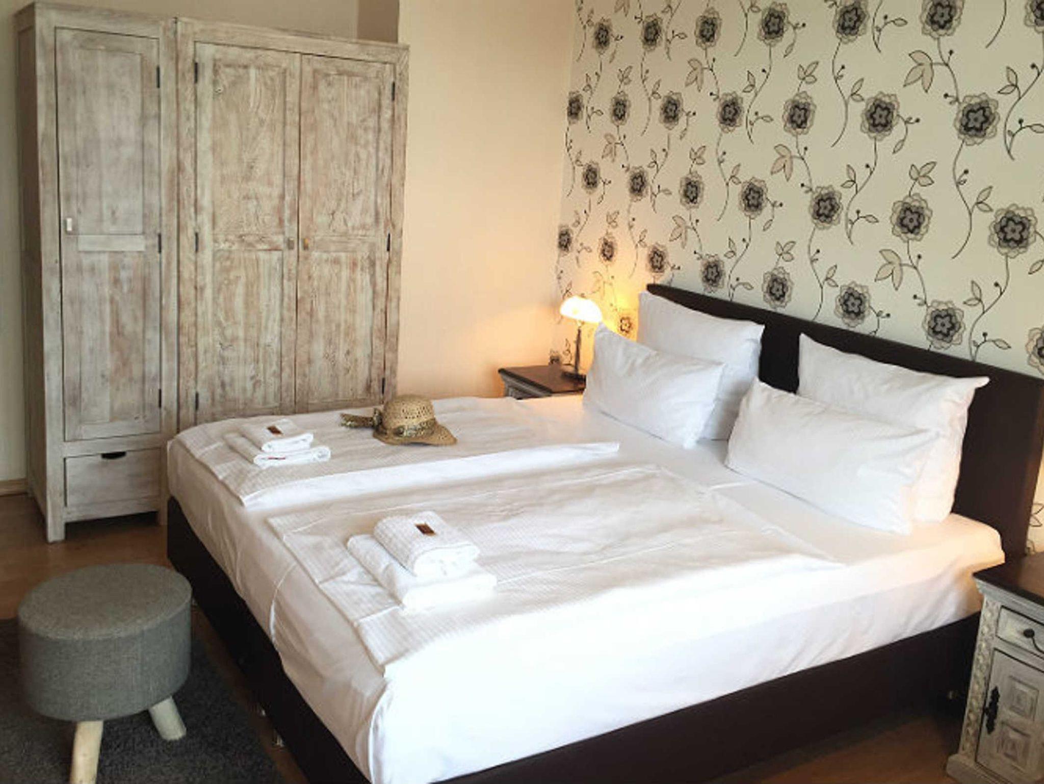 Das 1,80 Meter breite Doppelbett und ein Kleiderschrank komplettieren die Einrichtung.