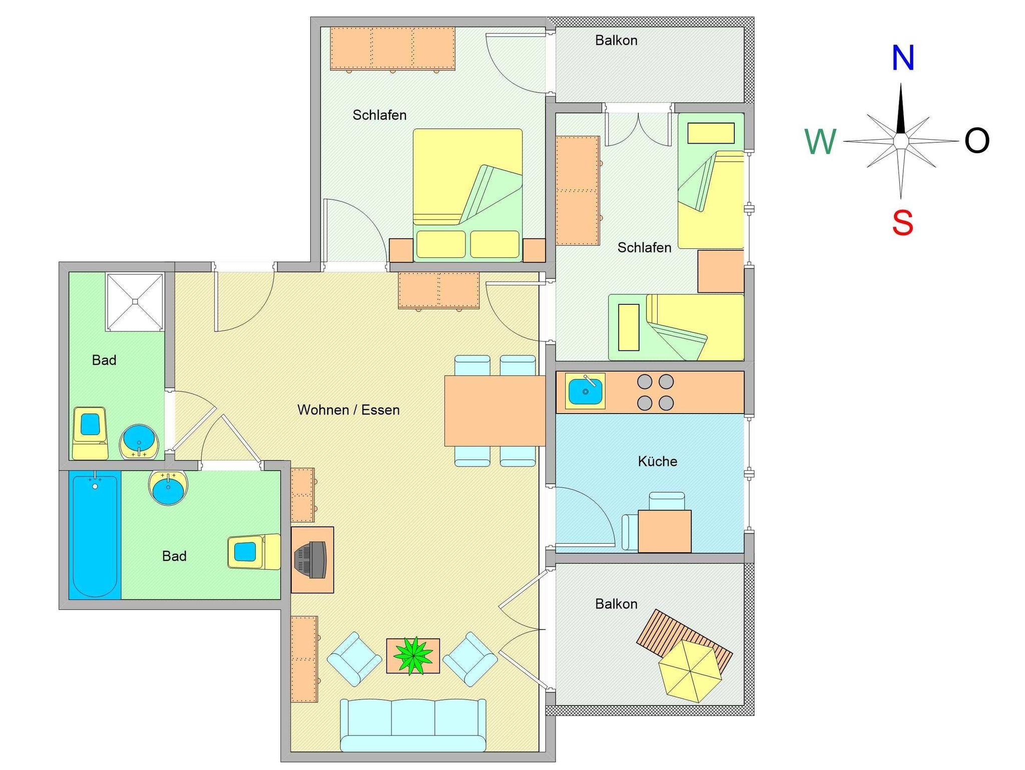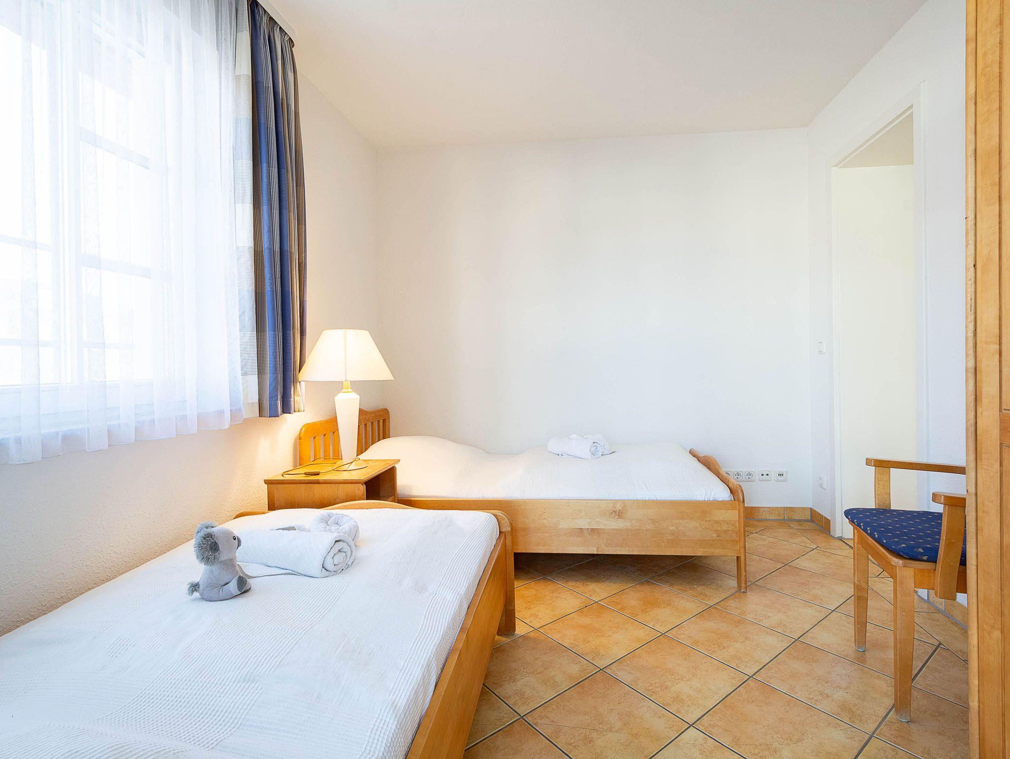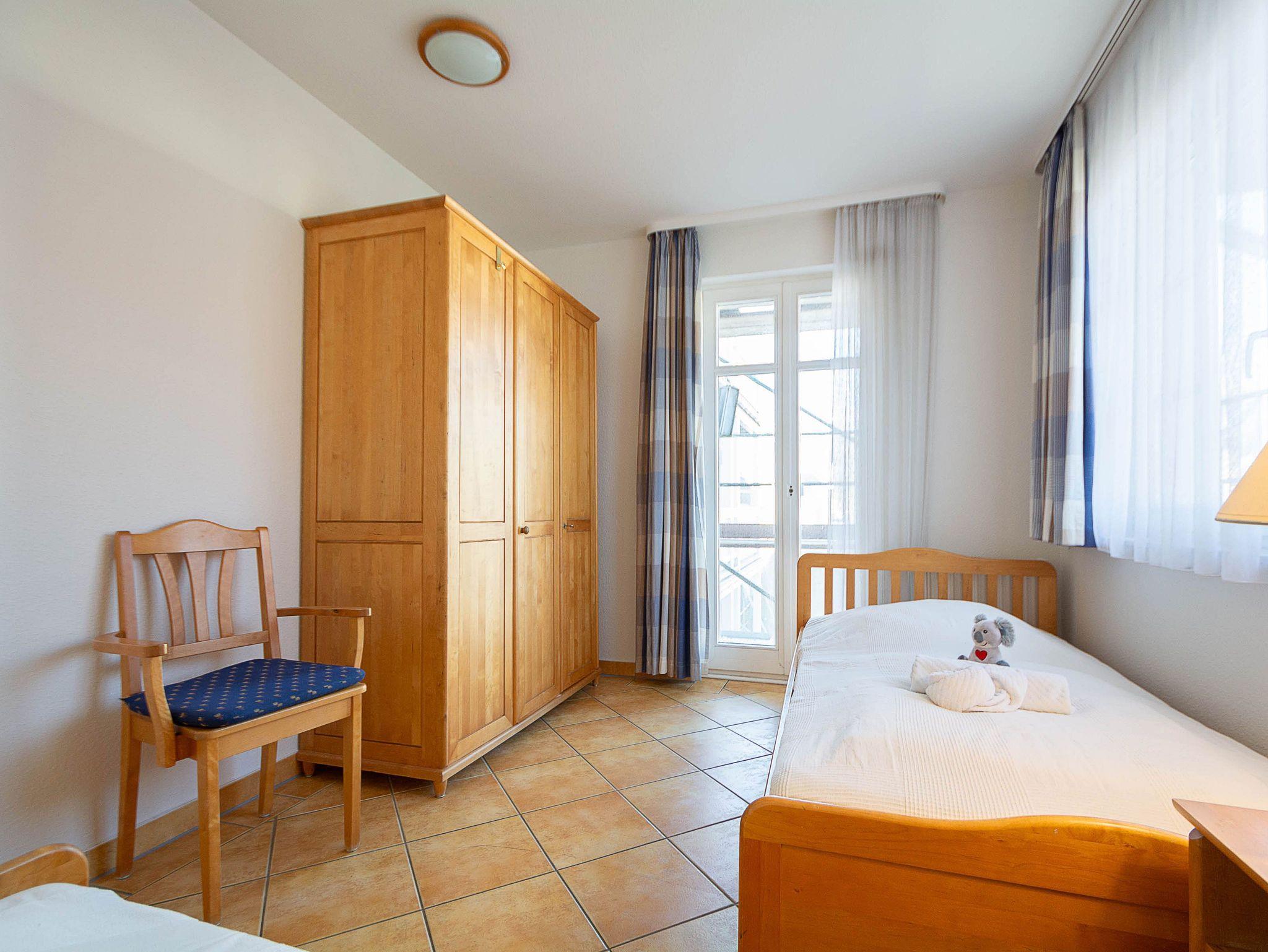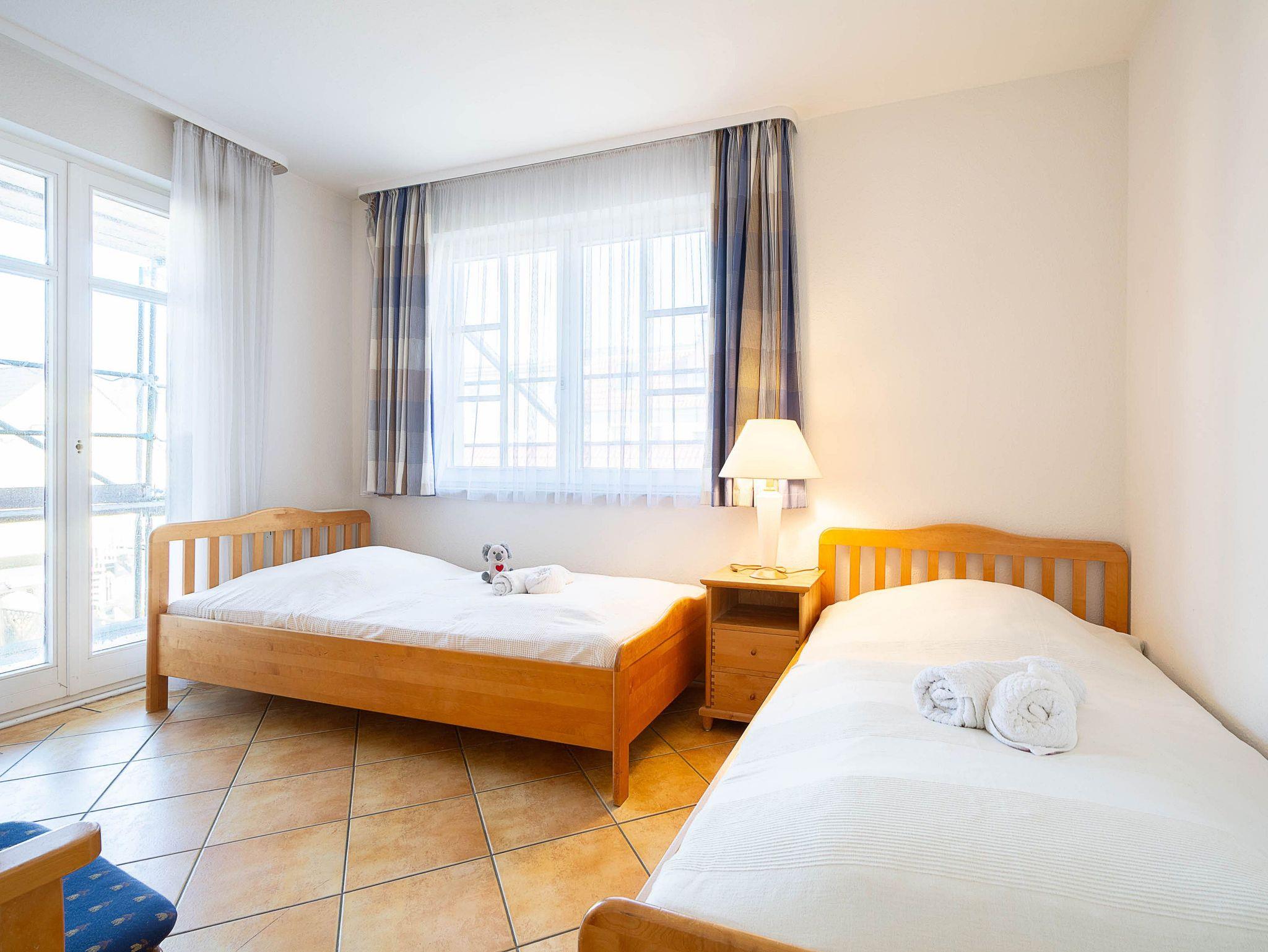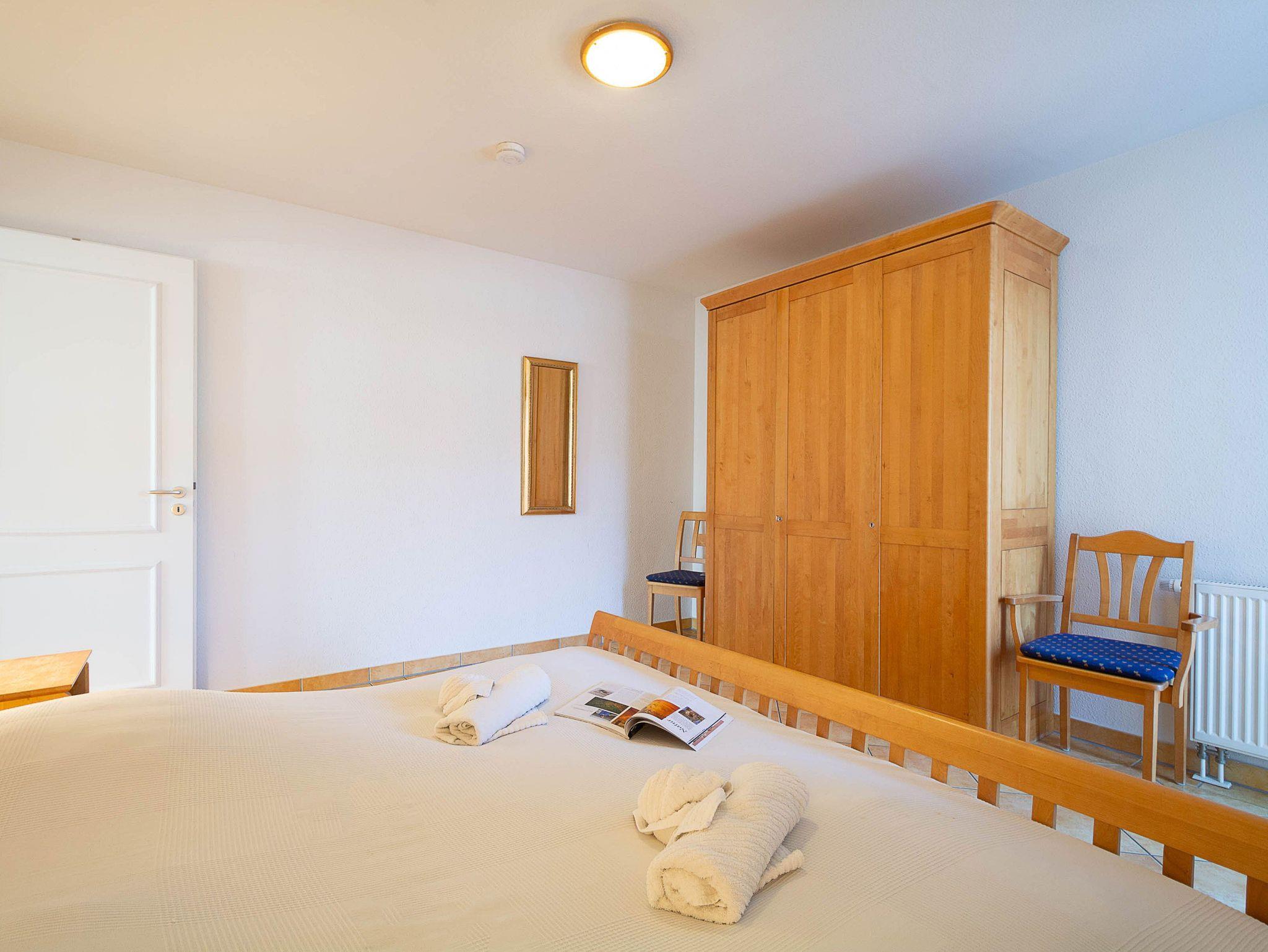 Die Wohnung verfügt über 2 Schlafzimmer. Das erste Schlafzimmer ist ausgestattet mit einem Doppelbett (200 cm x 200 cm) und einen geräumigen Kleiderschrank. IM zweiten Schafzimmer befinden sich zwei getrennt stehende Einzelbetten (je 100 cm x 200 cm) sowie ein kleiner Kleiderschrank. Einen weiteren, nach Norden ausgerichteten kleinen Balkon, können Sie von beiden Schlafzimmern erreichen.