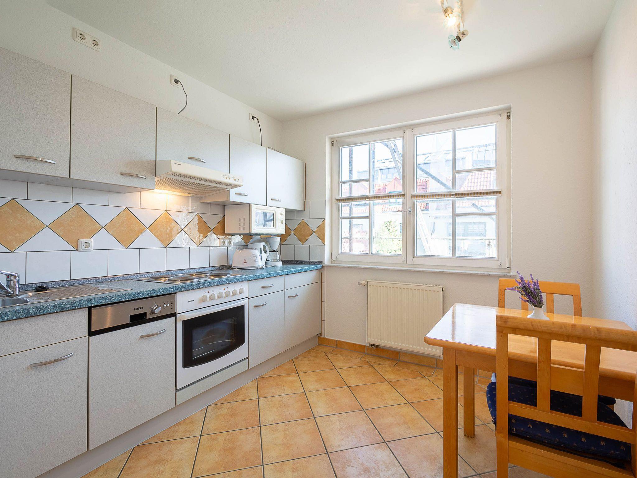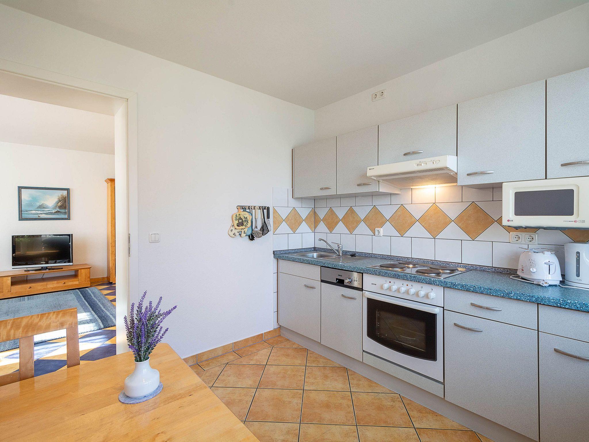 Ebenfalls vom Wohnbereich gelangen Sie in die separate Küche, die mit allen wichtigen Küchengeräten und -utensilien eingerichtet ist, die sie für Ihr perfektes Dinner benötigen. Ein 4-Zonen-Ceranfeld mit Backofen und Dunstabzug, eine Mikrowelle, ein Geschirrspüler sowie ein Kühlschrank mit Gefrierfach befinden sich in der Küche. Eine Kaffeemaschine, ein Wasserkocher, ein Toaster sowie ein Esstisch vervollständigen die Kücheneinrichtung.