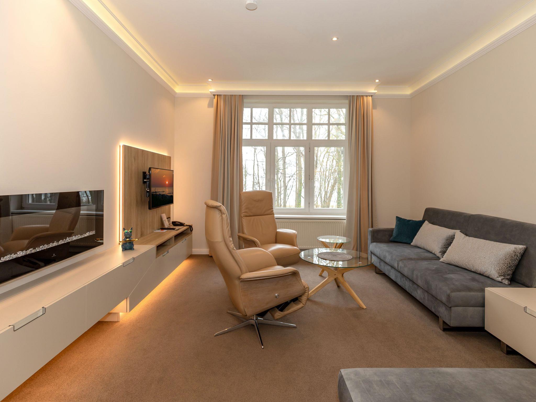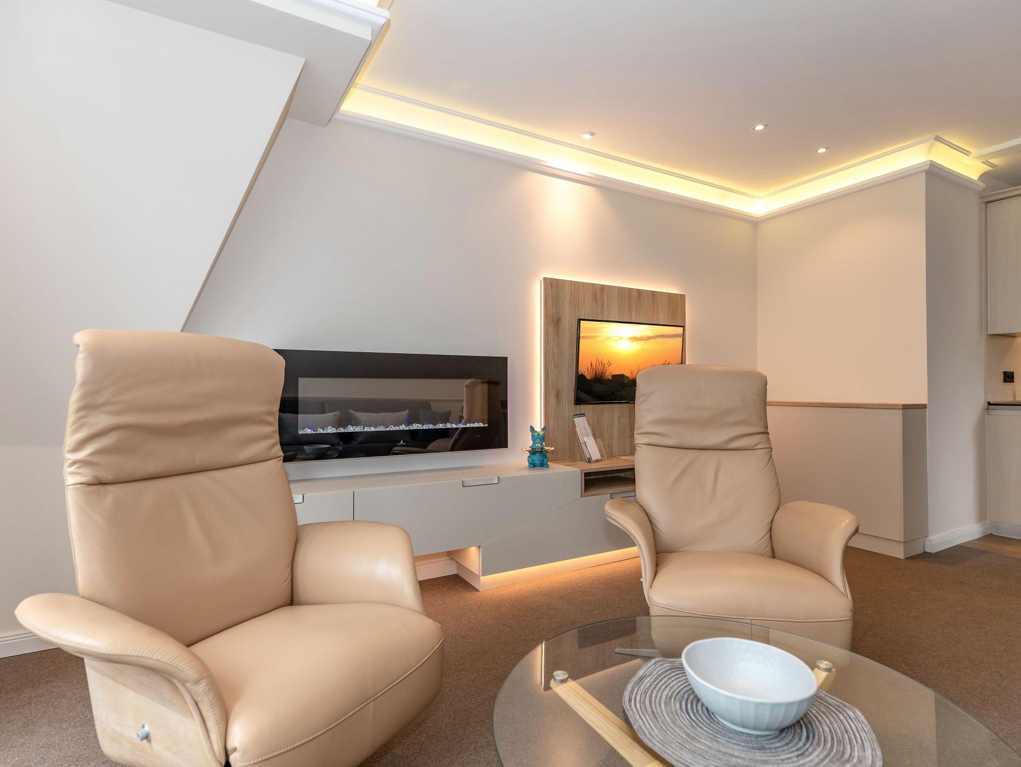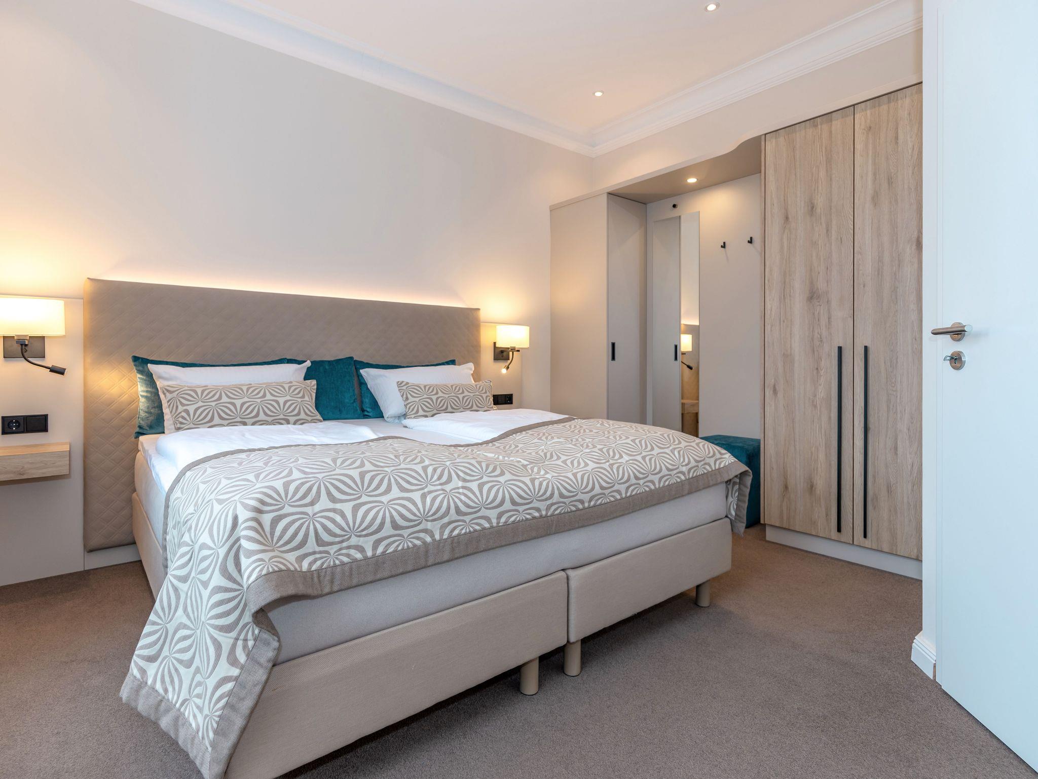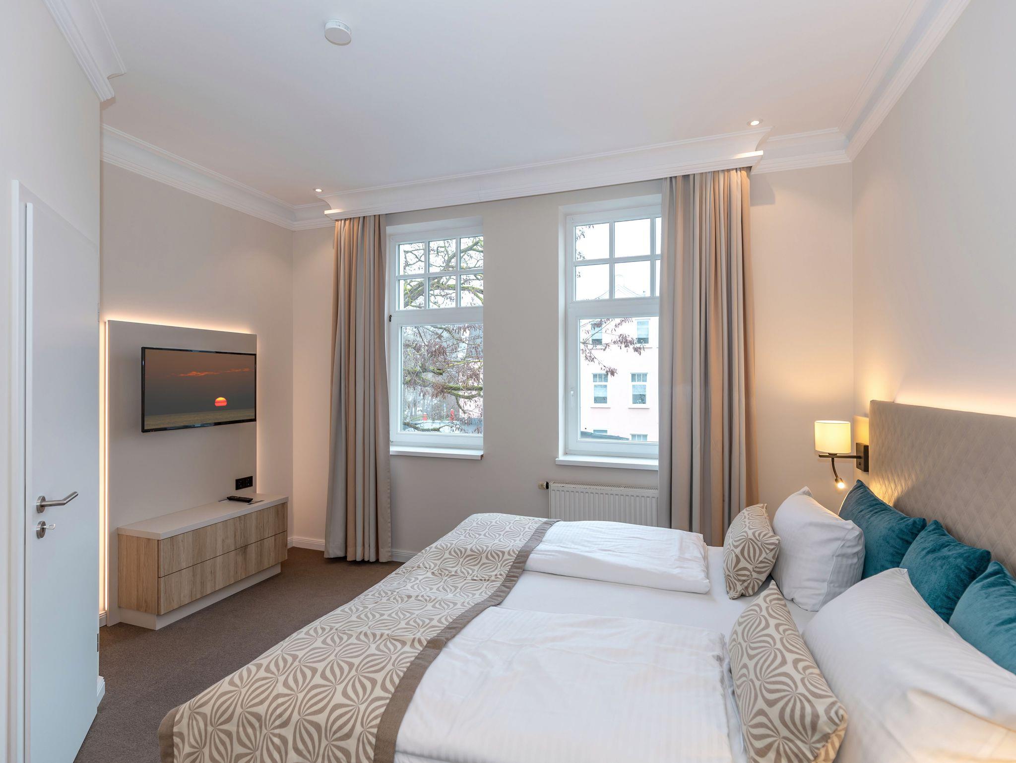 Unsere 16 liebevoll ausgestatteten 1 und 2-Raumappartments bieten exklusiven Schlafkomfort und viel Raum zum Wohnen. Hier finden Sie alle Annehmlichkeiten eines Hotels: tägliche Reinigung, Frühstück im Hotel am Strand und zusätzlich eine Küchenzeile mit Esstisch. Große TV Flachbildschirme im Wohn- und Schlafzimmer, persönlicher Safe, Telefon und kostenfreies WLAN sind in jedem Appartement vorhanden. Teilweise Balkon oder Terrasse. Bitte beachten Sie, dass die Appartements sich im Nebengebäude, 50 Meter vom Haupthaus entfernt, befinden.
