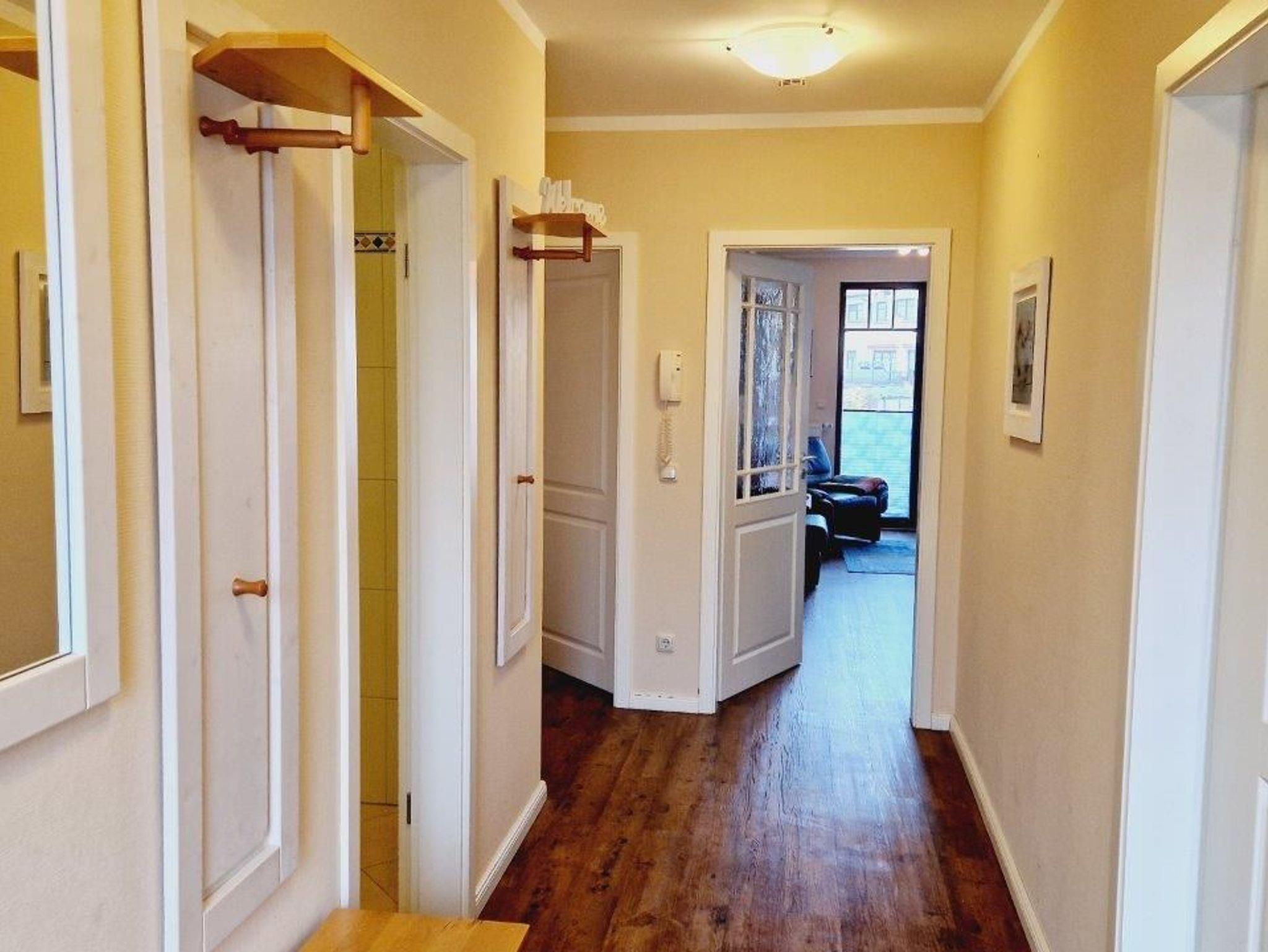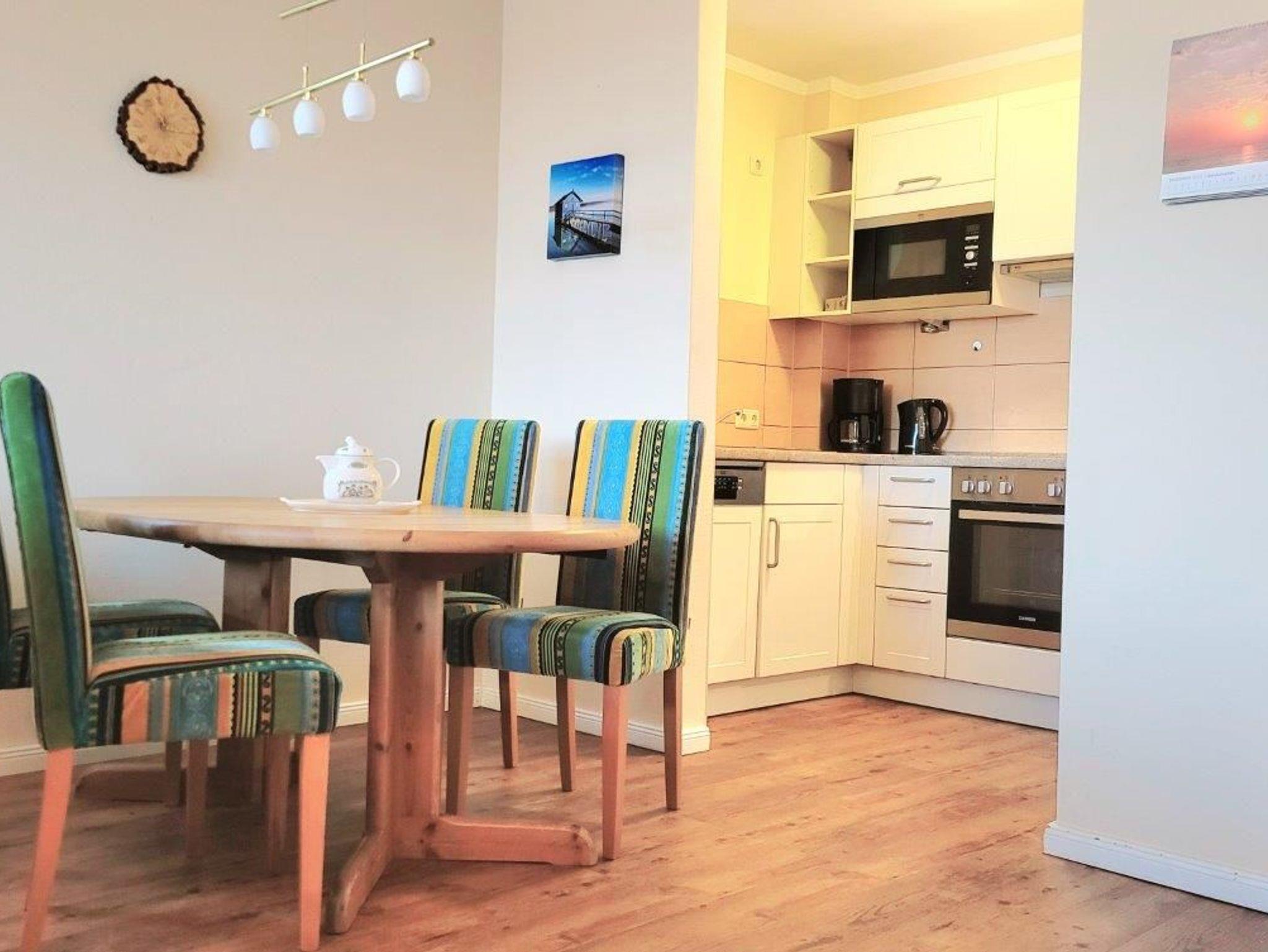 - in der Parterre/Aufzug - möblierte Terrasse zur Meerseite - Autostellplatz Nr. 1.9 - Tiefgarage (Einfahrtshöhe 2,00 m) - Fahrradkeller - Sauna inkl., Waschmaschine u. Trockner gegen Gebühr - Nichtraucherappartement! Keine Haustiere! - WLAN-Bereitstellung kostenfrei (ohne Gewähr) - Wohnbereich mit integrierter Küche und Essplatz - Küchenzeile - Herd mit Backröhre, Mikrowelle, Kühlschrank mit Gefriermöglichkeit und Geschirrspüler - 1. Schlafzimmer mit Doppelbett, Kleiderschrank und TV - 2. Schlafzimmer mit Doppelbett und Kleiderschrank - DU/WC (separat)