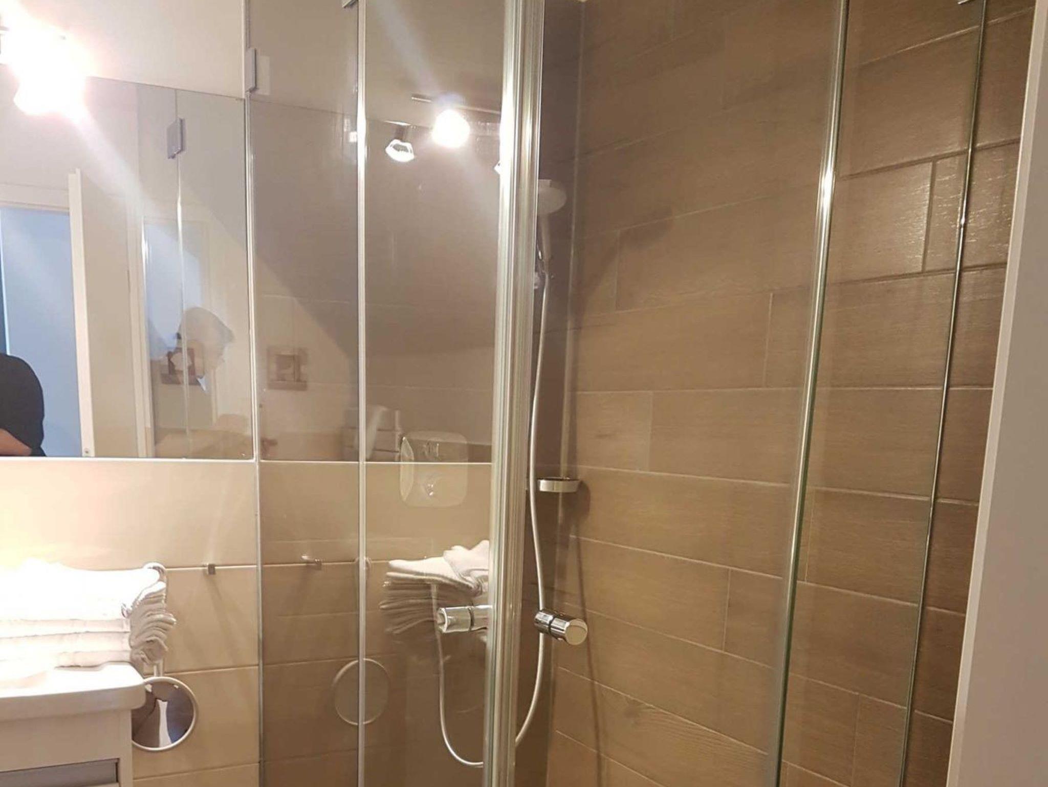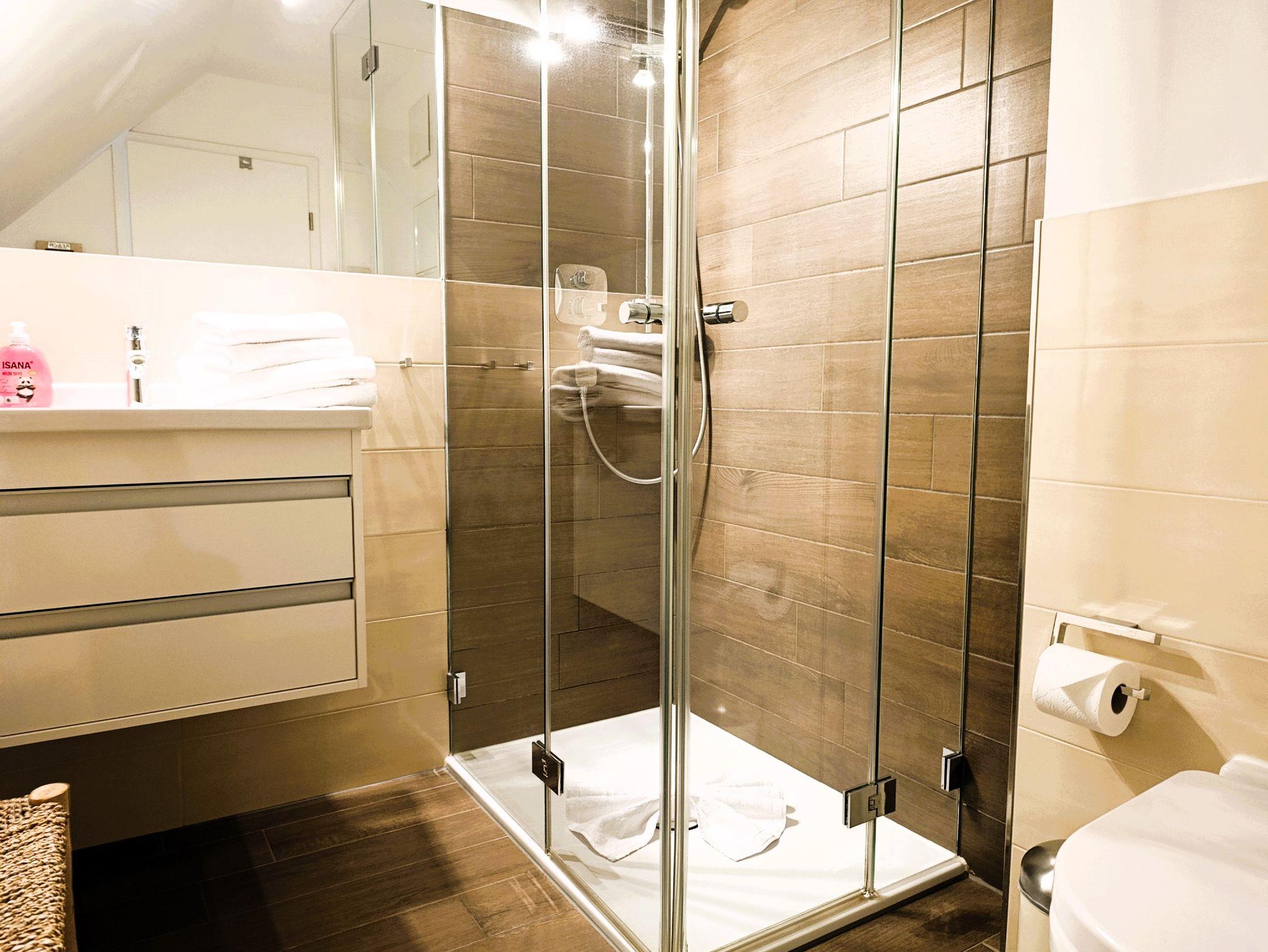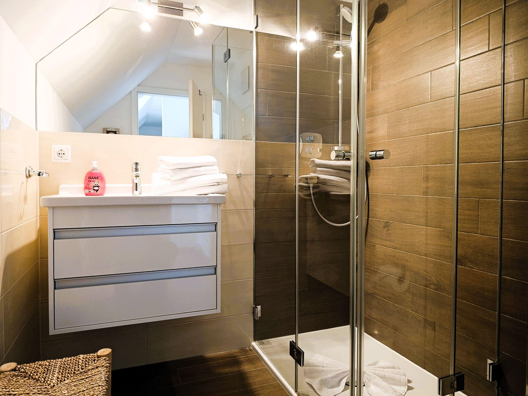 Bad mit ebenerdiger Dusche, WC, Waschbecken, Fön, Spiegel.
