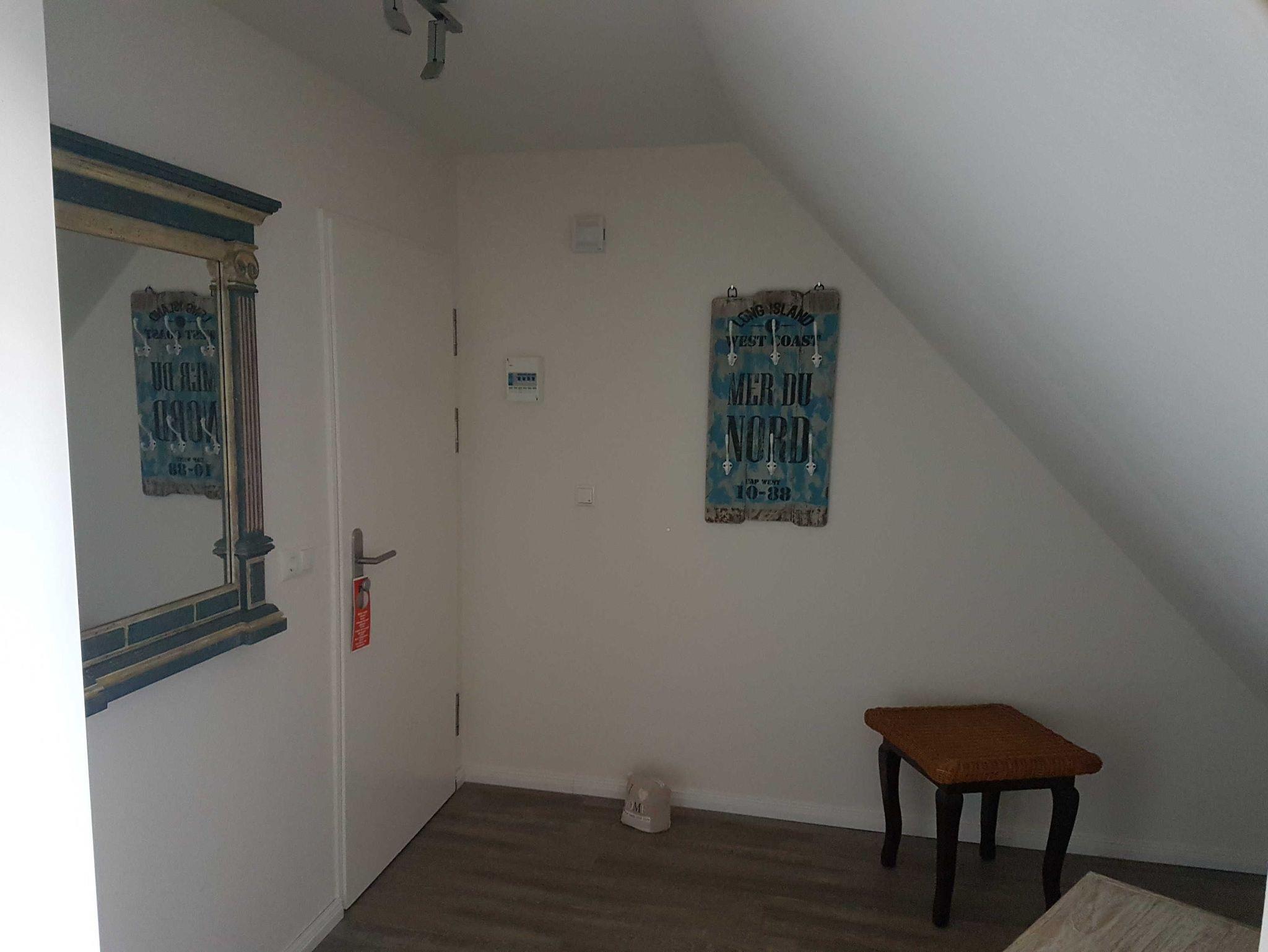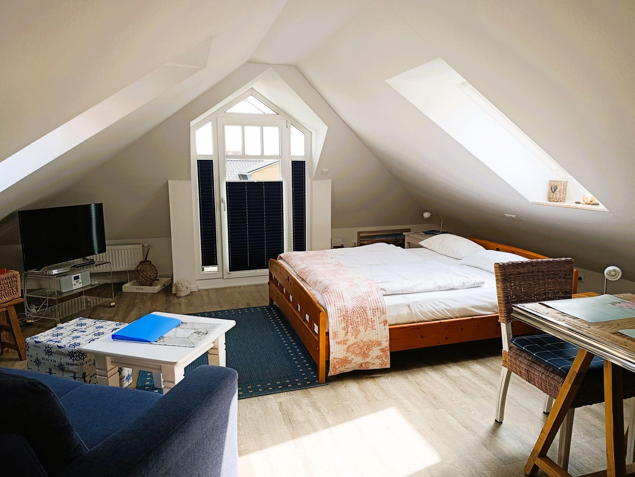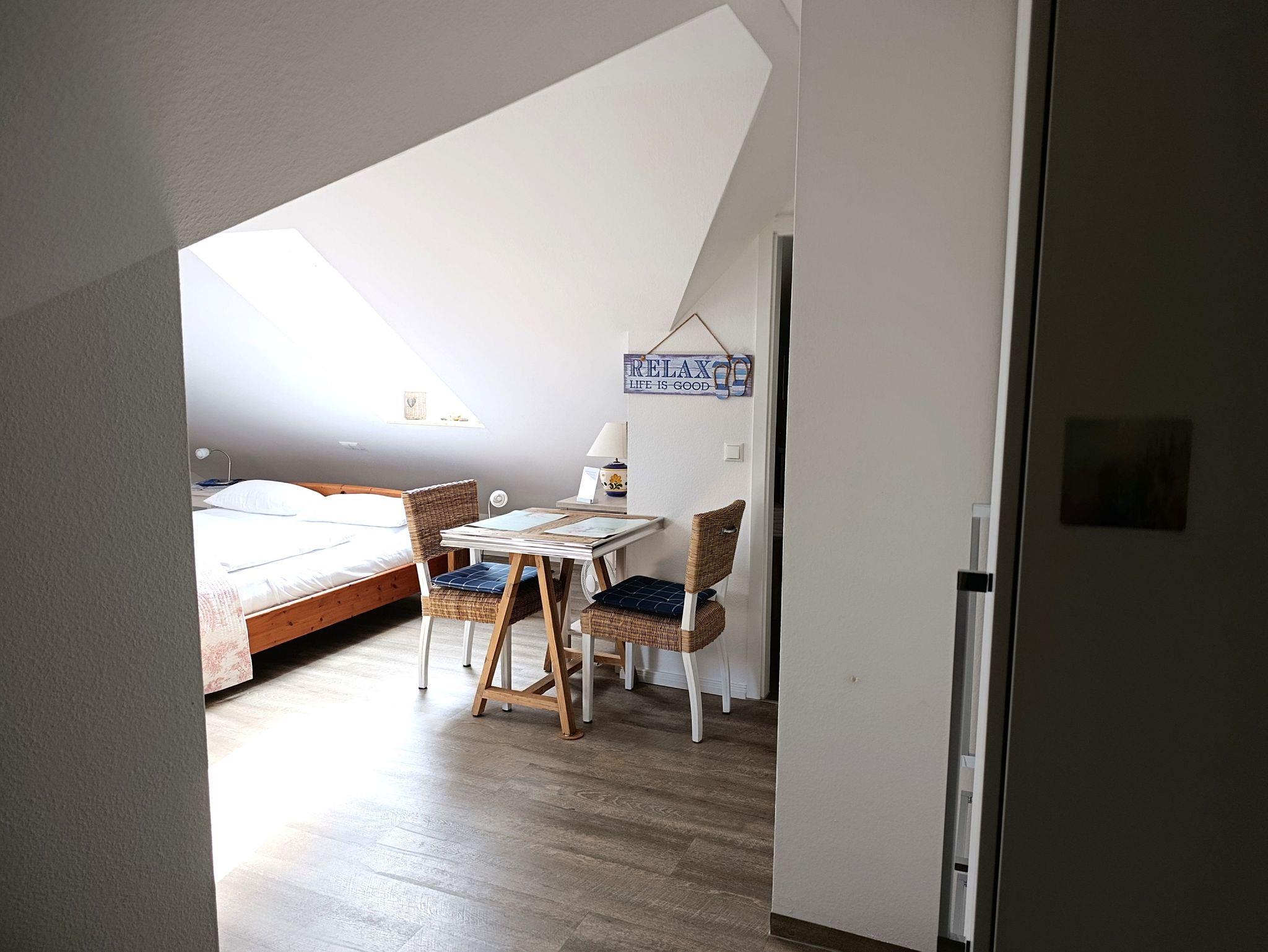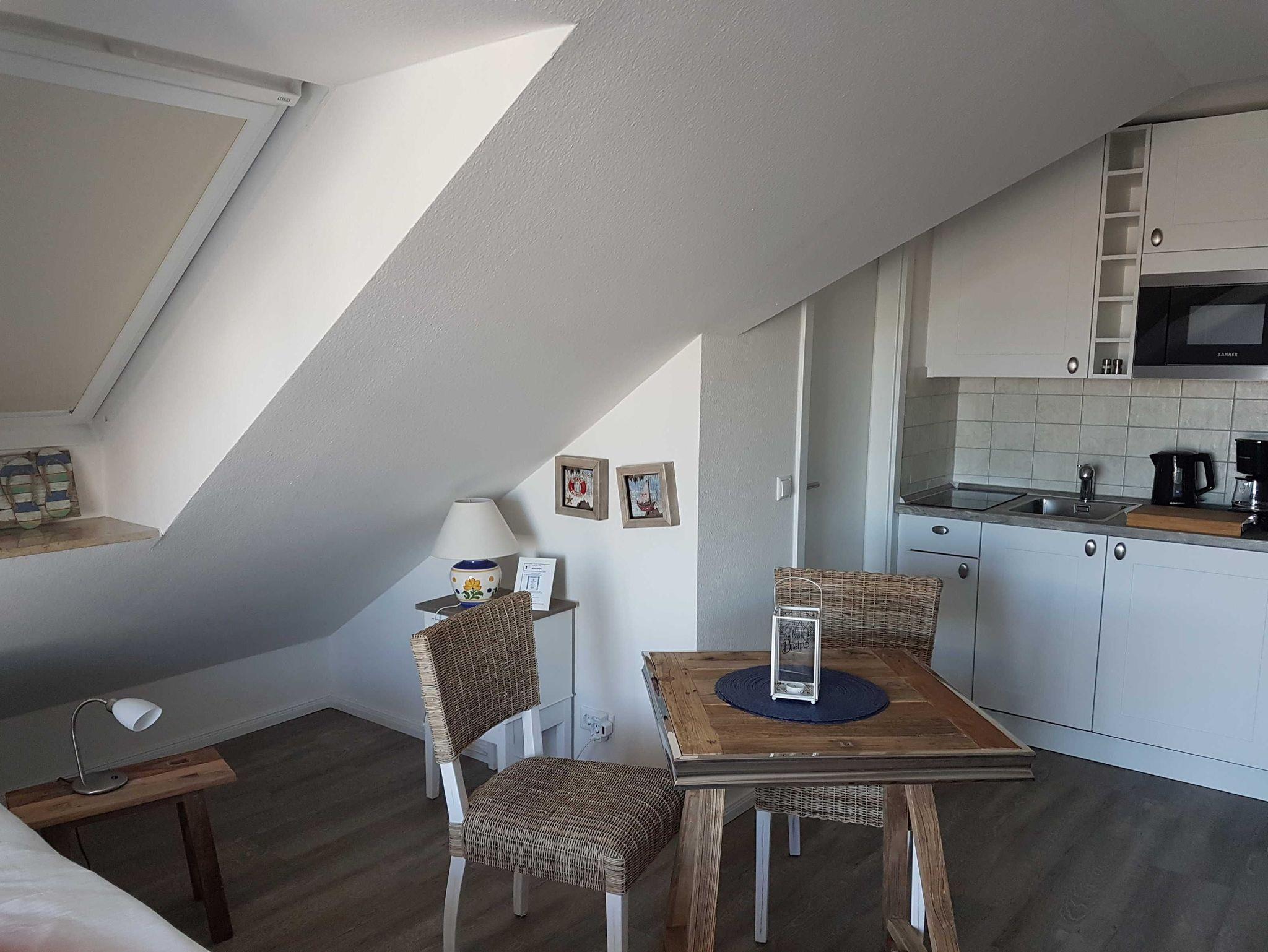 Das funktional gestaltete Ferienwohnung in der 3. Etage hat einen offenen Schlaf-/Wohnbereich, Wohnbereich mit Küchenzeile und Essbereich und einen Balkon. Im Schlafbereich steht ein Doppelbett. Die moderne und praktische Küchenzeile ist mit 2-Platten-Ceranfeld, Kühlschrank mit Gefrierfach, Mikrowelle, Kaffeemaschine und div. Geschirr ausgestattet. Ein Bad mit ebenerdiger Dusche, Waschbecken und WC komplettieren den guten Gesamteindruck der Ferienwohnung.