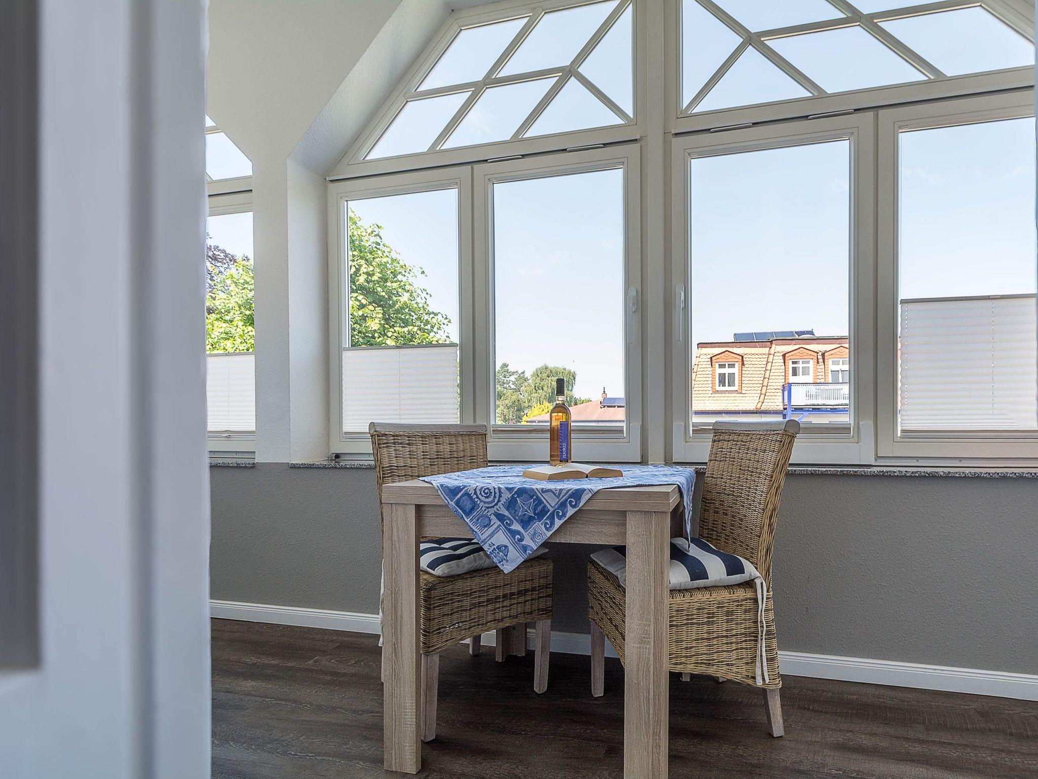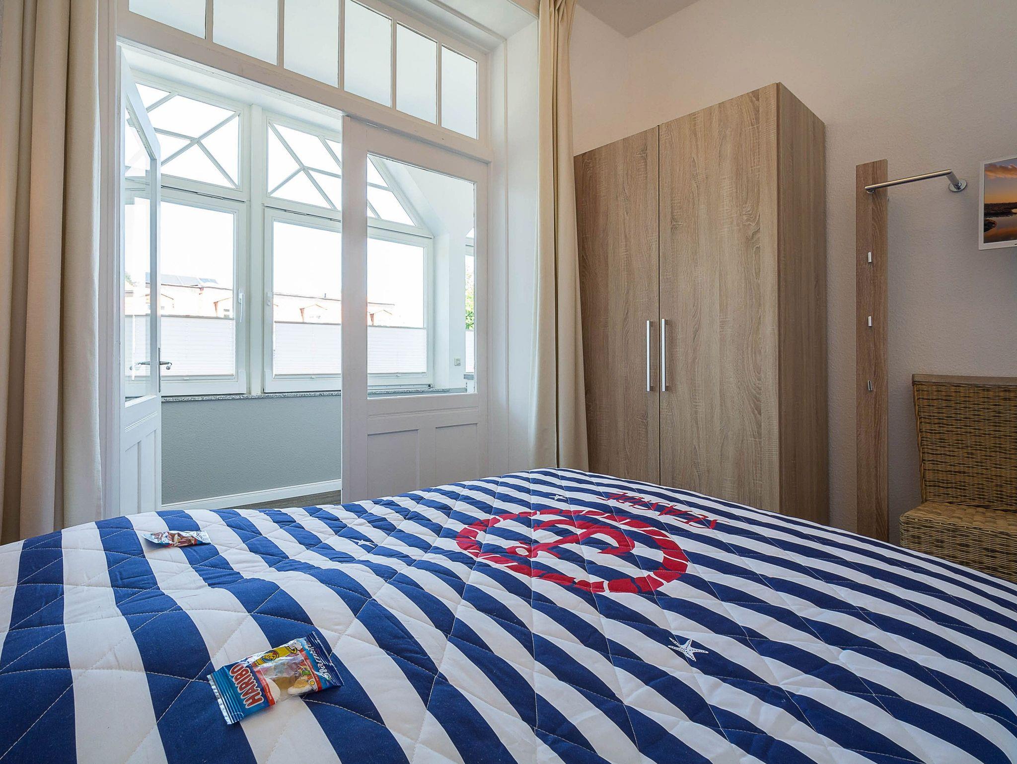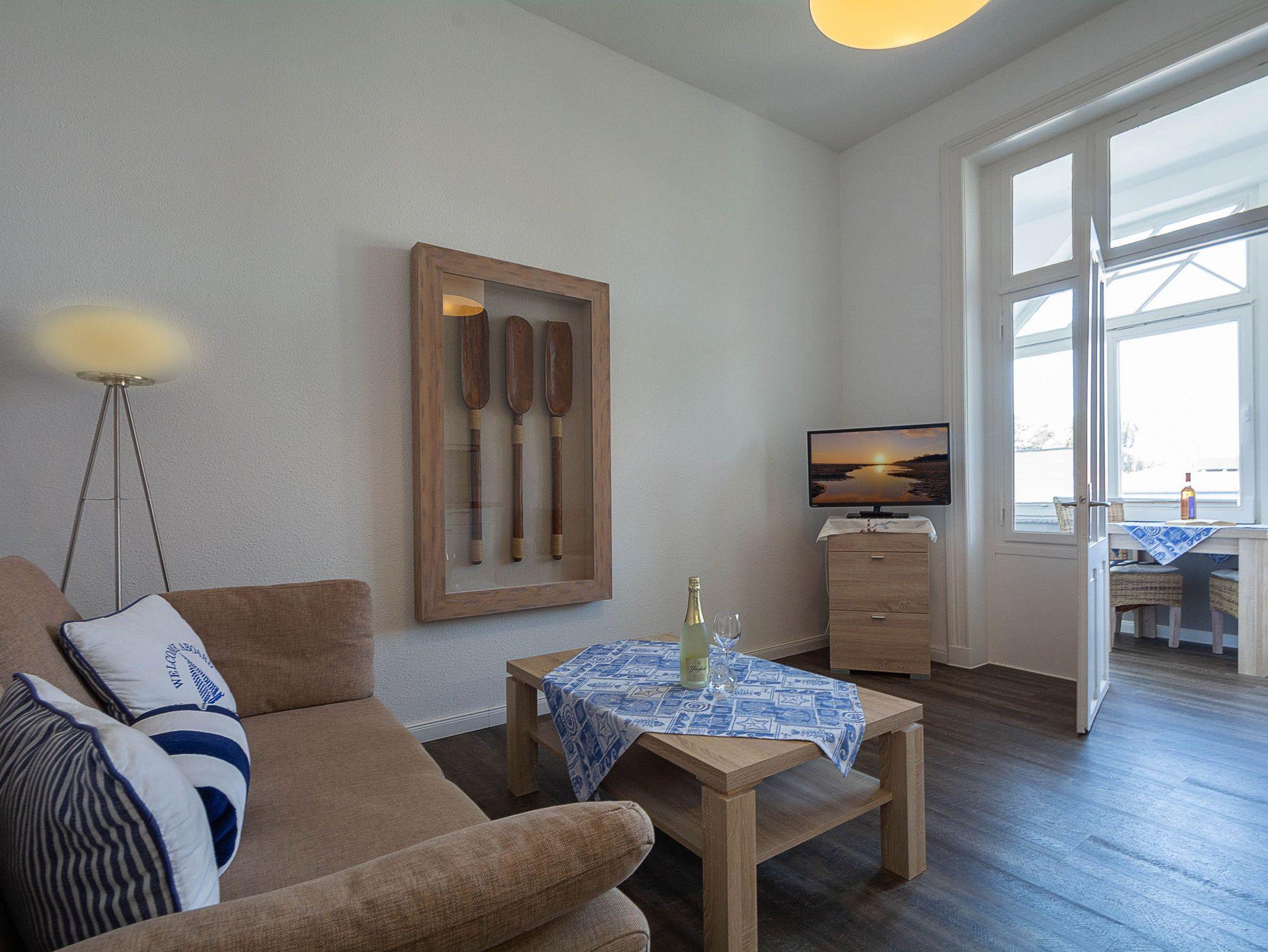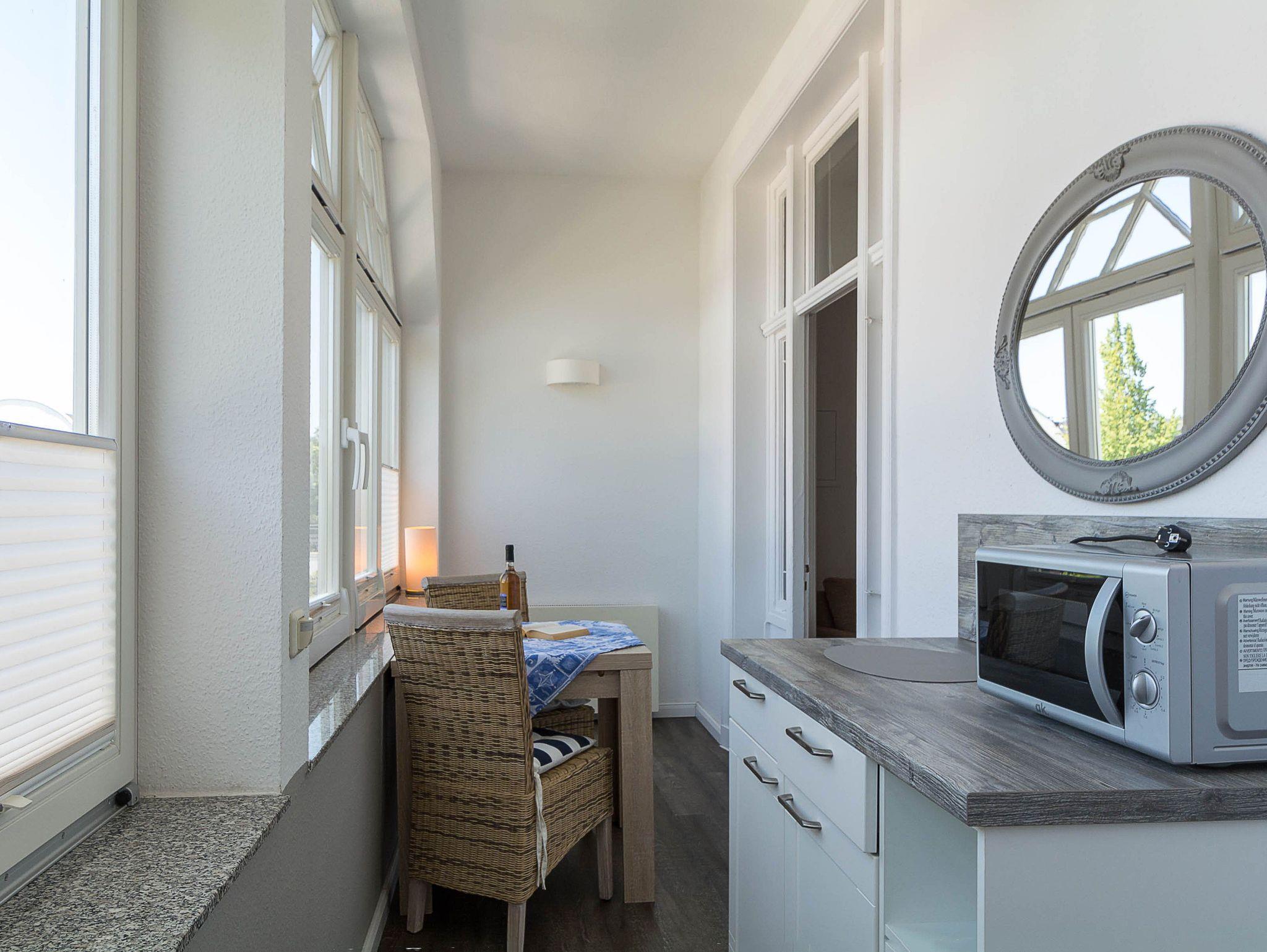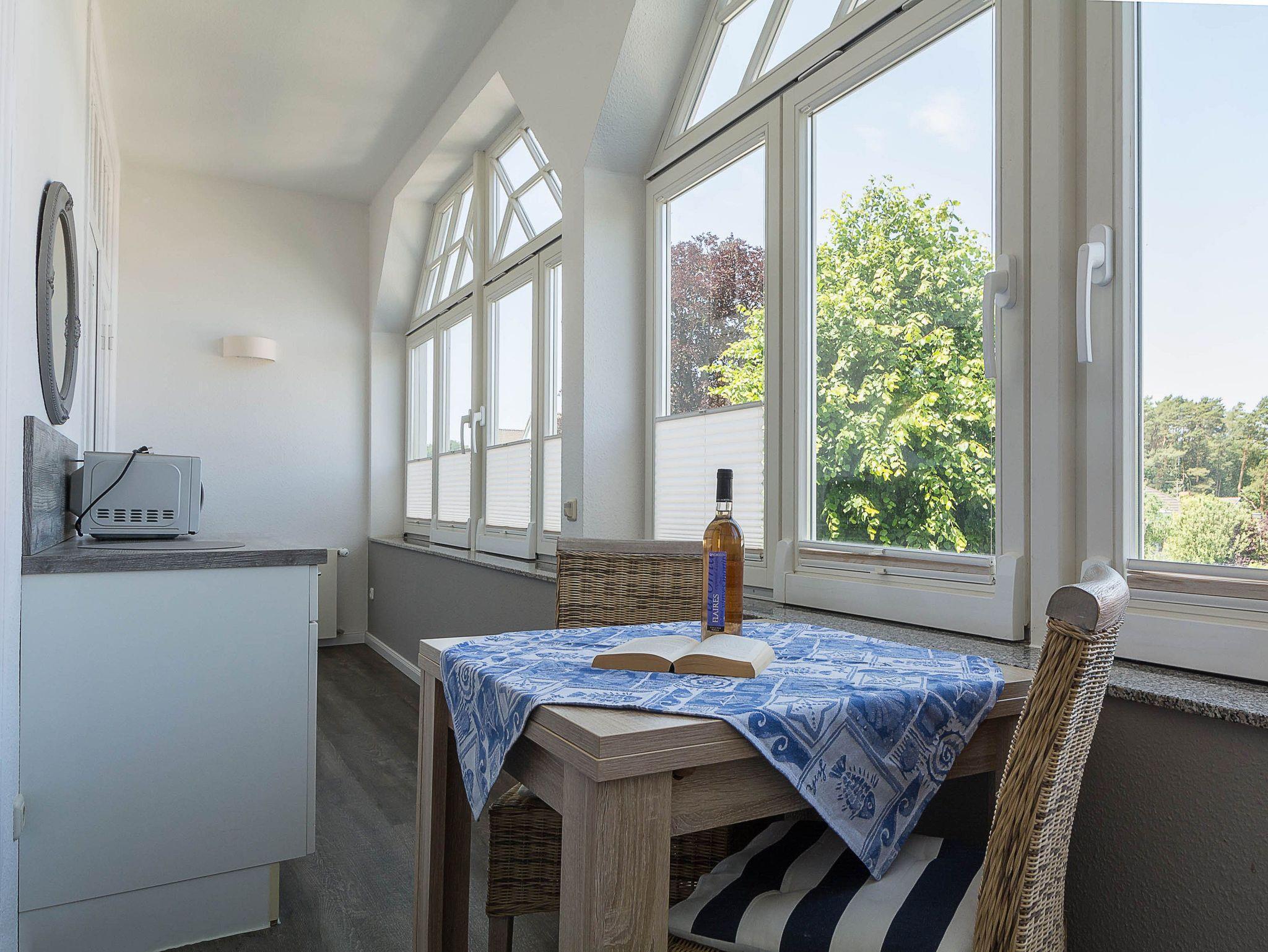 Sie wohnen in einer hellen und freundlich eingerichteten 2-Raum-Ferienwohnung von ca. 40 m² Größe, die sich im ersten Obergeschoss der Seebad-Villa befindet. Der offene Wohn- und Essraum ist ausgestattet mit Schlafcouch, Flachbild-TV, Radio und einer kleinen Küchenzeile (2-Platten-Ceranfeld, Kühlschrank mit Gefrierfach, Kaffeemaschine, Toaster). Von hier betreten Sie die helle Veranda, die zum Schlafbereich führt. Hier können Sie Ihr leckeres Frühstück mit herrlichen Blick auf die Strandstraße genießen. Der Schlafraum mit Doppelbett schließt sich der Veranda an. Das moderne geflieste Bad mit Dusche und WC sowie einem Handtuchwärmer bietet genügend Ablagefläche für Ihre Badutensilien.