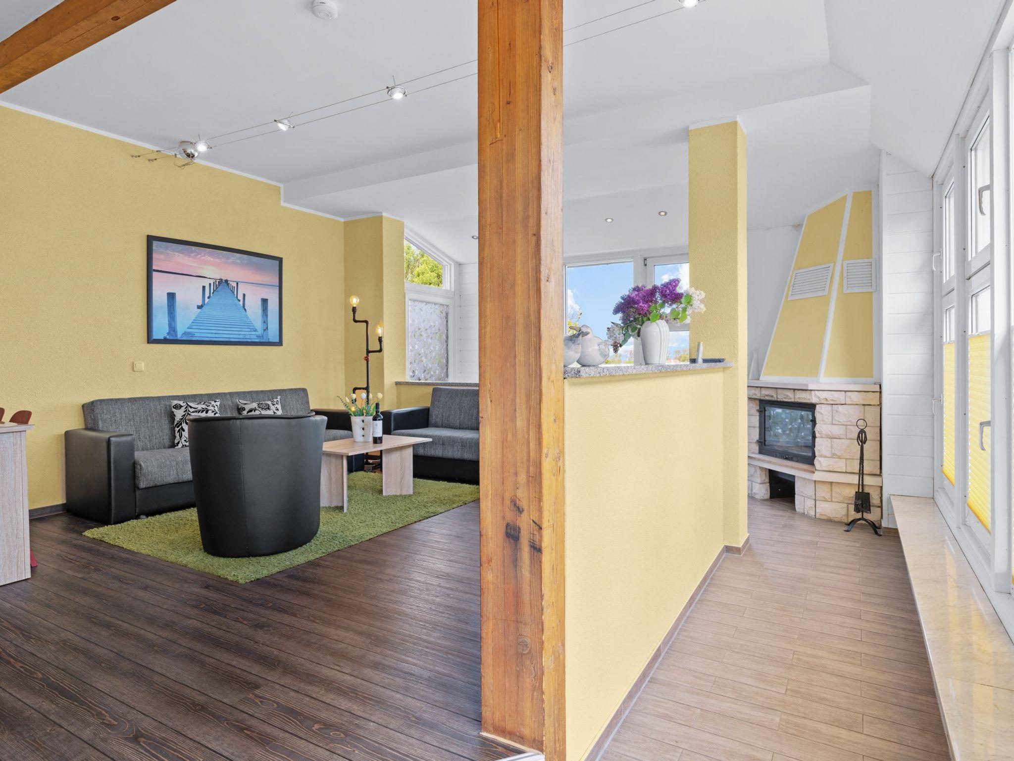 Helle und sehr großzügige 3- Zimmer Ferienwohnung im Erdgeschoss mit großzügigem Wohn-und Esszimmer mit Esstisch, Sofaecke, Kamin, TV und Blick auf die Ostsee und in den Garten. Separate und umfangreich ausgestattete Küche mit 4- Plattenherd, Backofen, Geschirrspüler, Kühlschrank mit Gefrierfach, Kaffeemaschine, Wasserkocher und Toaster. Bad mit Wanne, Dusche, WC und Bidet. Schlafzimmer 1 mit Doppelbett mit durchgehender Matratze (1,80 x 2m) und Kleiderschrank, Schlafzimmer 2 mit zwei Einzelbetten (0,90x2m) und Kleiderschrank.