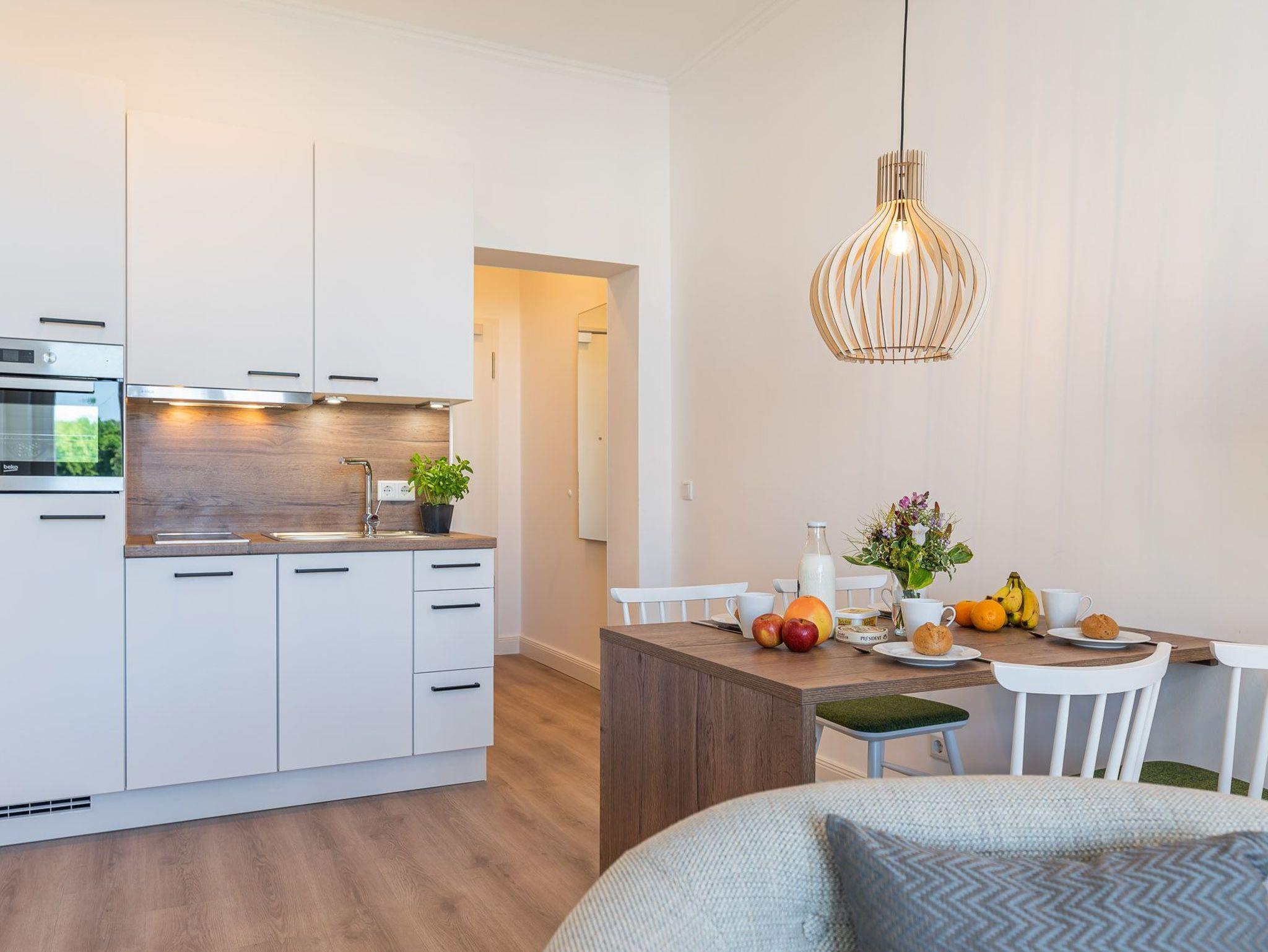 Das Bad verfügt über eine Dusche, einem Haartrockner und einem Handtuchtrockner. Zu Ihrem Apartment gehört ebenfalls ein großer und lichtdurchfluteter Wohn- und Essbereich mit offener Küche.