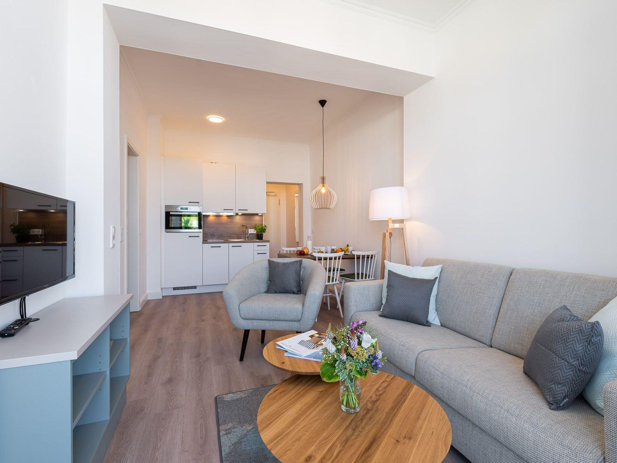 Das Apartment bietet mit seinen zwei Zimmern Platz für 4 Personen. Außerdem verfügt es neben seiner Wohnfläche von ca. 43 qm auch über zwei Balkone. Diese sind mit Balkonmöbeln und einem Sonnenschirm ausgestattet.
