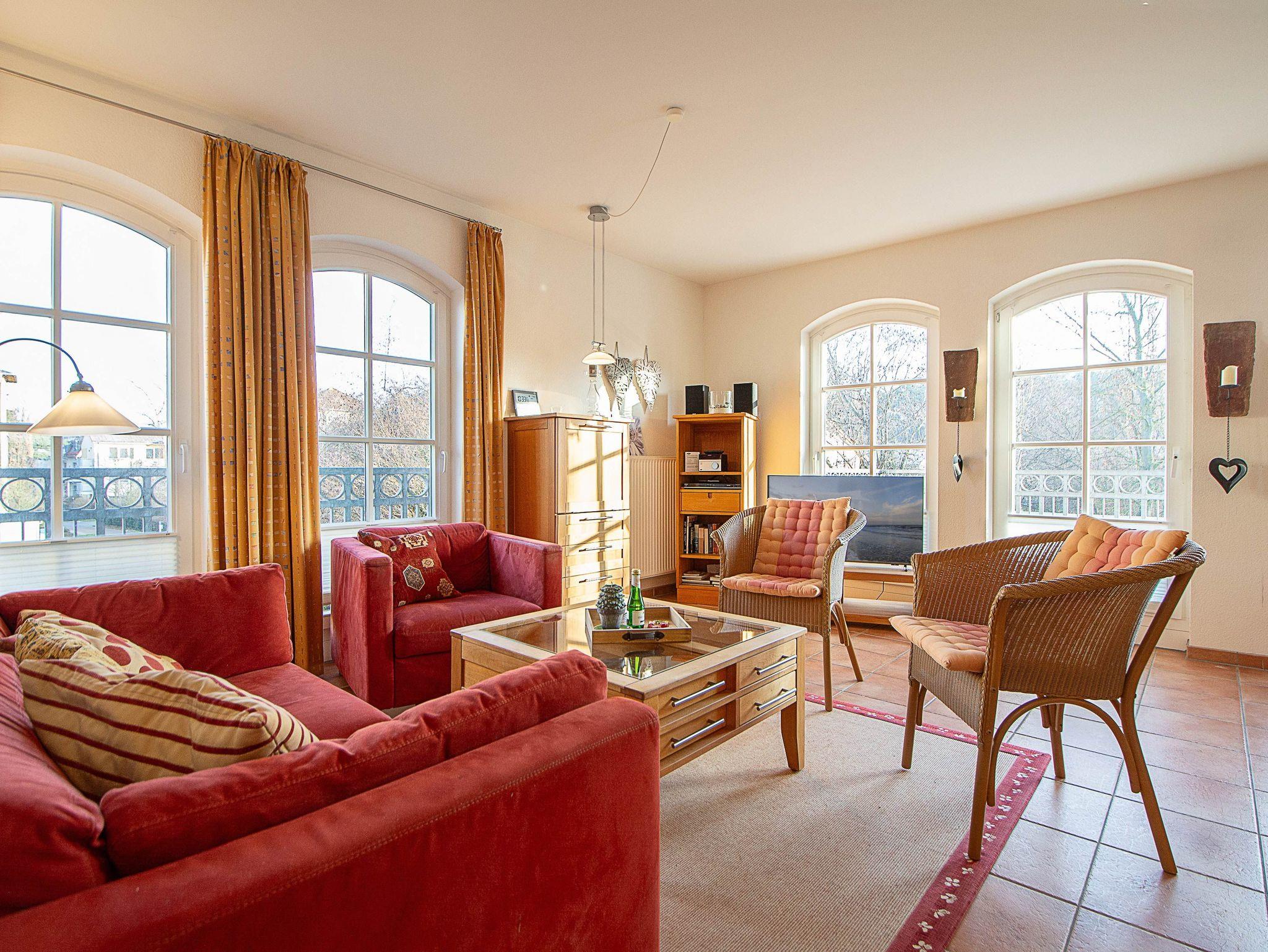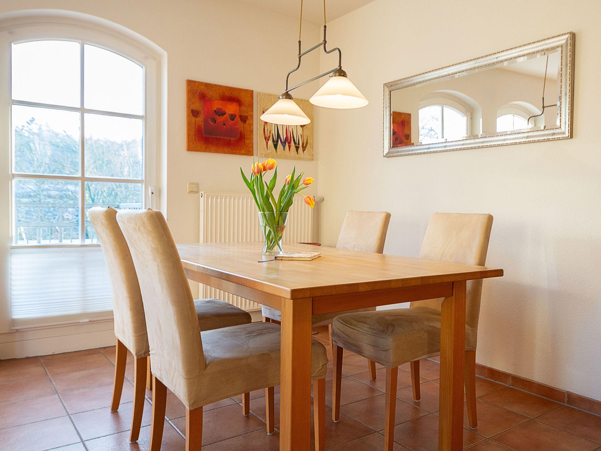 Sie erholen sich in einer liebevoll eingerichteten 3-Raum-Wohnung von ca. 62 m² Größe, die im 1. Obergeschoss liegt. Das Wohnzimmer ist ausgestattet mit Küchenzeile (Herd mit Backofen, Kaffeemaschine, Wasserkocher, Toaster) und TV-Gerät. Der Balkon, auf dem Sie den Tag ausklingen lassen können, erreichen Sie vom Wohnraum aus und geht in Richtung Osten. Zwei Schlafzimmer mit jeweils einem Doppelbett, sowie das Bad mit Dusche und WC vervollständigen das Gesamtbild dieser Wohnung.