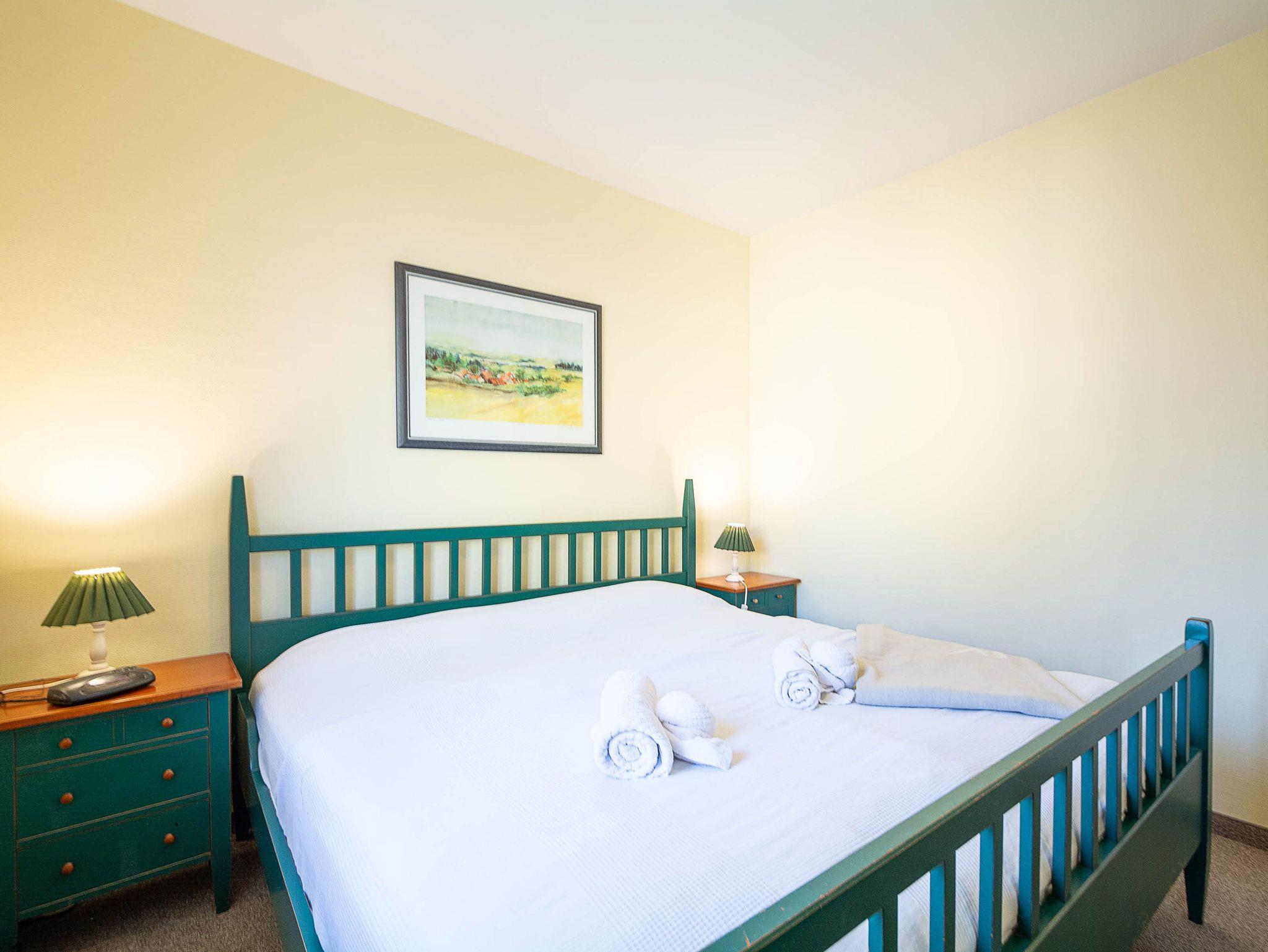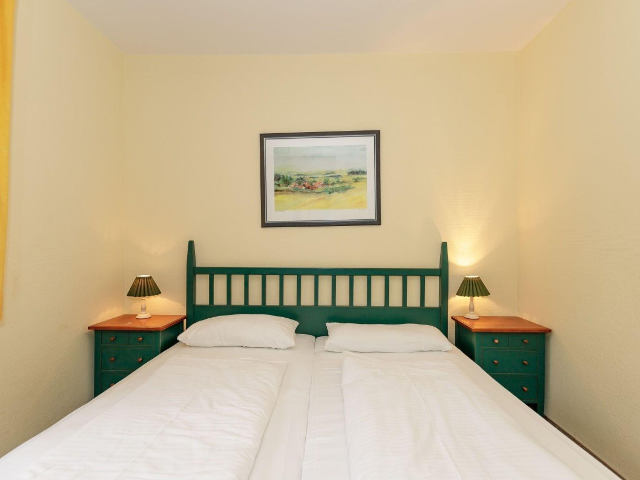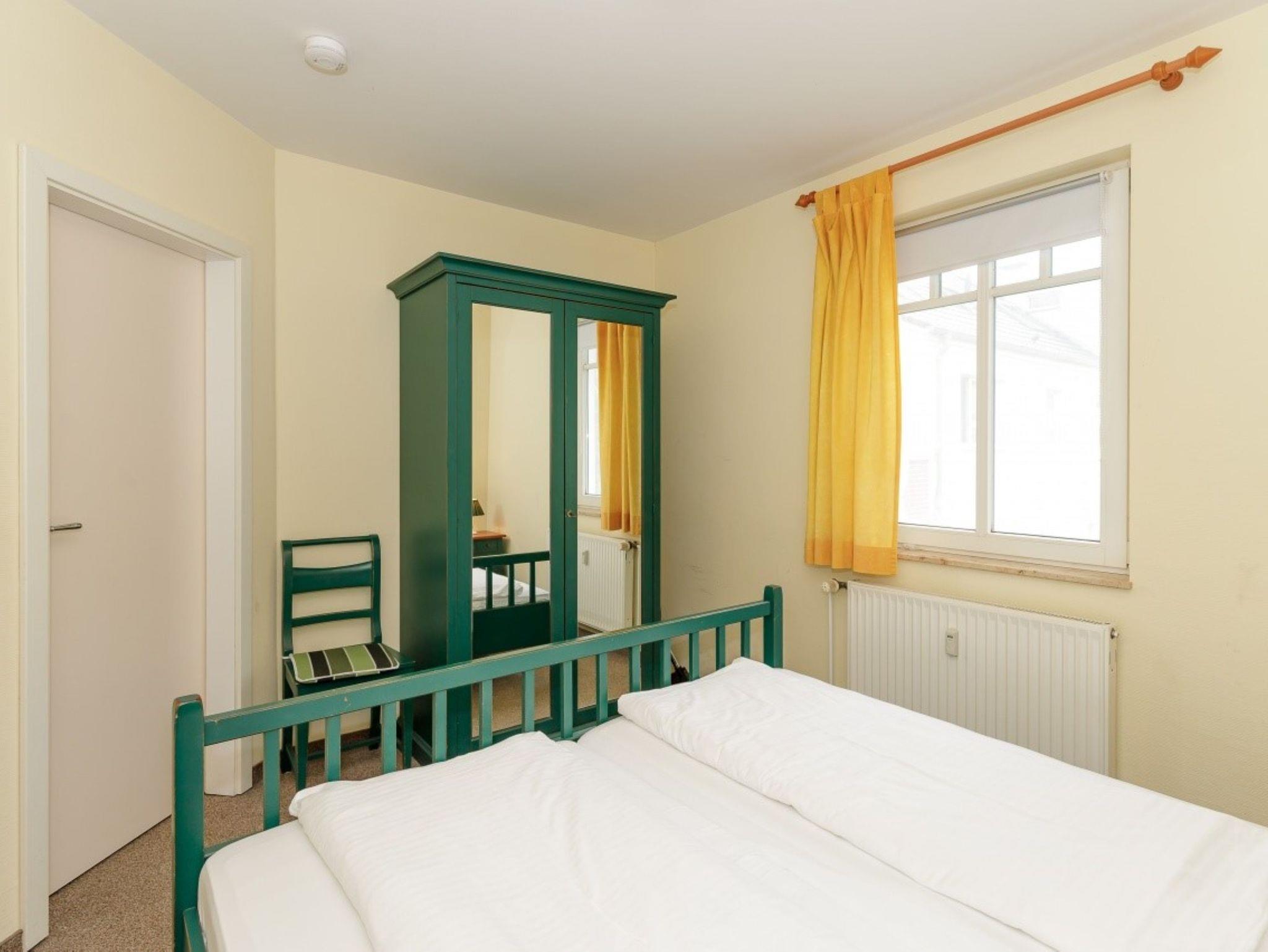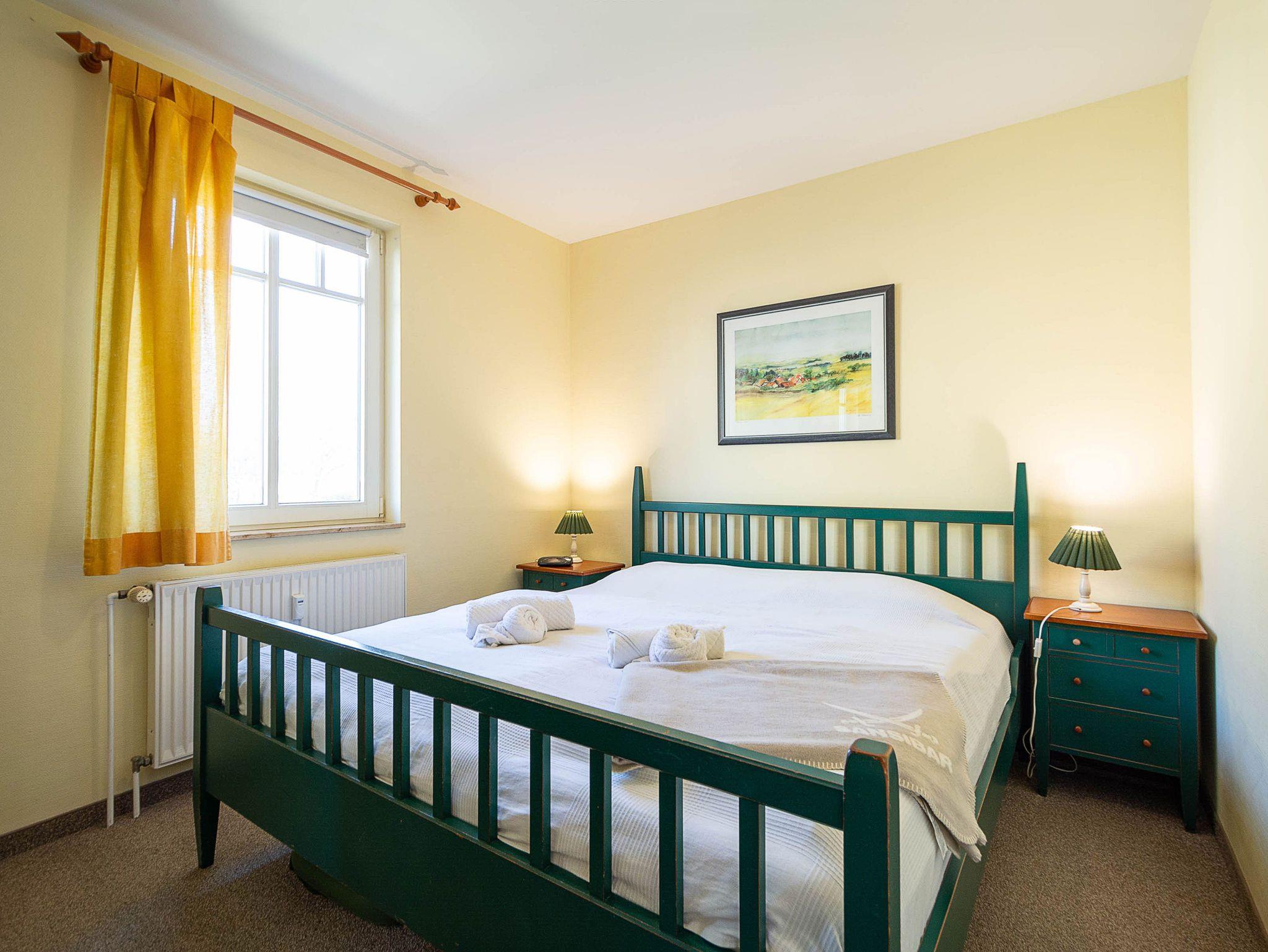 Im Schlafzimmer lädt Sie ein komfortables Doppelbett zur Nachtruhe ein. Der großzügige Kleiderschrank mit Ganzkörperspiegel bietet genügend Platz für Ihre Urlaubsgarderobe. Als Sichtschutz sind im Schlafzimmer Vorhänge an den Fenstern angebracht.