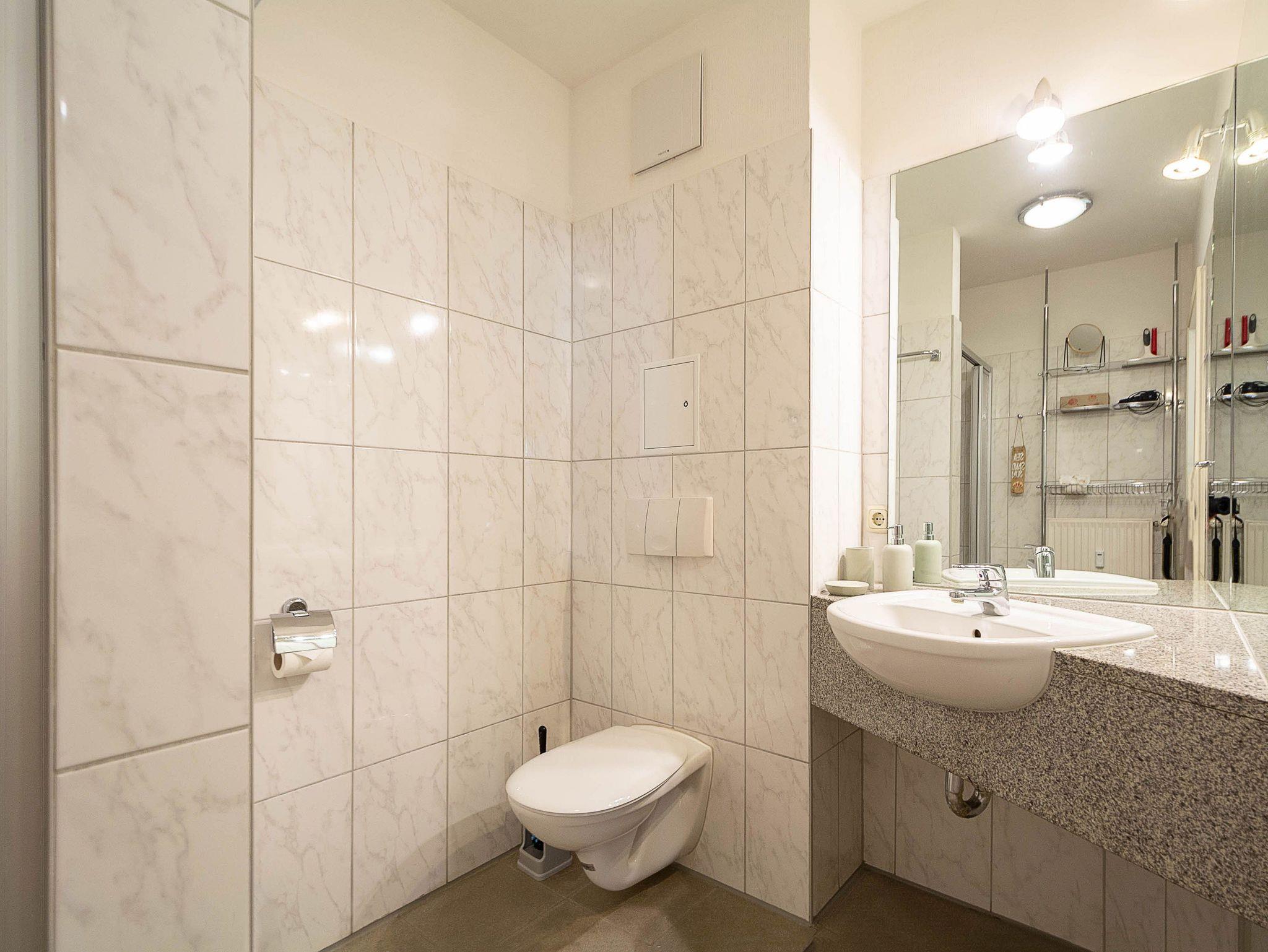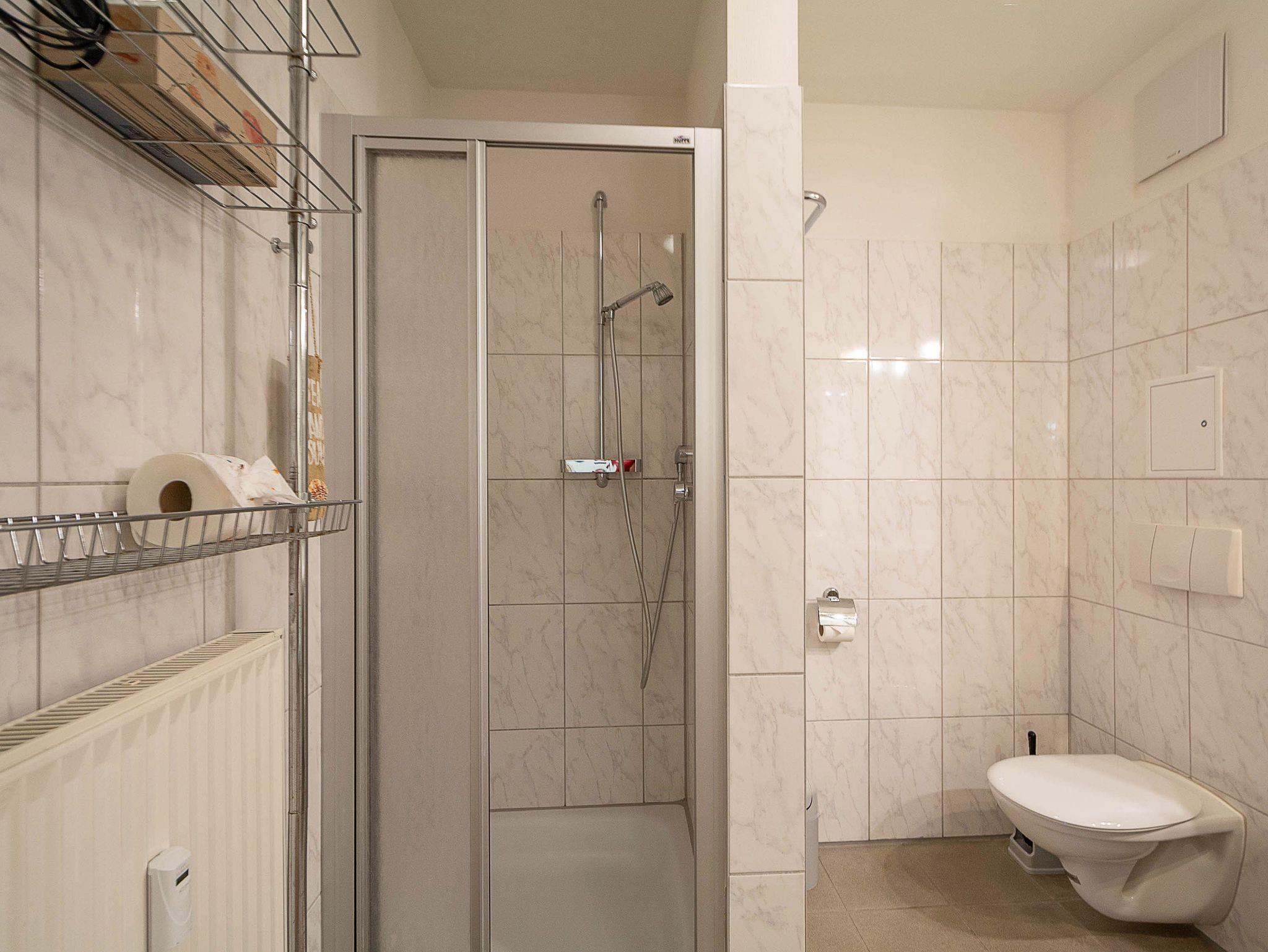 Das geflieste Bad ist ausgestattet mit einer Dusche, Waschbecken, WC und einem Föhn komplettiert die Gesamteinrichtung dieser Ferienwohnung.