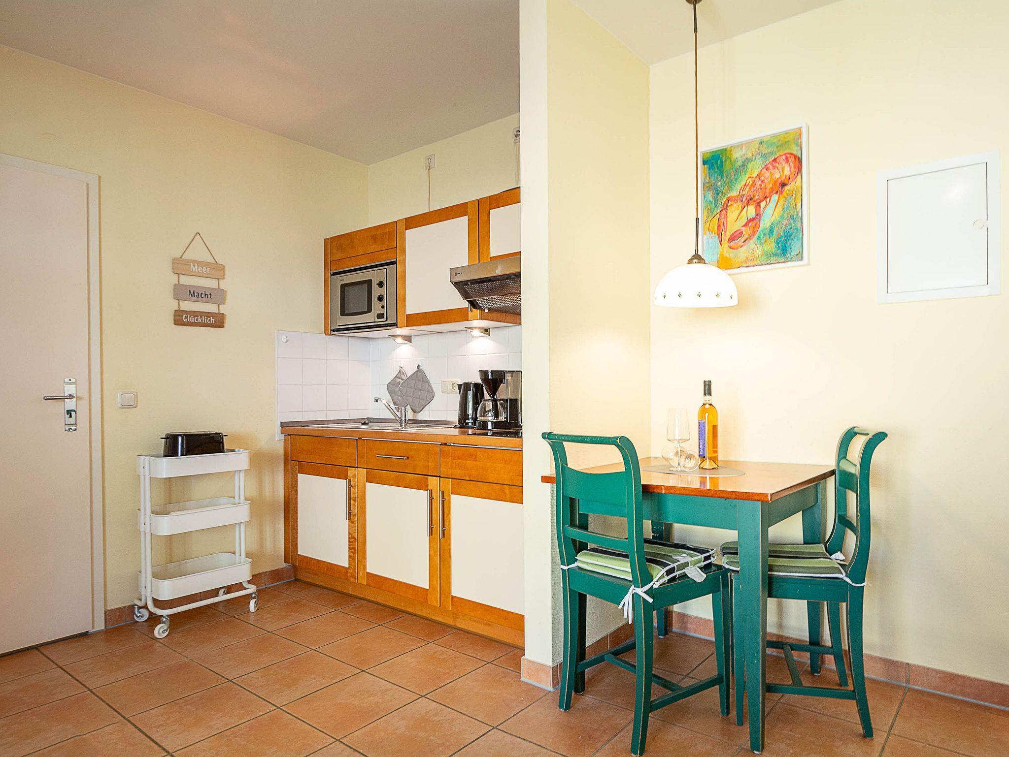 Der angrenzende Essbereich bietet Ihnen Platz für gemeinsame Mahlzeiten. Die offene Pantry-Küche hält für Sie alle wichtigen Küchengeräte und -utensilien bereit, die Sie für Ihr perfektes Dinner benötigen: Ein 2-Platten-Kochfeld, eine Mikrowelle in bequemer Stehhöhe sowie ein Kühlschrank mit Gefrierfach befinden sich in der Küche. Eine Kaffeemaschine, ein Wasserkocher und ein Toaster sowie genügend Koch- und Essgeschirr vervollständigen die Kücheneinrichtung.
