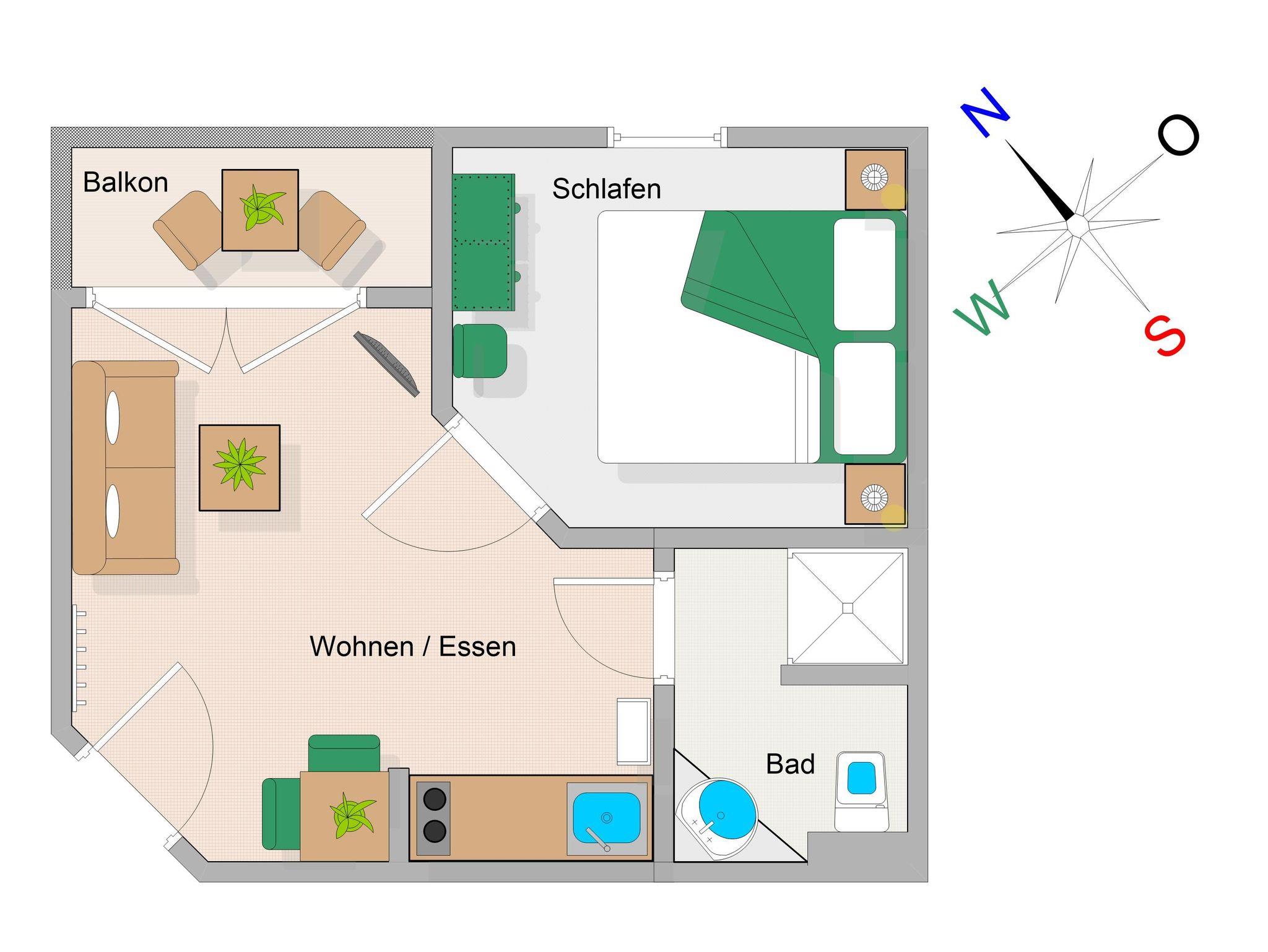 Herzlich willkommen in der Wohnung Nr. 8 in der Villa Schaumburg! Die komfortabel eingerichtete 2-Raum-Ferienwohnung befindet sich im 1. Obergeschoss des Hauses. Auf 33 qm Wohnfläche können hier 2 Personen erholsame Urlaubstage genießen. Eine dritte Person ist auf Anfrage möglich. Es empfangen Sie ein heller offener Wohn-und Essbereich mit einer Pantry-Küchenzeile, ein Schlafzimmer, ein Duschbad sowie eine Loggia mit Nord-Ost-Ausrichtung. Der Wohnraum ist mit mediterranen Fliesen, das Schlafzimmer mit Teppich ausgestattet.