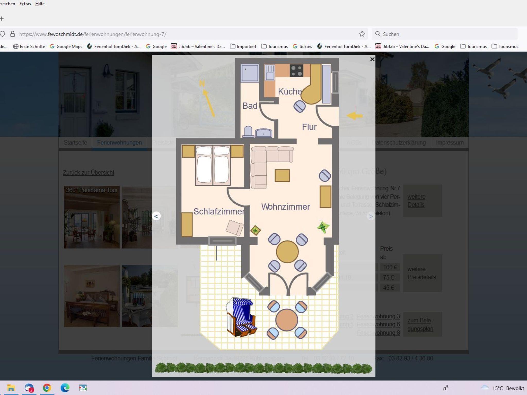 Die Wohnungen Nr. 3 und 7 sind in einem Ferienhaus im EG liegende Ferienwohnungen von ca. 60 qm Größe, bestehend aus Wohnzimmer mit Erker und Terrasse inkl. Strandkorb, Schlafzimmer und Küche.