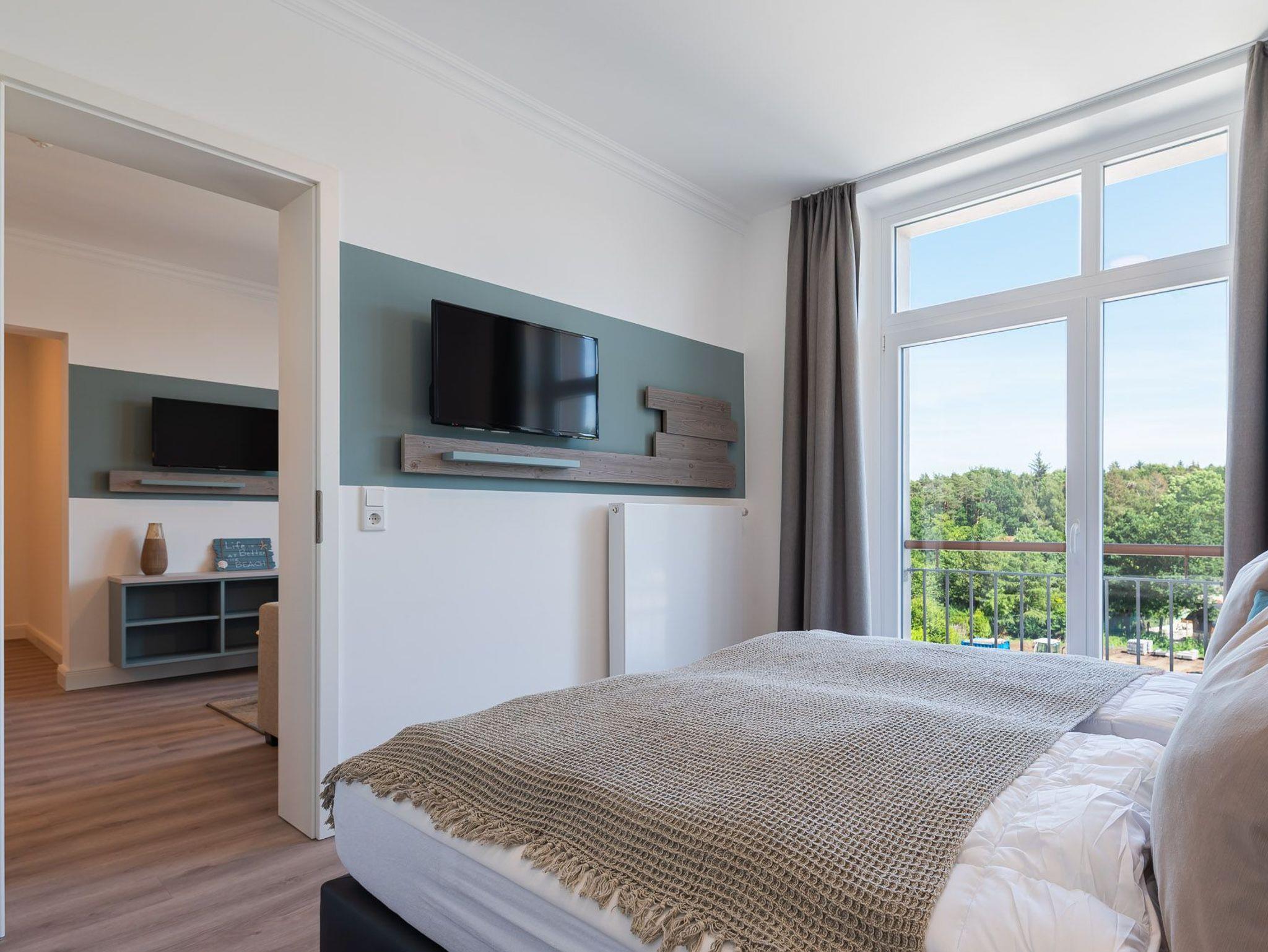 Das Schlafzimmer verfügt über ein 1,80 x 2,00 m Bett, sowie über einen Kleiderschrank und ein TV-Gerät. Die zweite Schlafmöglichkeit ist ein bequemes Schlafsofa mit einer Liegefläche von 1,29 x 1,98 m. Für unsere kleinen Gäste können ein Kinderreisebett und ein Kinderhochstuhl bereitgestellt werden (kostenpflichtig zu buchbar).