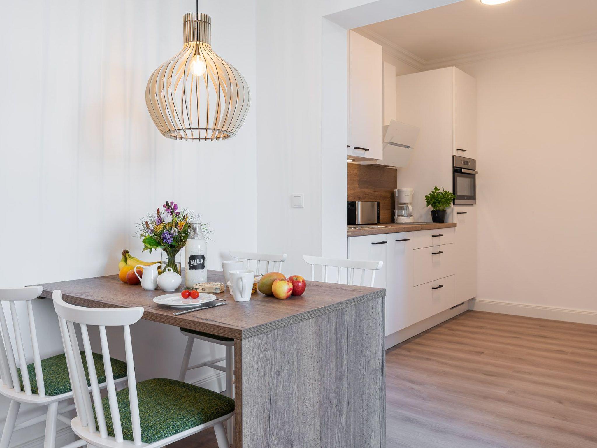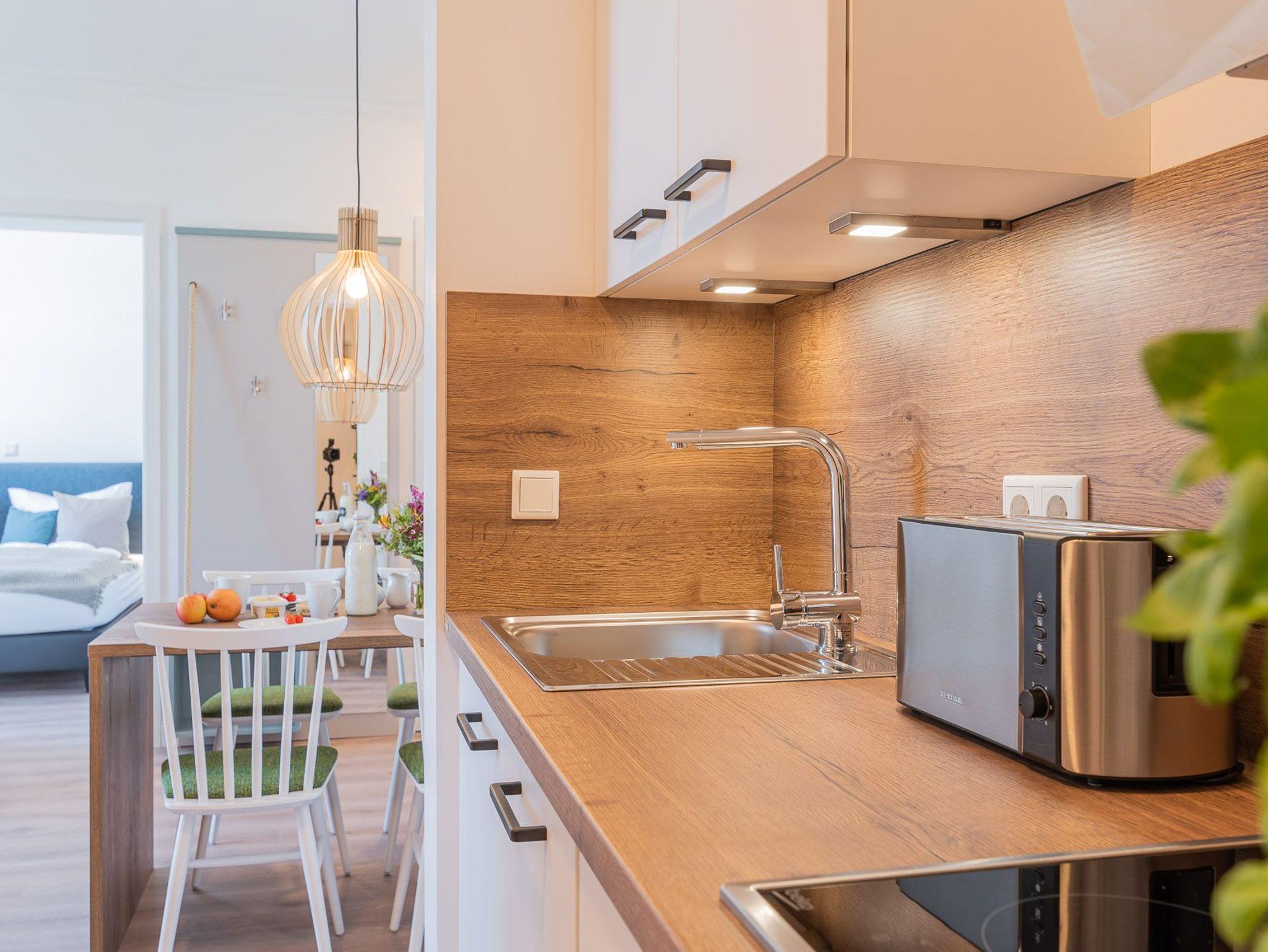 Das Bad verfügt über eine Dusche, einem Haartrockner und einem Handtuchtrockner. Zu Ihrem Apartment gehört ebenfalls ein großer und lichtdurchfluteter Wohn- und Essbereich mit offener Küche.