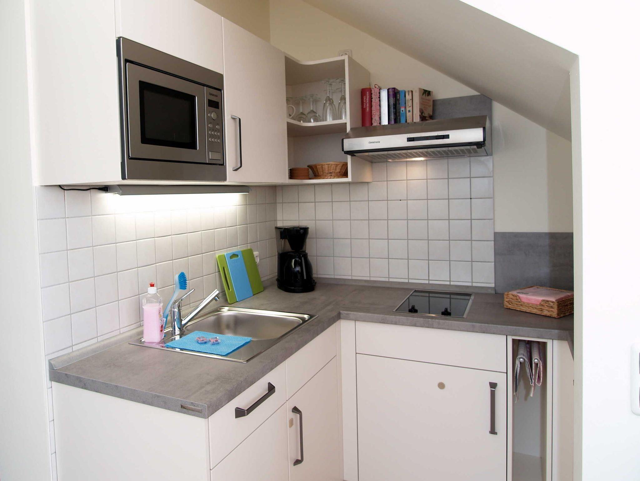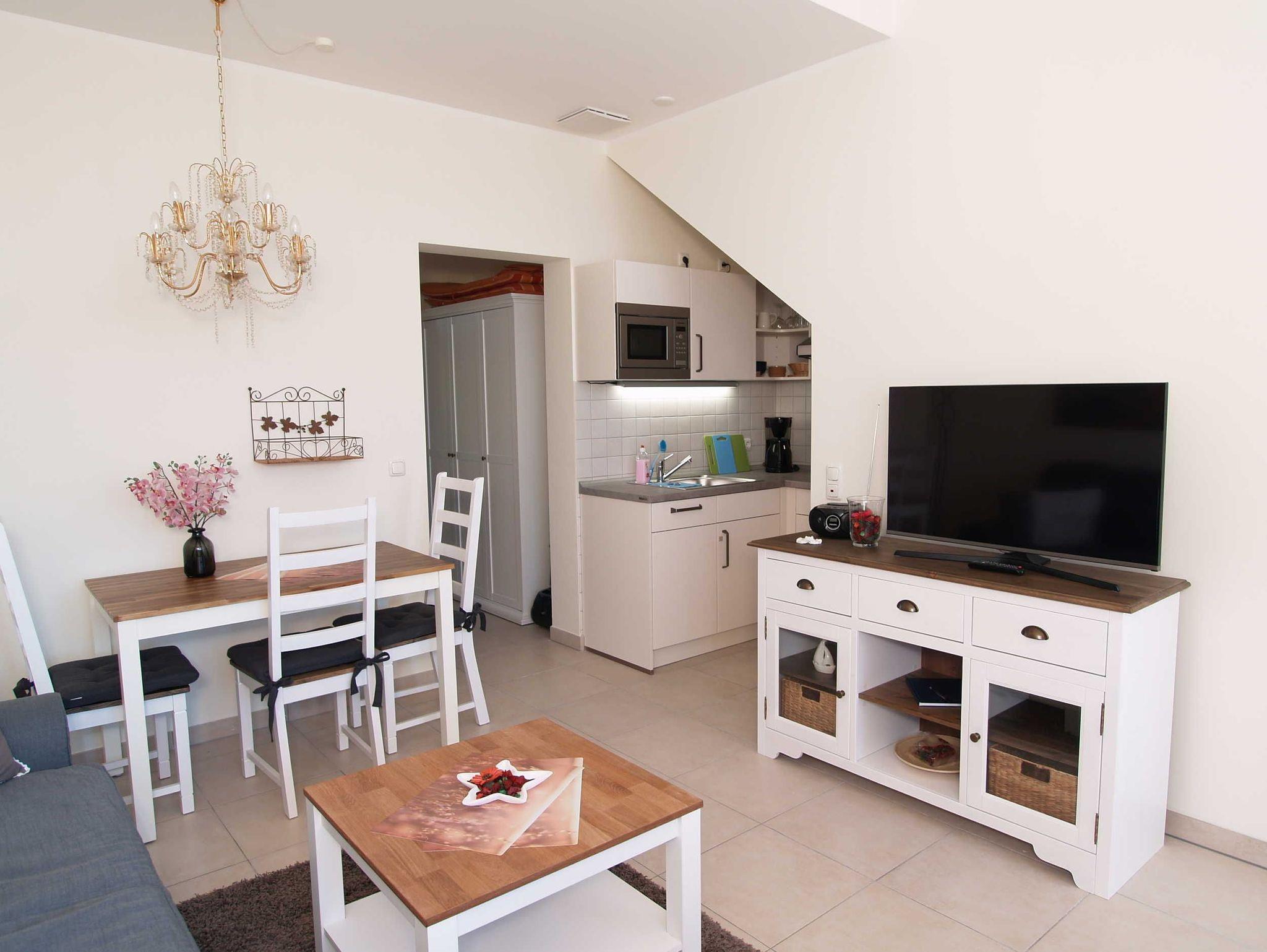 Die angrenzende offene Küchenzeile ist mit einem Kühlschrank mit Gefrierfach, einem Geschirrspüler, einem 2-Platten-Cerankochfeld mit Dunstabzug und einer Mikrowelle voll ausgestattet. Die Küchenausstattung wird komplettiert durch einen Toaster, eine Kaffeemaschine und einen Wasserkocher.