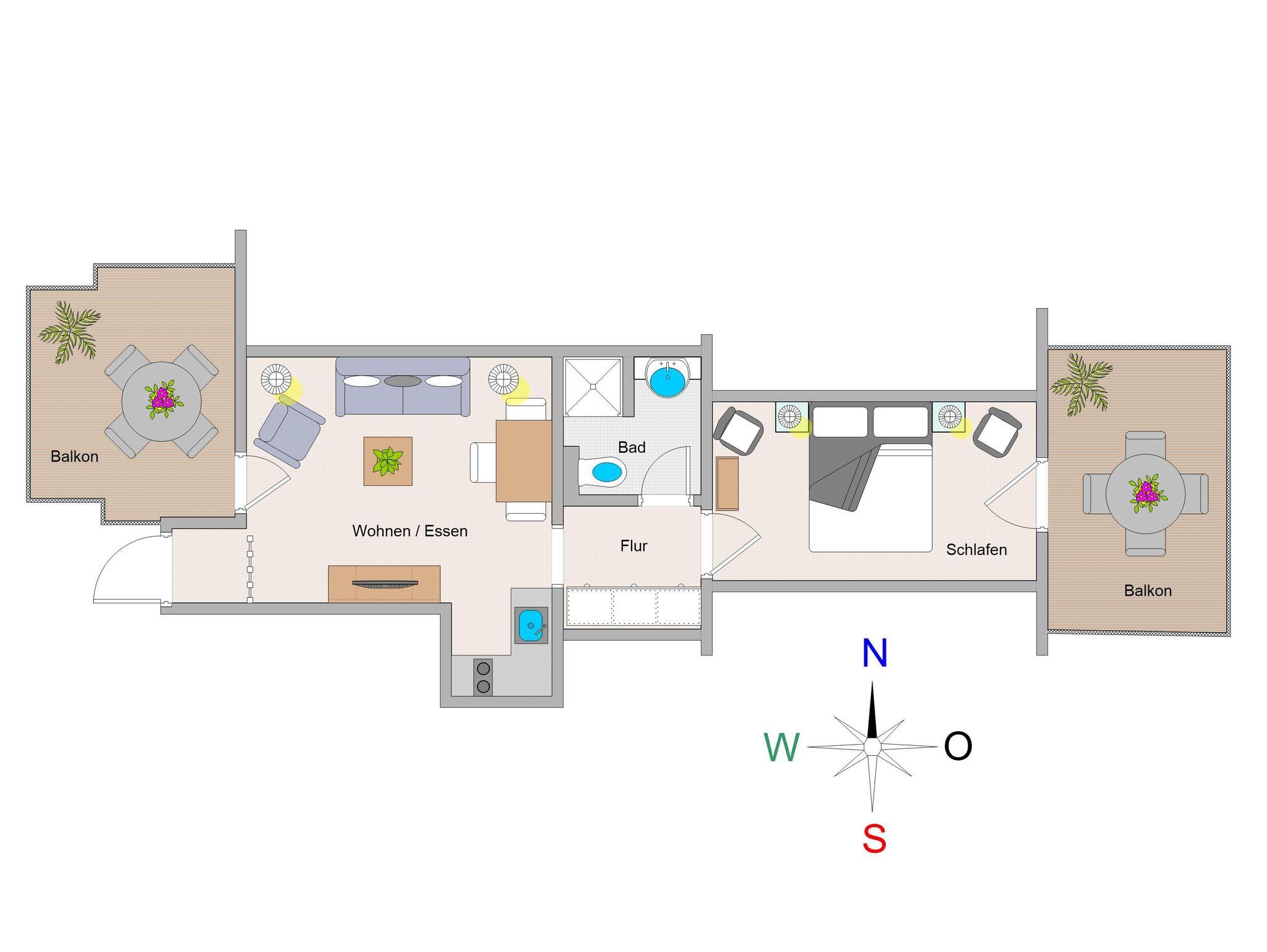 Sie wohnen in einer 47 m² großen 2-Raum-Ferienwohnung, die sich in der ersten Etage unserer charmanten Appartementanlage in der Strandstraße 14 in Kühlungsborn Ost befindet. Diese liebevoll eingerichtete Ferienwohnung wurde im Jahr 2018 umfassend renoviert und bietet bis zu 2 Personen einen erholsamen Urlaub an der Ostsee. Die Wohnung ist in einen Wohn- und Essbereich Bereich, ein Schlafzimmer und ein gefliestes Bad mit Dusche aufgeteilt. Ein Ost-Balkon und eine Balkonterrasse mit Westausrichtung bieten zu jeder Tageszeit Erholung pur an frischer Luft.