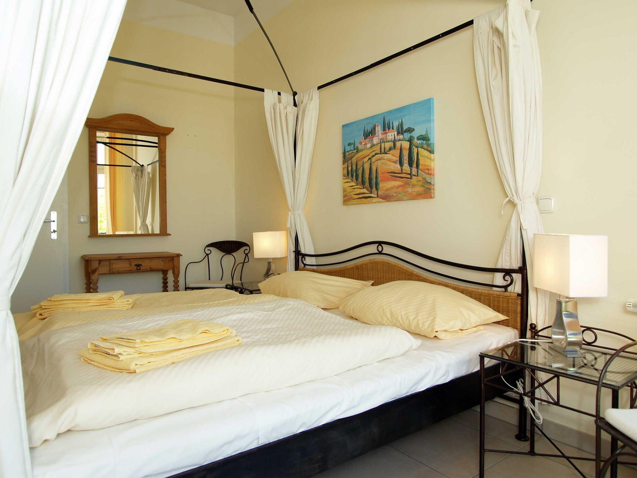 Das Schlafzimmer dieser Ferienwohnung ist mit einem komfortablen Doppelbett eingerichtet und schafft eine angenehme Nachtruhe. Von hier betreten Sie den Balkon in Richtung Osten, der die Morgensonne einfängt. Der Wandschrank im Flur bietet Ihnen ausreichend Stauraum für Ihre Urlaubsgarderobe.