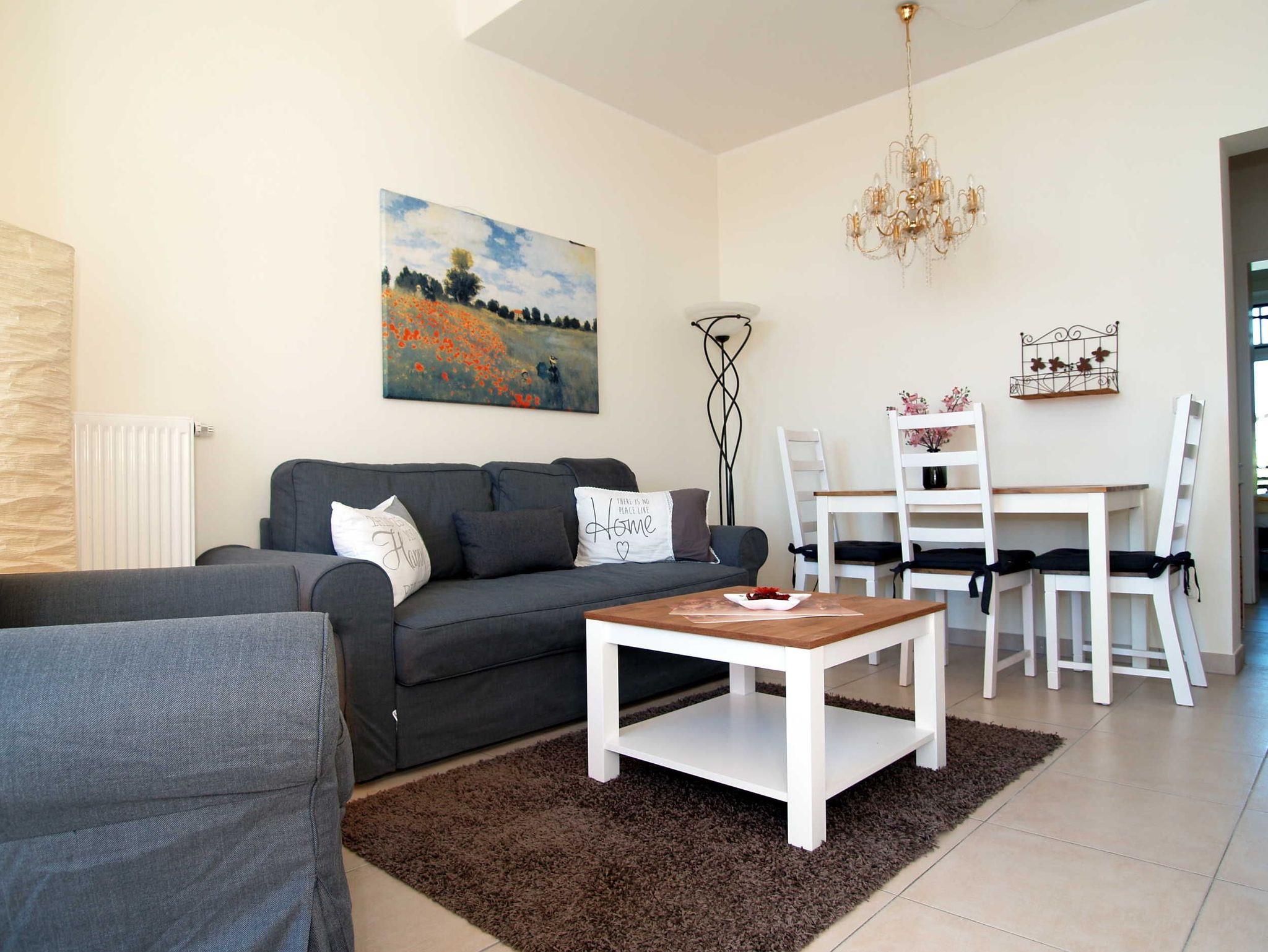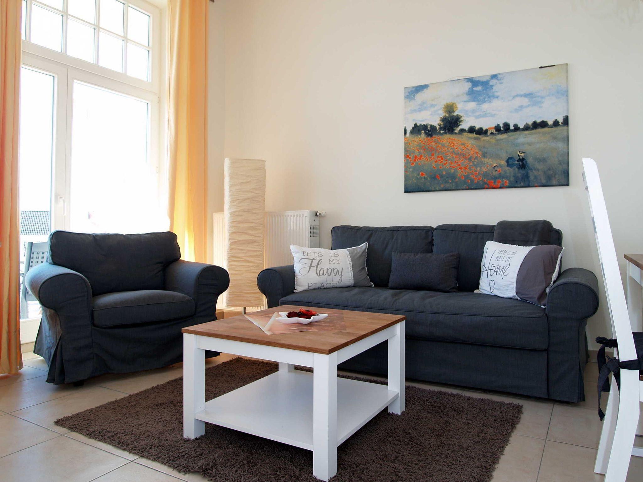 Sie betreten die im nordischen Landhaus-Stil eingerichtete Wohnung über eine Terrasse, auf die Sie über die Rückseite des Hauses per Außentreppe gelangen. Es begrüßt Sie ein heller freundlicher Wohnraum mit gemütlicher Schlafcouch, Flachbild-TV und Radio. Der Essbereich ist im Wohnbereich integriert und bietet Ihnen Platz für gemeinsame Mahlzeiten.