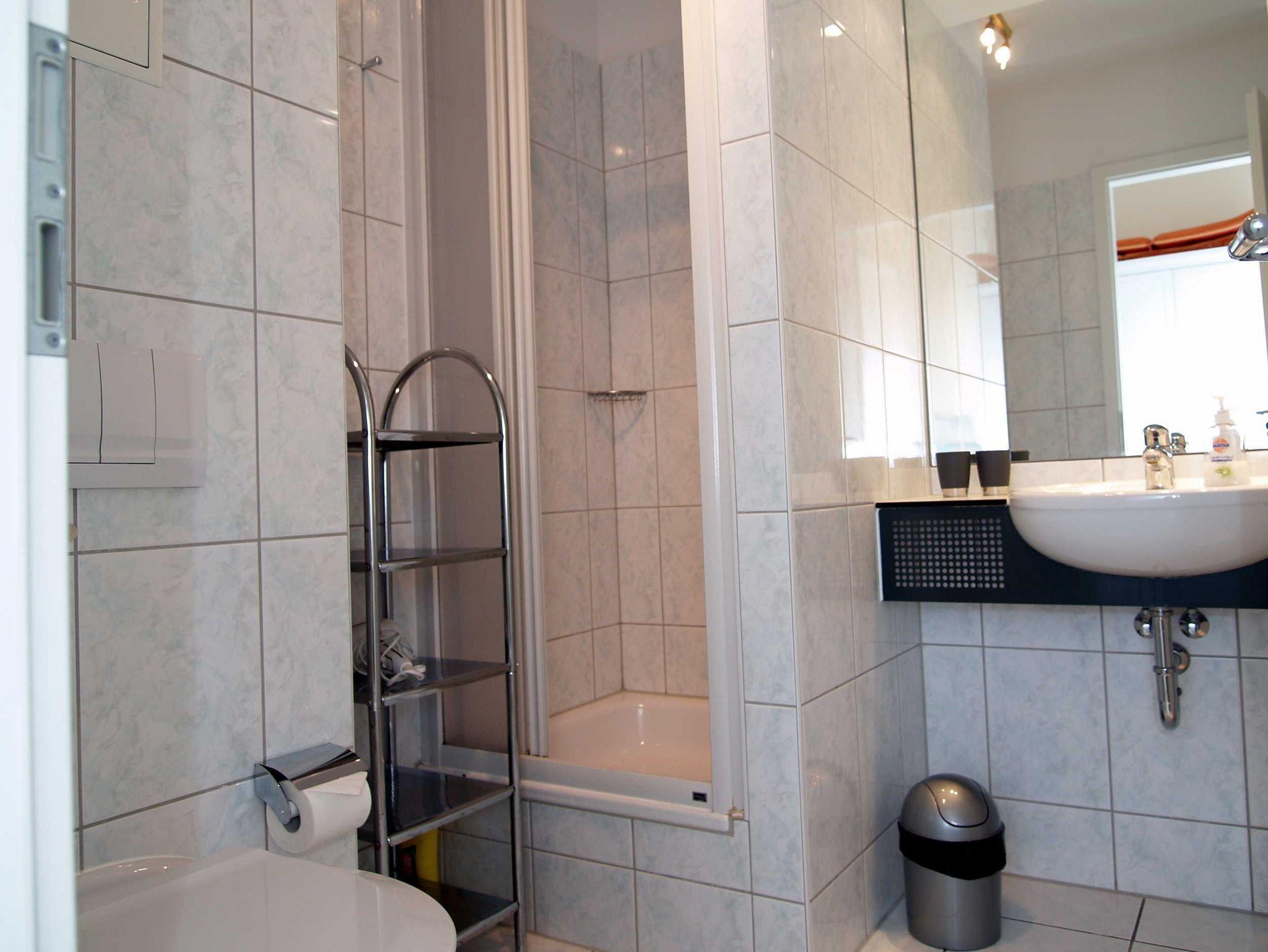 Das geflieste Bad mit Dusche und WC ist mit einem Waschtisch und einem Föhn ausgestattet.