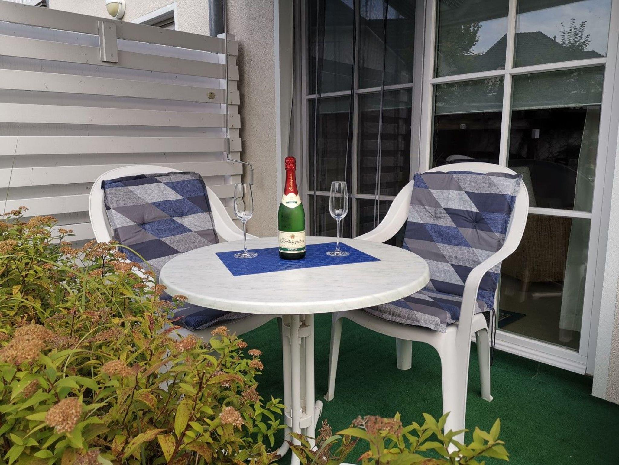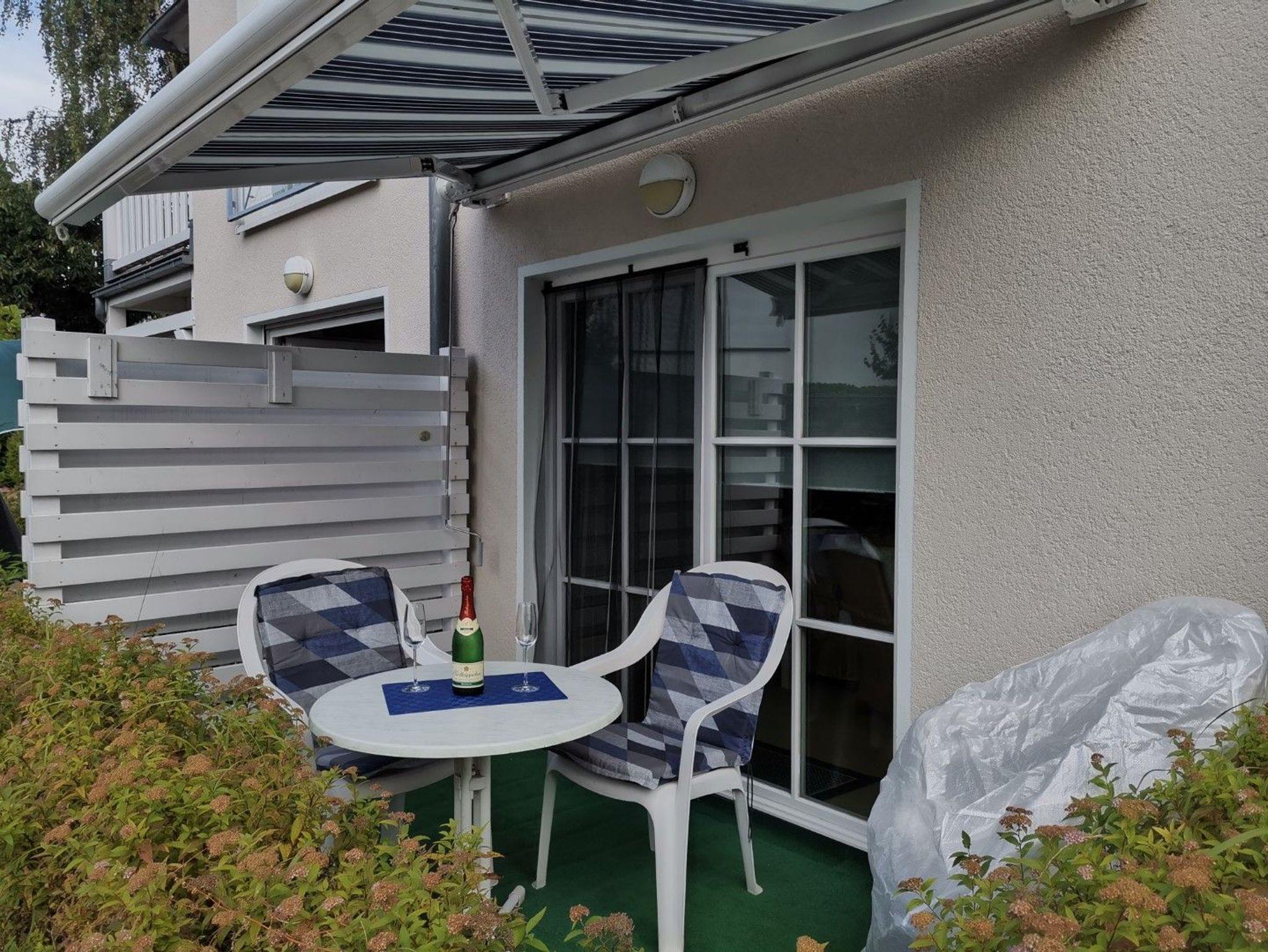 Vom Wohnbereich betreten Sie die möblierte Terrasse, die nach Süden ausgerichtet ist. Sie bietet Licht vom Vormittag bis zum frühen Abend. Hier können Sie Sonne tanken, relaxen und den Abend nach einem schönen Tag am Meer ausklingen lassen. Dank einer Markis können Sie sich vor internsiver Sonneneinstrahlung schützen.