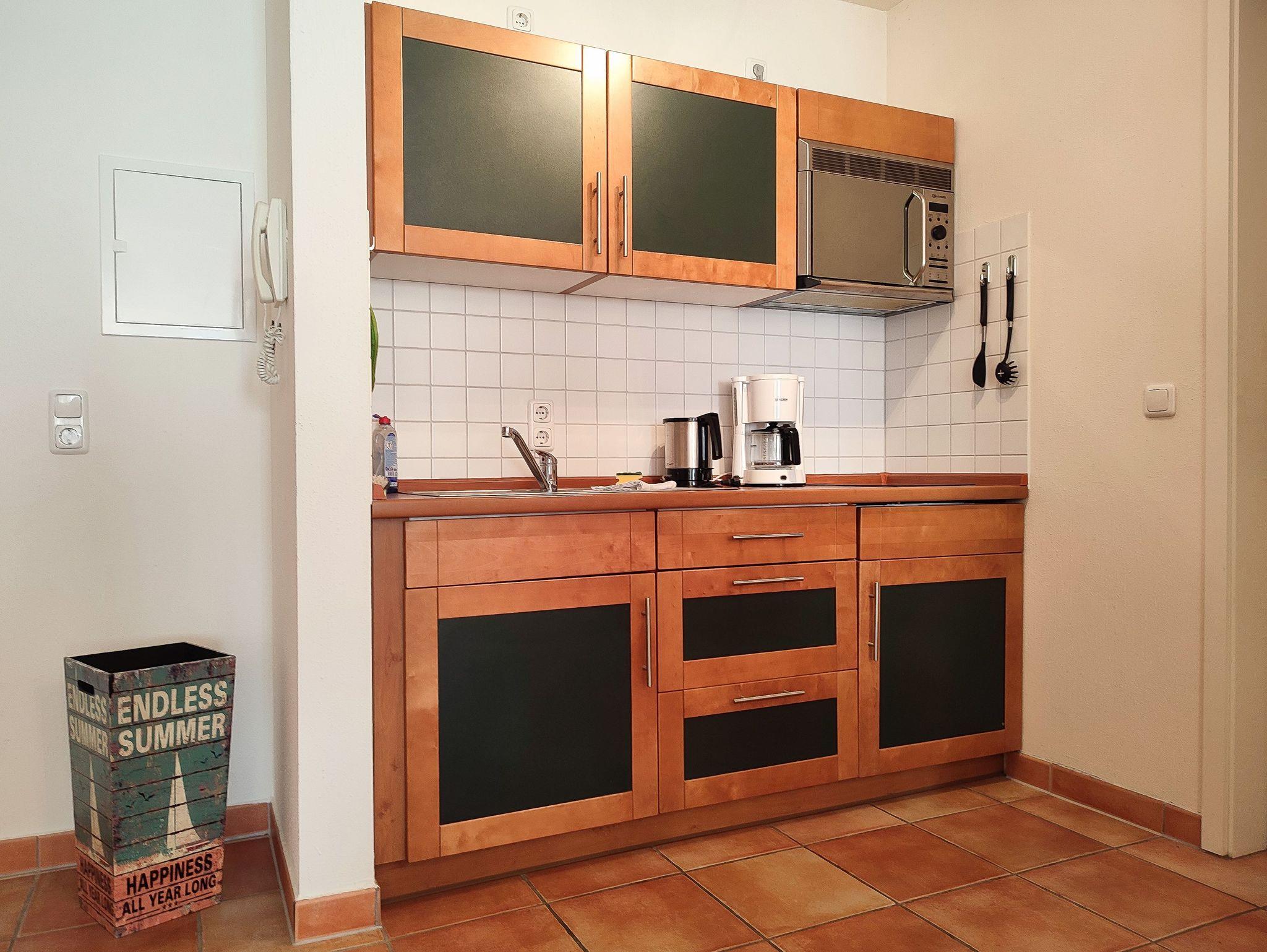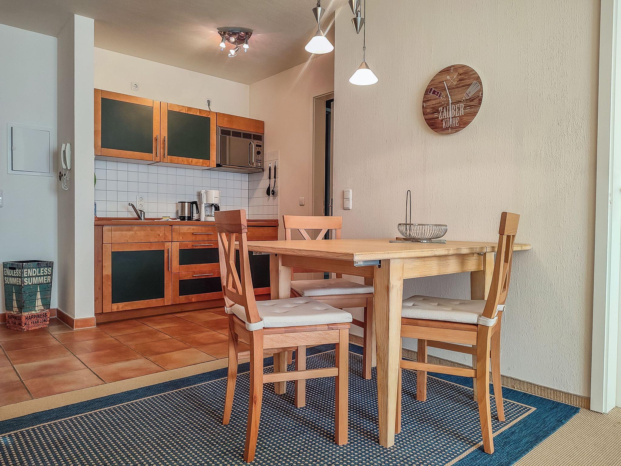 Der liebevoll eingerichtete Wohnbereich ist mit einer gemütlichen Sitzgruppe und einem 31-Zoll Smart-TV eingerichtet. Der angrenzende Essbereich bietet Ihnen reichlich Platz für gemeinsame Mahlzeiten. Die offene Küchenzeile im Landhausstil hält für Sie alle wichtigen Küchengeräte und -utensilien bereit, die Sie für Ihr perfektes Dinner benötigen: Ein 2-Zonen-Cerankochfeld, eine Mikrowelle mit Grillfunktion in bequemer Stehhöhe sowie ein kleiner Kühlschrank mit Gefrierfach befinden sich in der Küche. Eine Kaffeemaschine, ein Wasserkocher, ein Eierkocher und ein Toaster sowie genügend Koch- und Essgeschirr vervollständigen die Kücheneinrichtung.