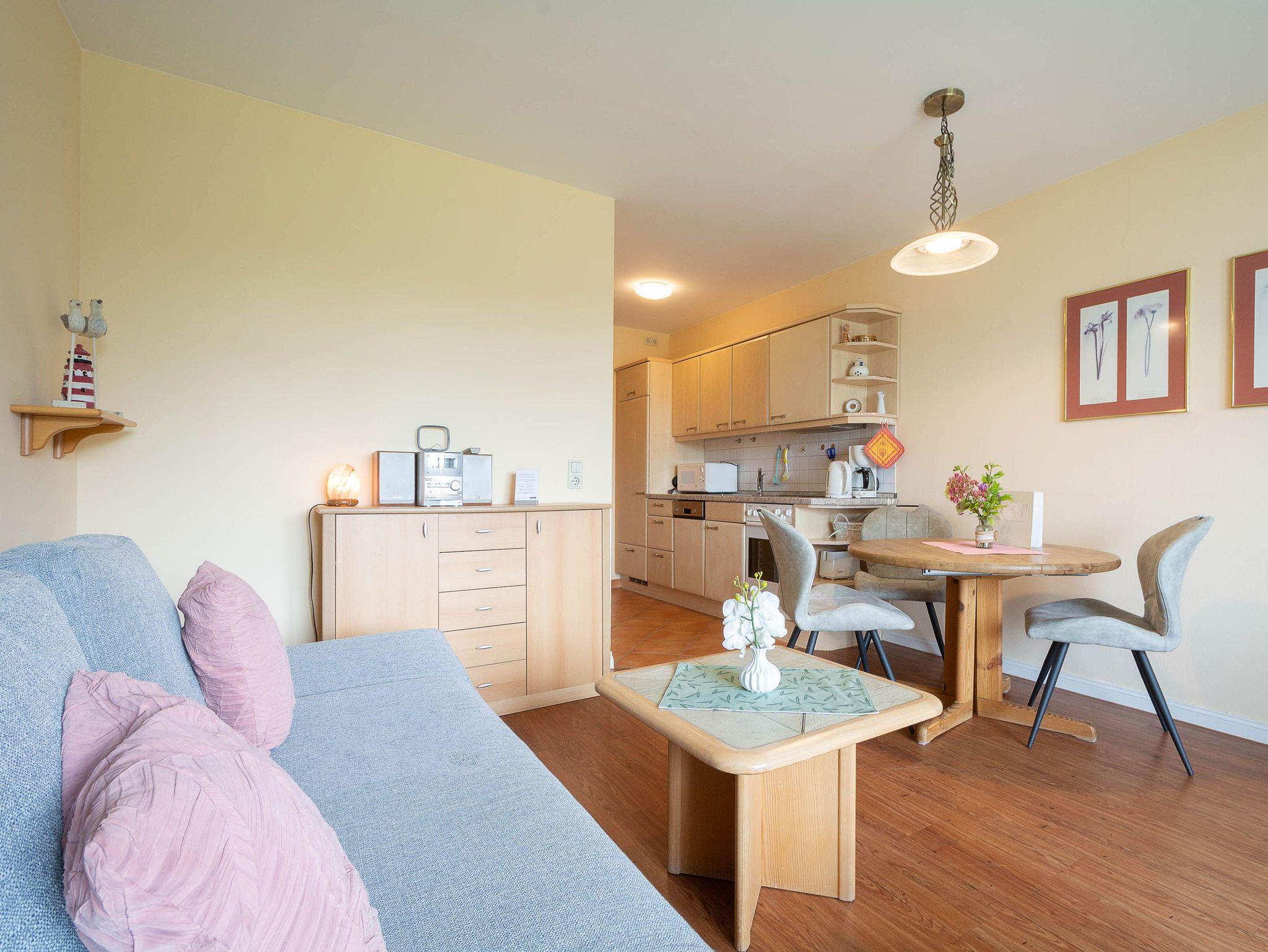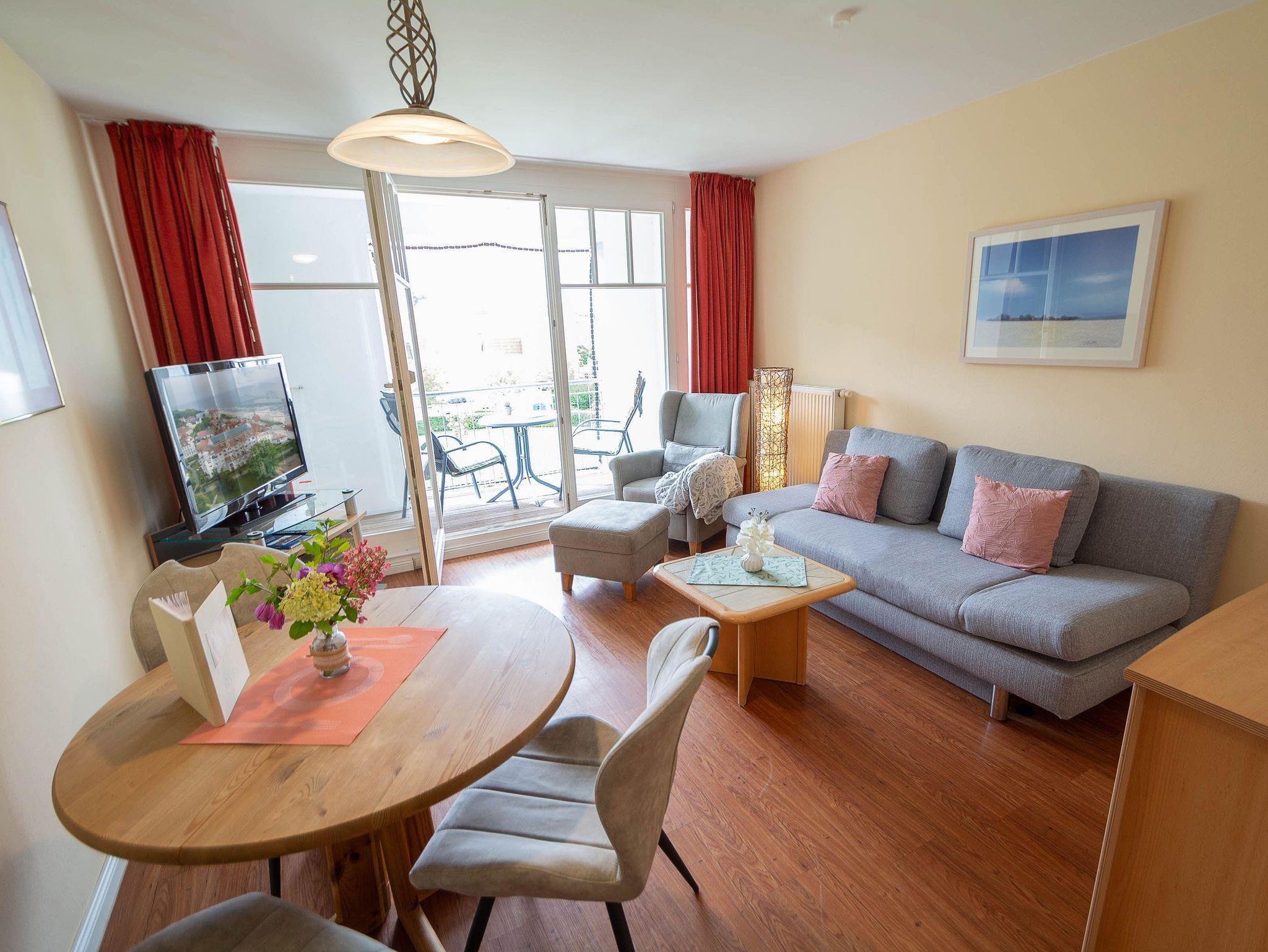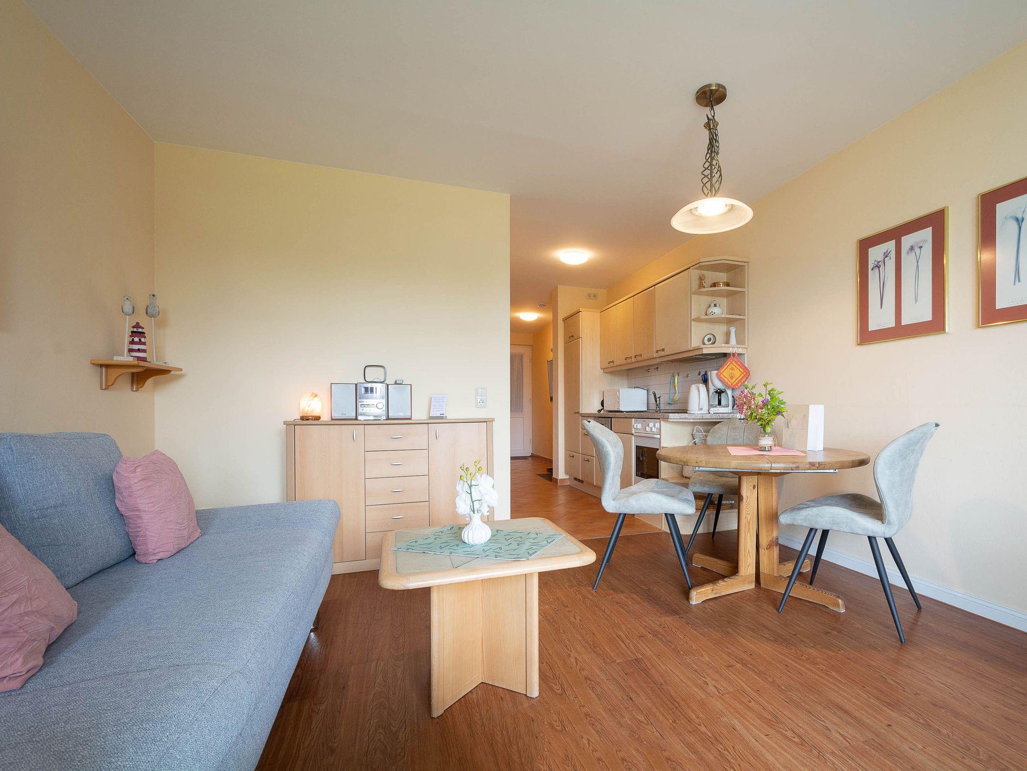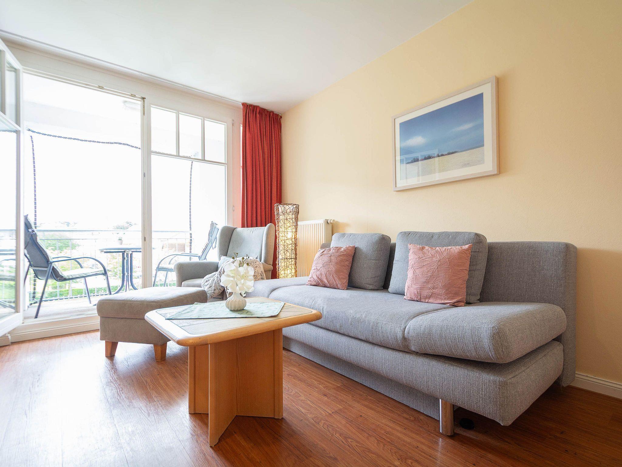 Die freundlich und komfortabel eingerichtete 2-Raum-Wohnung 2.11 im Haus Meeresblick befindet sich im 2. Obergeschoss des Hauses Meeresblick und ist nach Süden ausgerichtet. Sie eignet sich ideal für zwei Personen und bietet auf ca. 45 m² alles, was man für einen erholsamen Aufenthalt an der Küste braucht. Der helle Wohnbereich empfängt Sie mit einer gemütlichen Couchgarnitur, einem Sessel sowie einem Flachbild-TV und einem CD-Player. Von hier aus gelangen Sie auf den überdachten und geschützten Balkon, der mit einem Tisch und zwei Stühlen ausgestattet ist - perfekt, um die Sonne in windgeschützter Atmosphäre zu genießen.