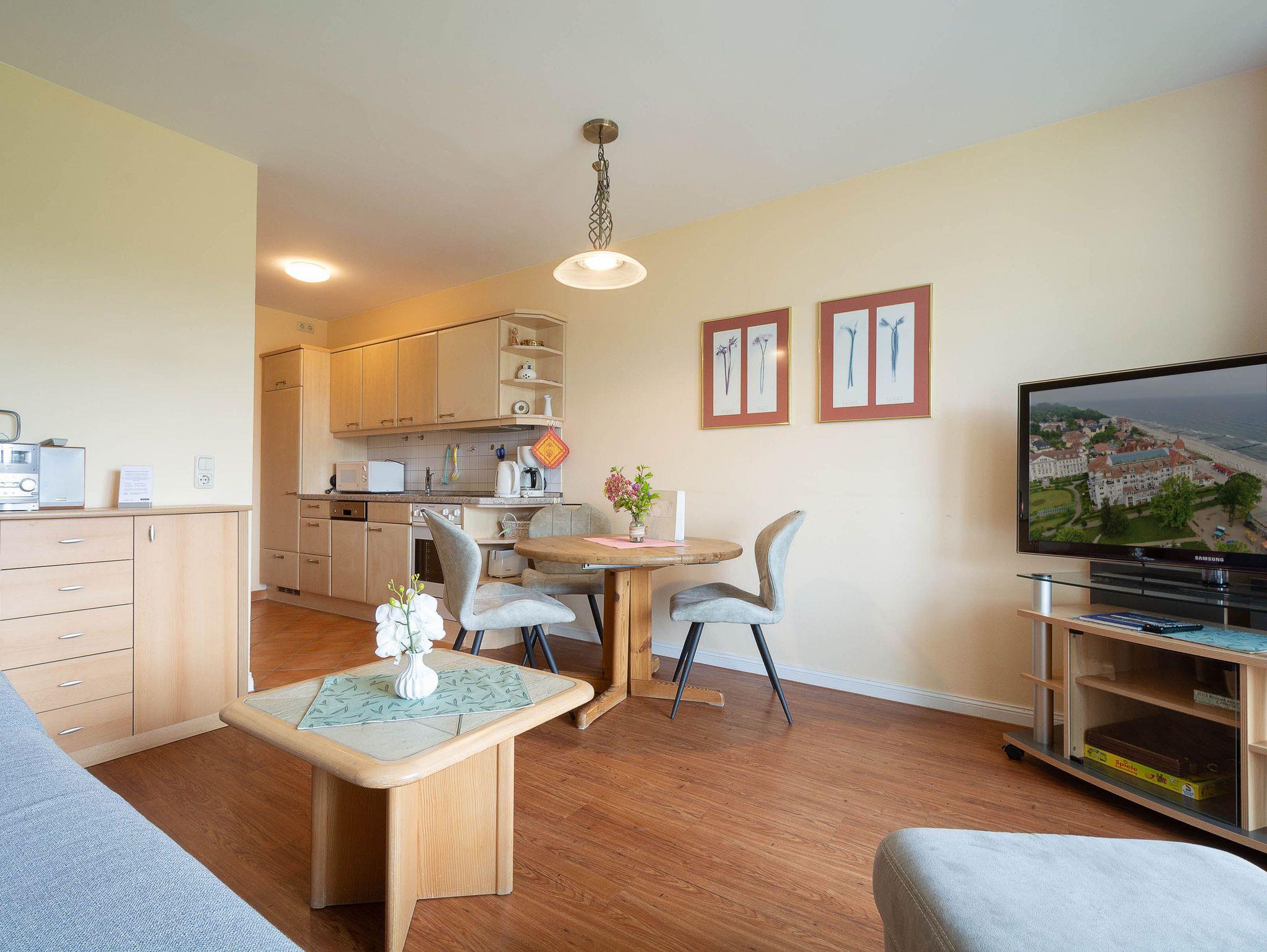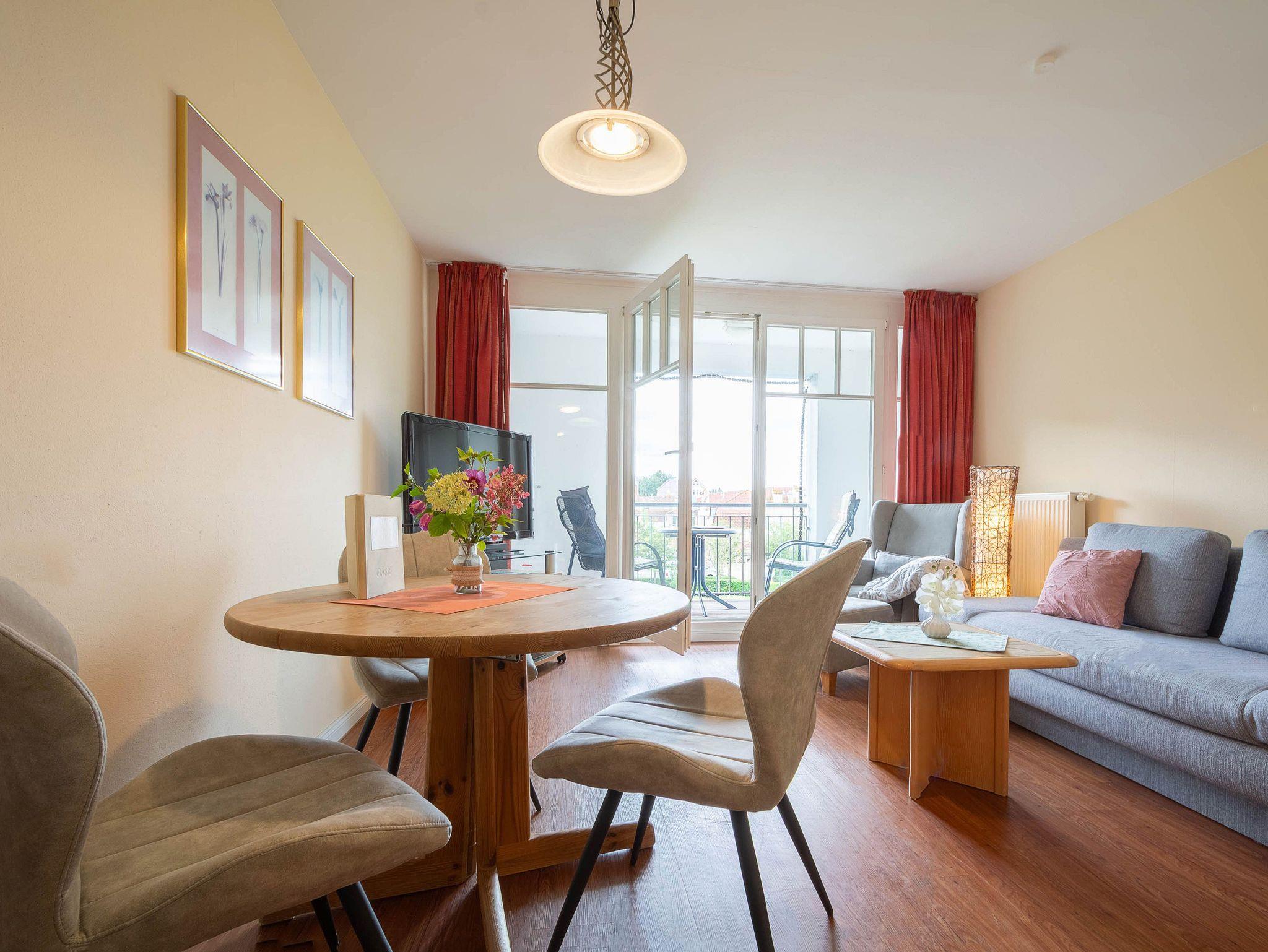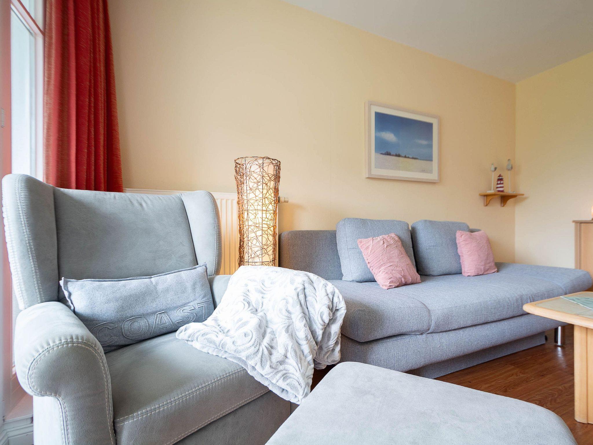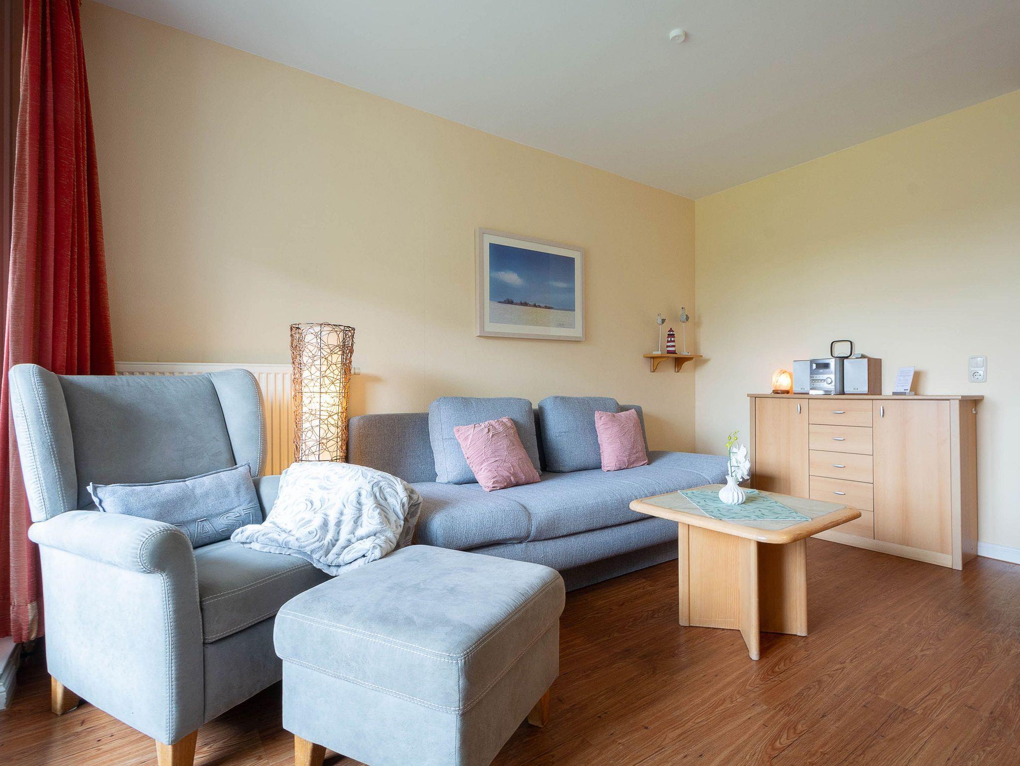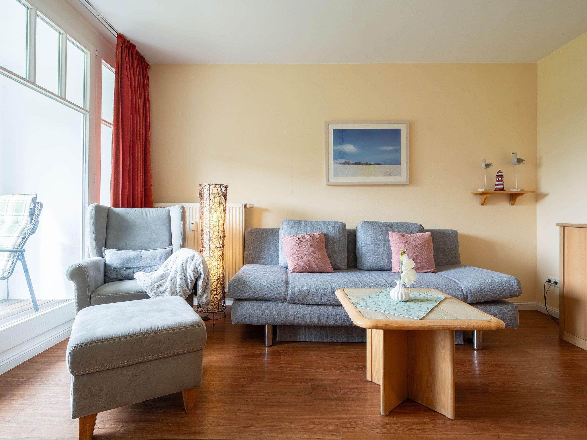 Die freundlich und komfortabel eingerichtete 2-Raum-Wohnung 2.11 im Haus Meeresblick befindet sich im 2. Obergeschoss des Hauses Meeresblick und ist nach Süden ausgerichtet. Sie eignet sich ideal für zwei Personen und bietet auf ca. 45 m² alles, was man für einen erholsamen Aufenthalt an der Küste braucht. Der helle Wohnbereich empfängt Sie mit einer gemütlichen Couchgarnitur, einem Sessel sowie einem Flachbild-TV und einem CD-Player. Von hier aus gelangen Sie auf den überdachten und geschützten Balkon, der mit einem Tisch und zwei Stühlen ausgestattet ist - perfekt, um die Sonne in windgeschützter Atmosphäre zu genießen.