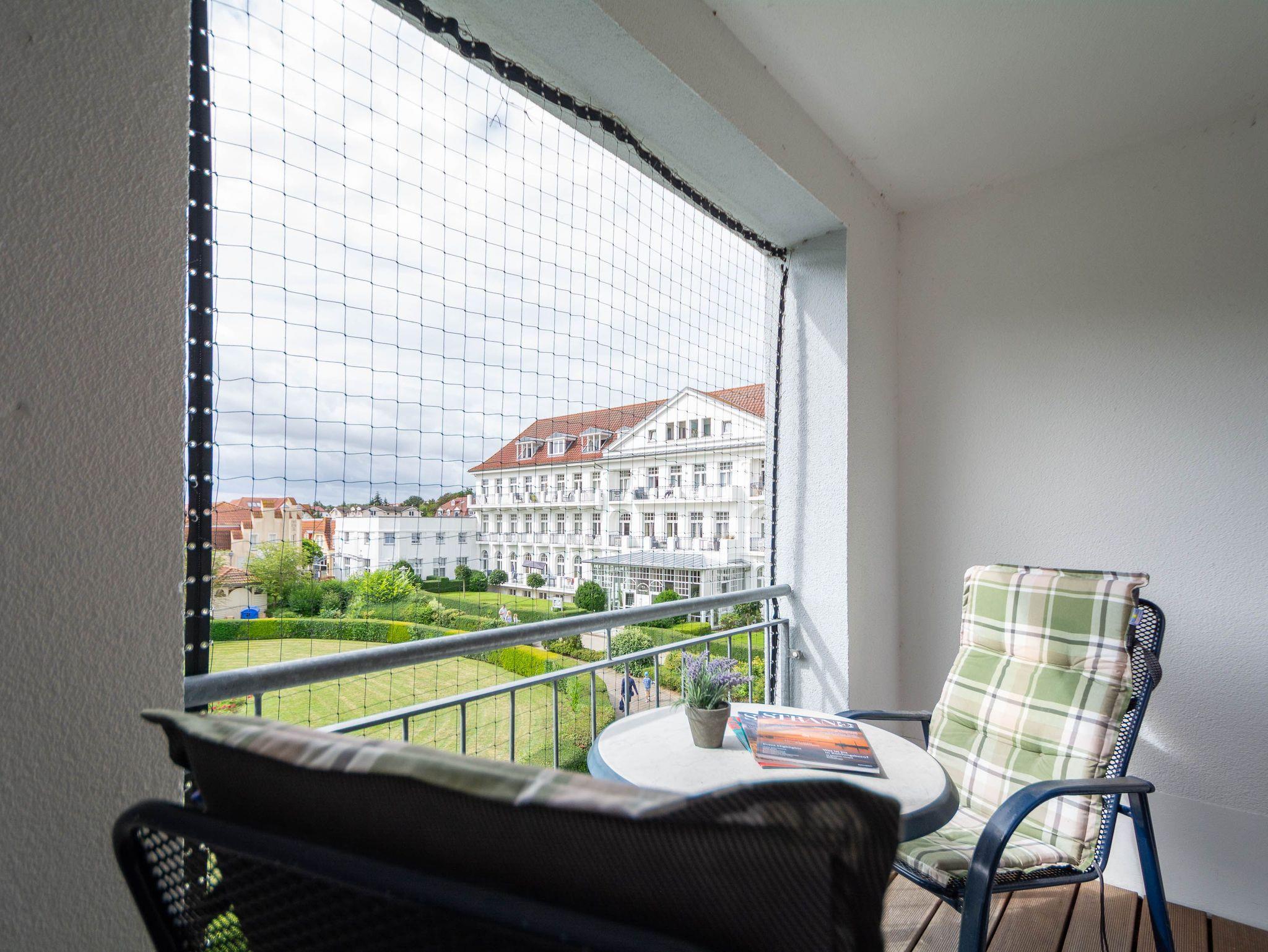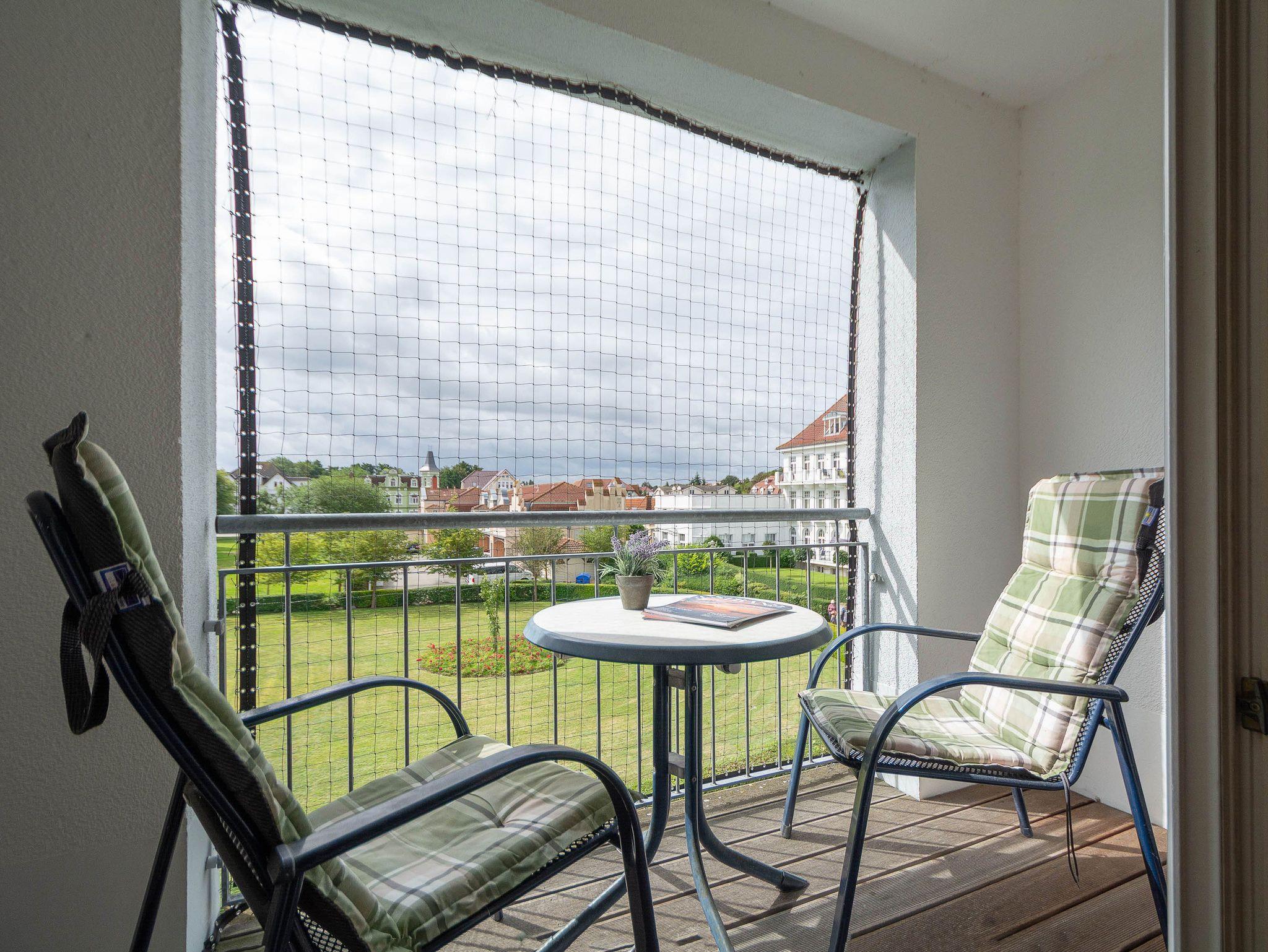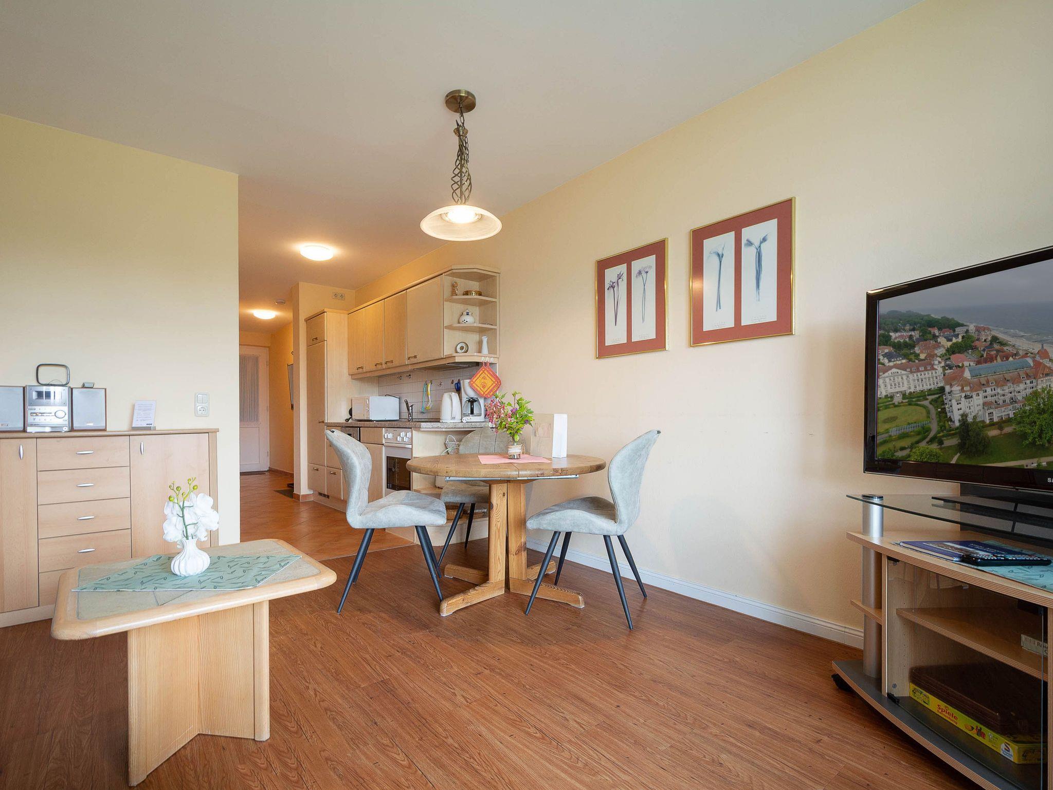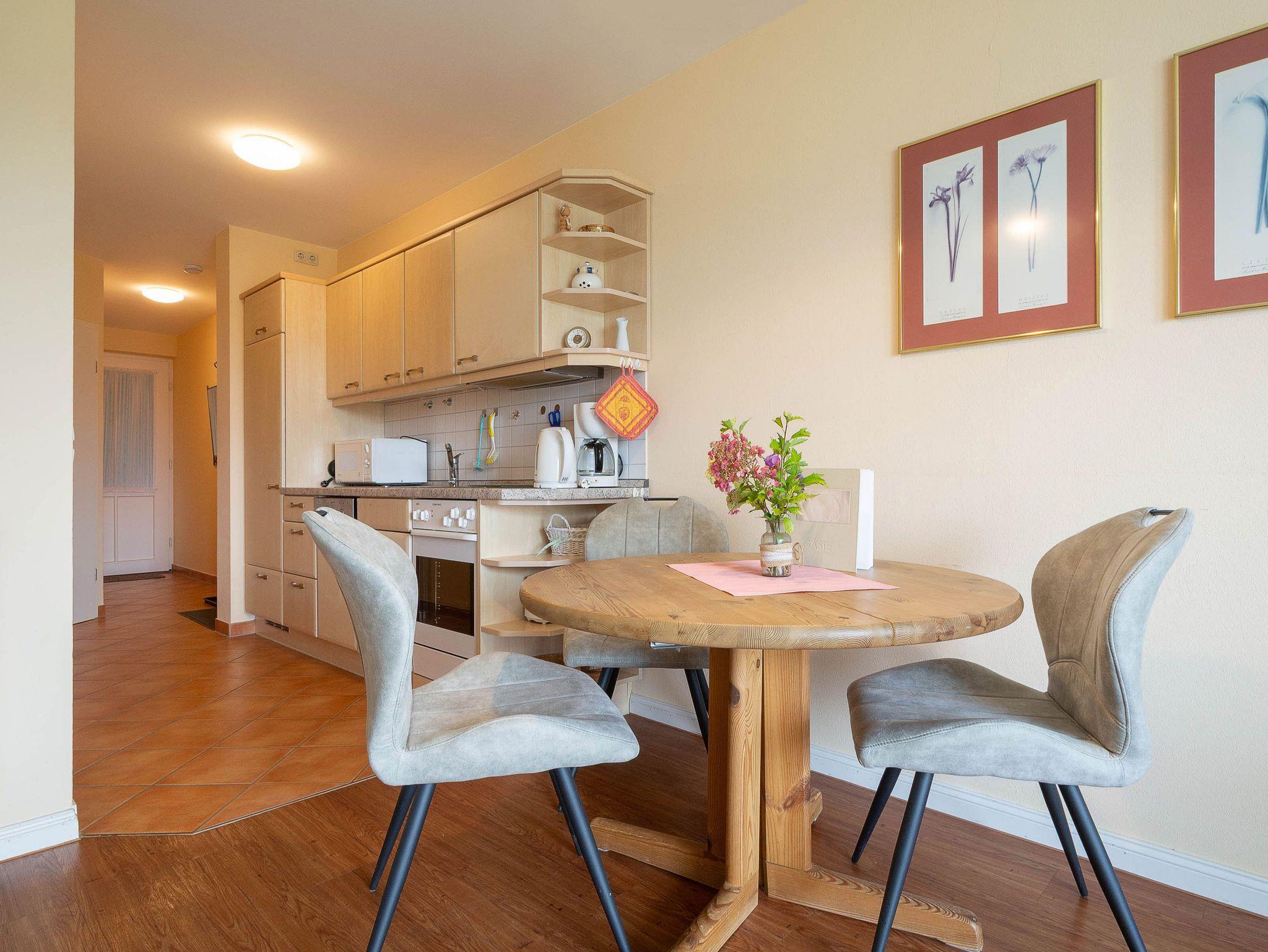 Die freundlich und komfortabel eingerichtete 2-Raum-Wohnung 2.11 im Haus Meeresblick befindet sich im 2. Obergeschoss des Hauses Meeresblick und ist nach Süden ausgerichtet. Sie eignet sich ideal für zwei Personen und bietet auf ca. 45 m² alles, was man für einen erholsamen Aufenthalt an der Küste braucht. Der helle Wohnbereich empfängt Sie mit einer gemütlichen Couchgarnitur, einem Sessel sowie einem Flachbild-TV und einem CD-Player. Von hier aus gelangen Sie auf den überdachten und geschützten Balkon, der mit einem Tisch und zwei Stühlen ausgestattet ist - perfekt, um die Sonne in windgeschützter Atmosphäre zu genießen.