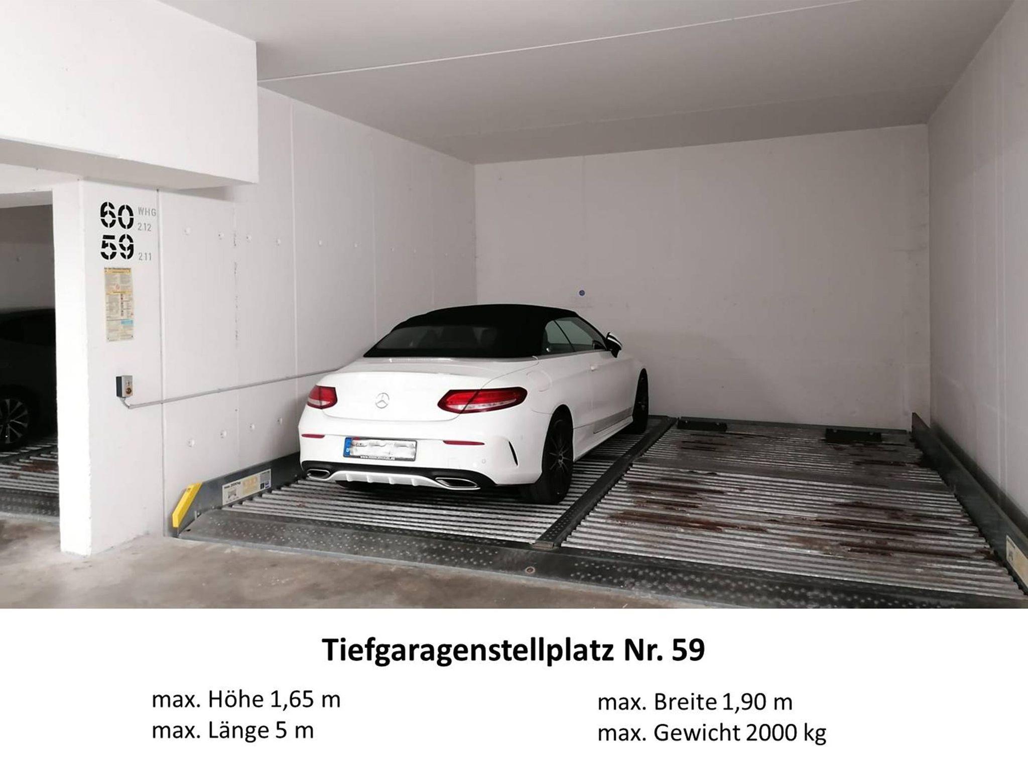 Zur Wohnung gehört ein Tiefgaragenstellplatz mit der Stellplatznummer 59. Dabei handelt es sich um eine Doppelparkeranlage (Standardanlage bei Stellplatzbreite 2,30 m, untere Plattform). Auf der unteren Plattform können Pkw und Kombi bis zu einer Höhe von 1,65 m abgestellt werden. Bitte beachten Sie, dass Ihr Pkw folgende Angaben nicht überschreitet: