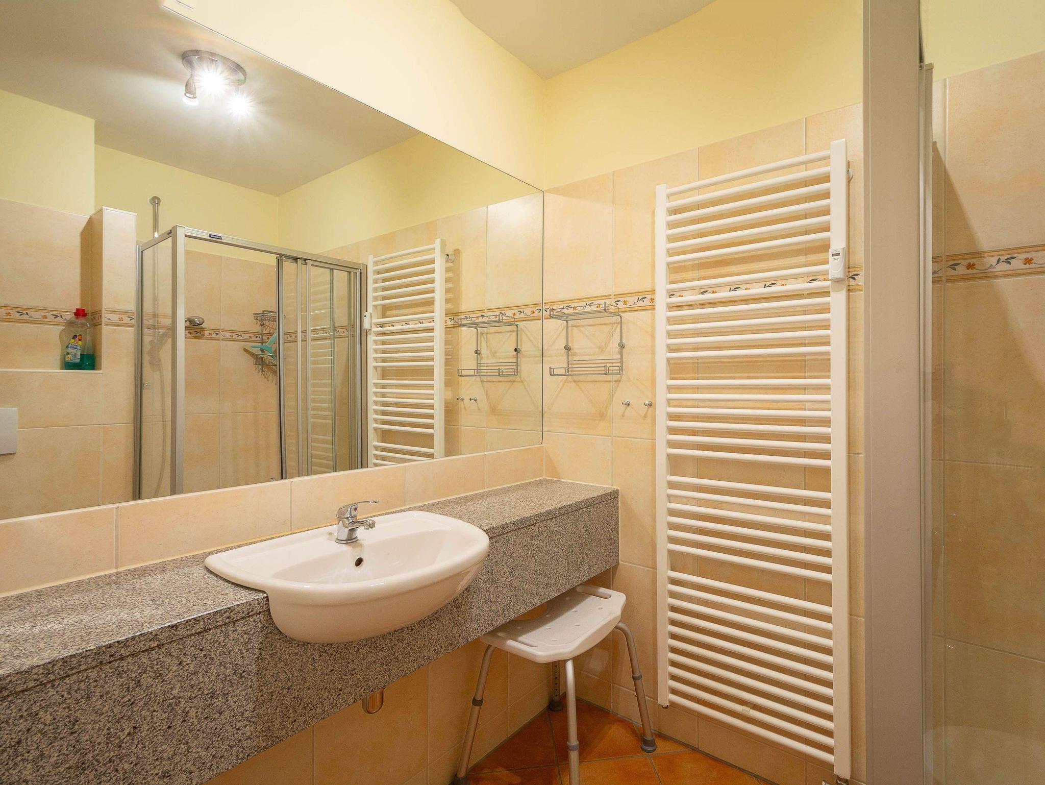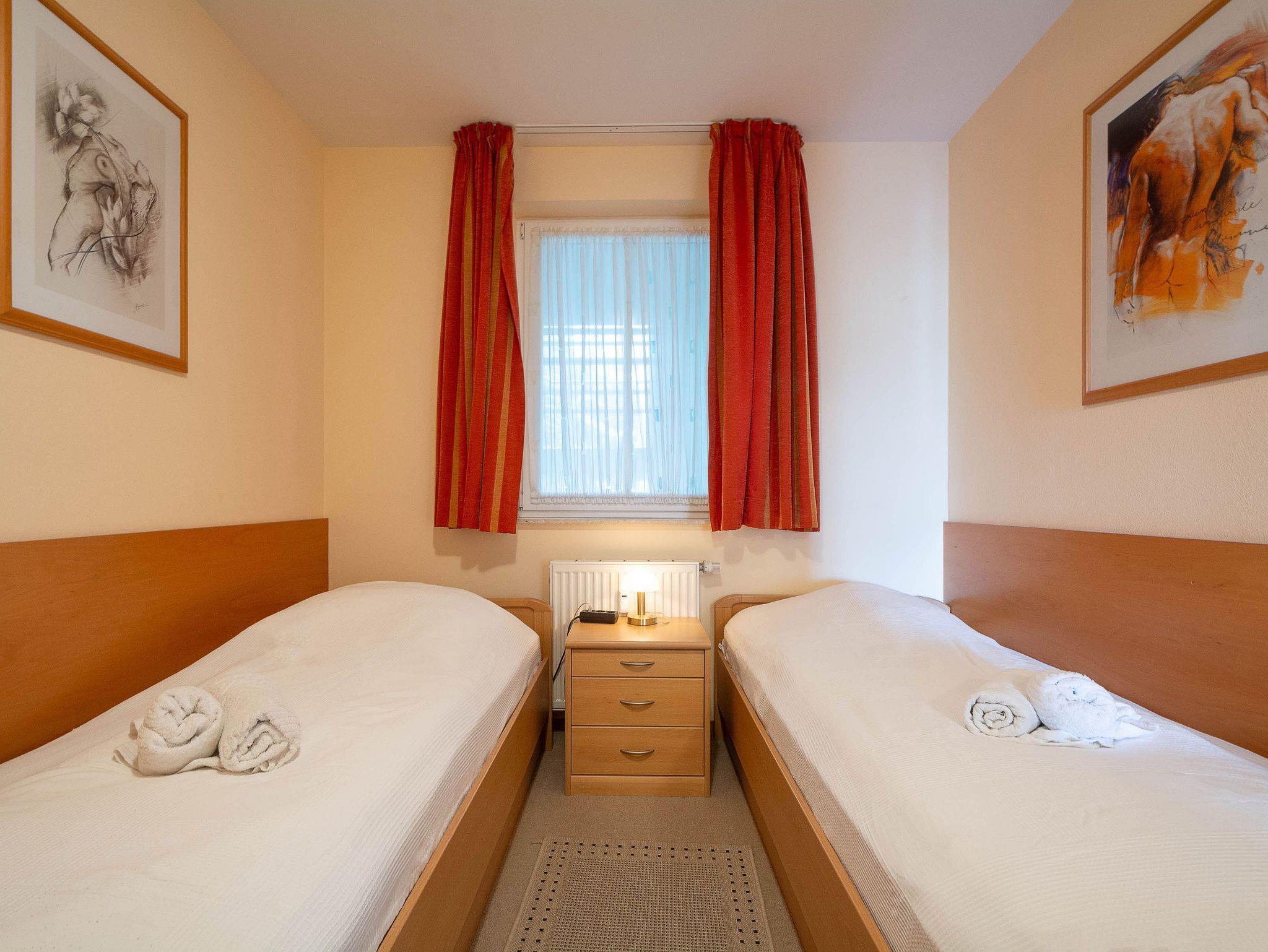 Das Schlafzimmer ist zum ruhigen Atrium des Hauses ausgerichtet und mit zwei Einzelbetten sowie einem großzügigen Kleiderschrank ausgestattet. Das moderne Bad verfügt über eine Dusche mit niedrigem Einstieg, ein WC und einen Handtuchheizkörper.