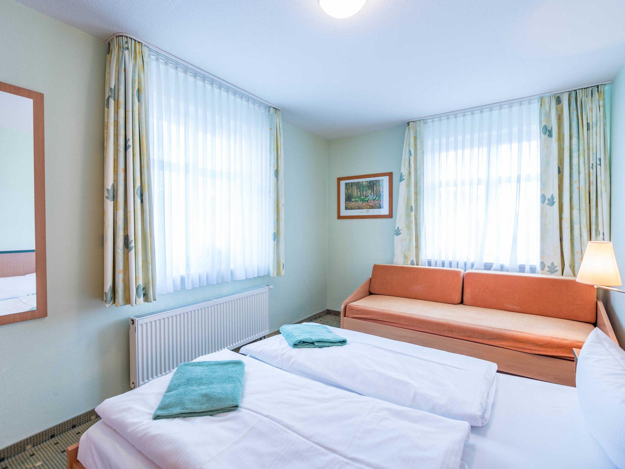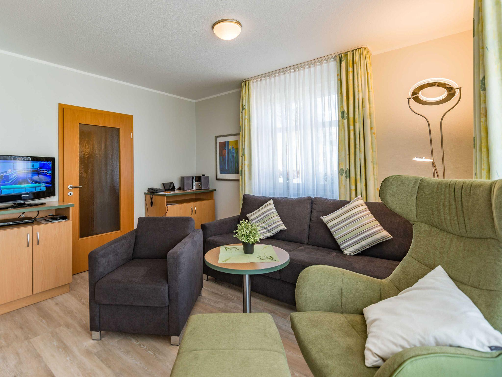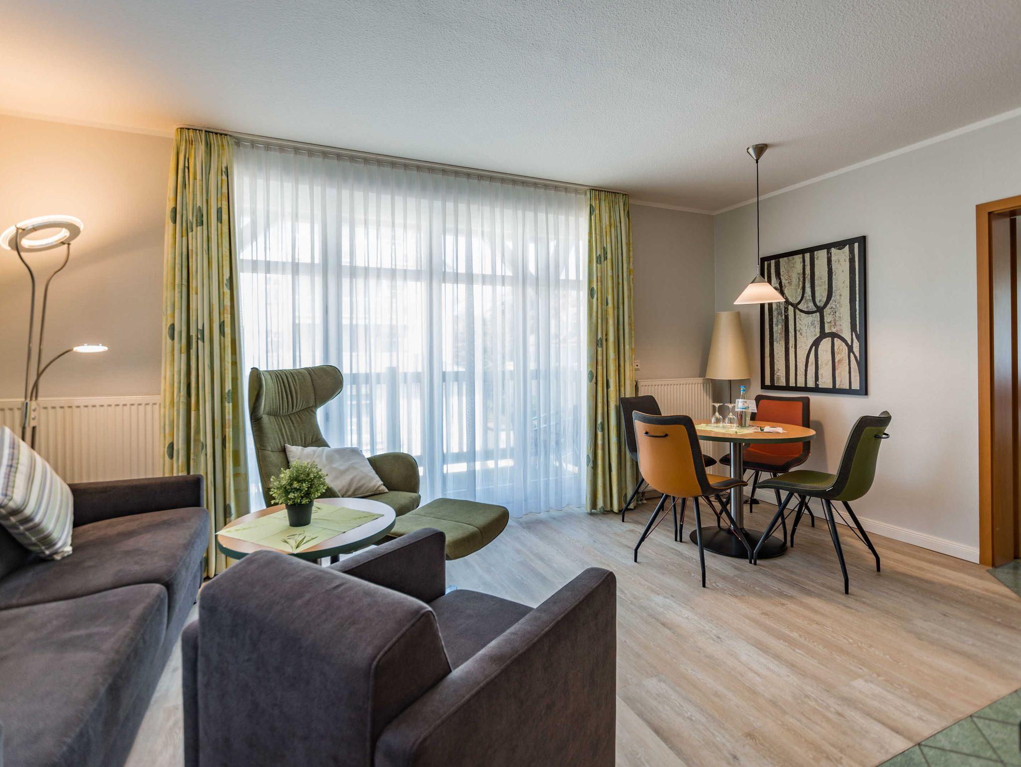 Das 2-Zimmer-Apartment mit Teppichboden befindet sich in der 2.Etage des Hauses Waldeck. Mit rund 50 m² Wohnfläche und einem Balkon zur Nordseite, besteht das geräumige Apartment aus einem Wohnzimmer mit Schlafcouch und einer voll ausgestatteten Küchenzeile mit Geschirrspülmaschine, Kühlschrank, Mikrowelle, Zwei-Platten-Cerankochfeld, Kaffeemaschine, Wasserkocher und einem Toaster. Das Schlafzimmer verfügt über ein Doppelbett und ein Einzelbett, darüber hinaus bietet es genügend Platz für ein Kinderbett. Im Badezimmer befindet sich eine Badewanne, ein Fön wird Ihnen zur Verfügung gestellt. Das Apartment ist für maximal 3 Erwachsene und insgesamt 4 Personen geeignet.