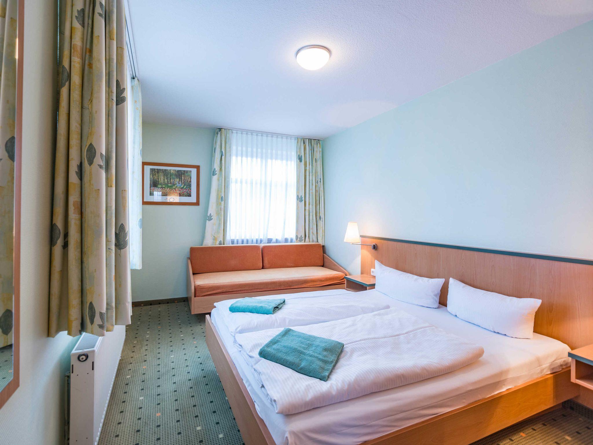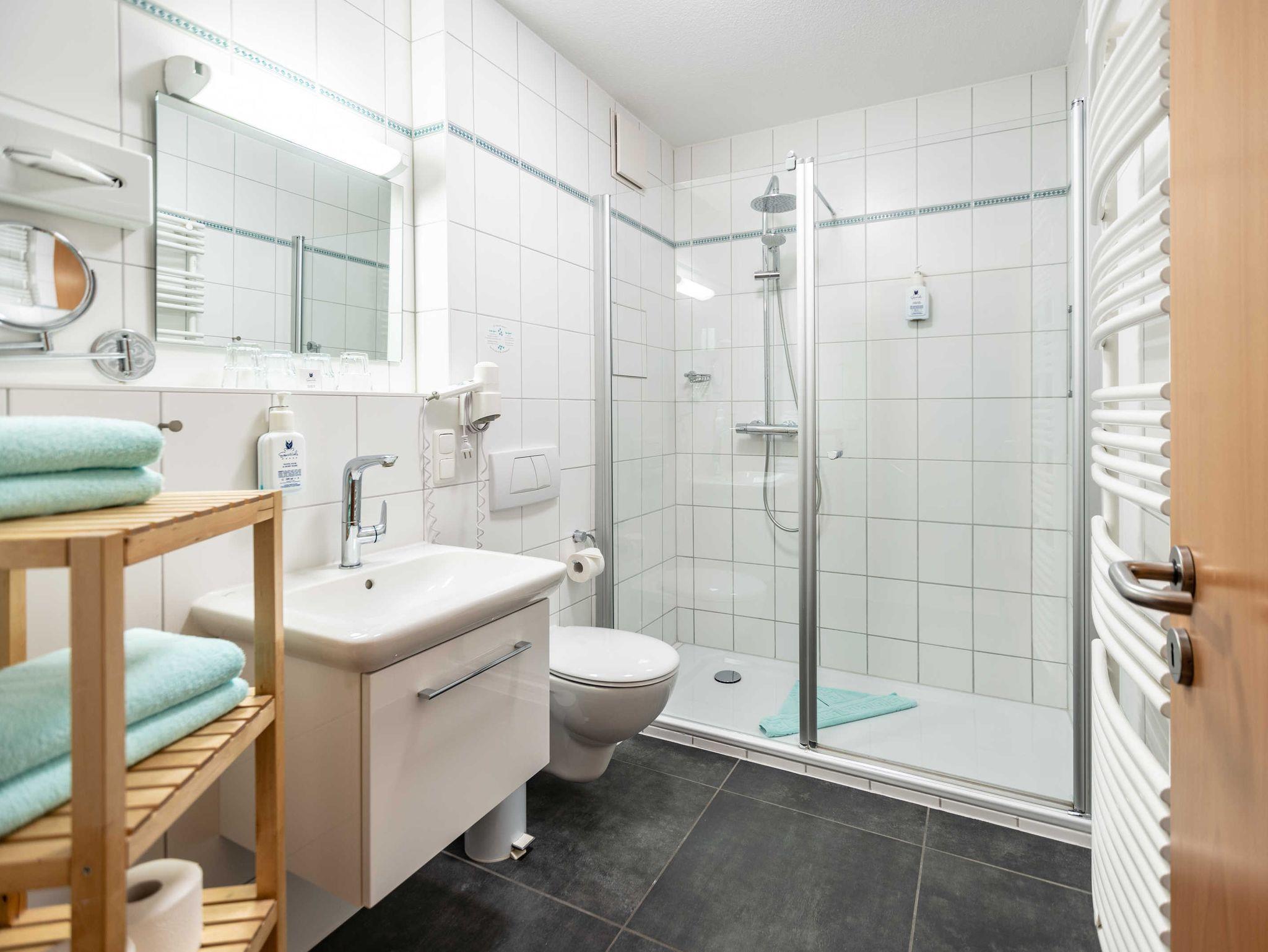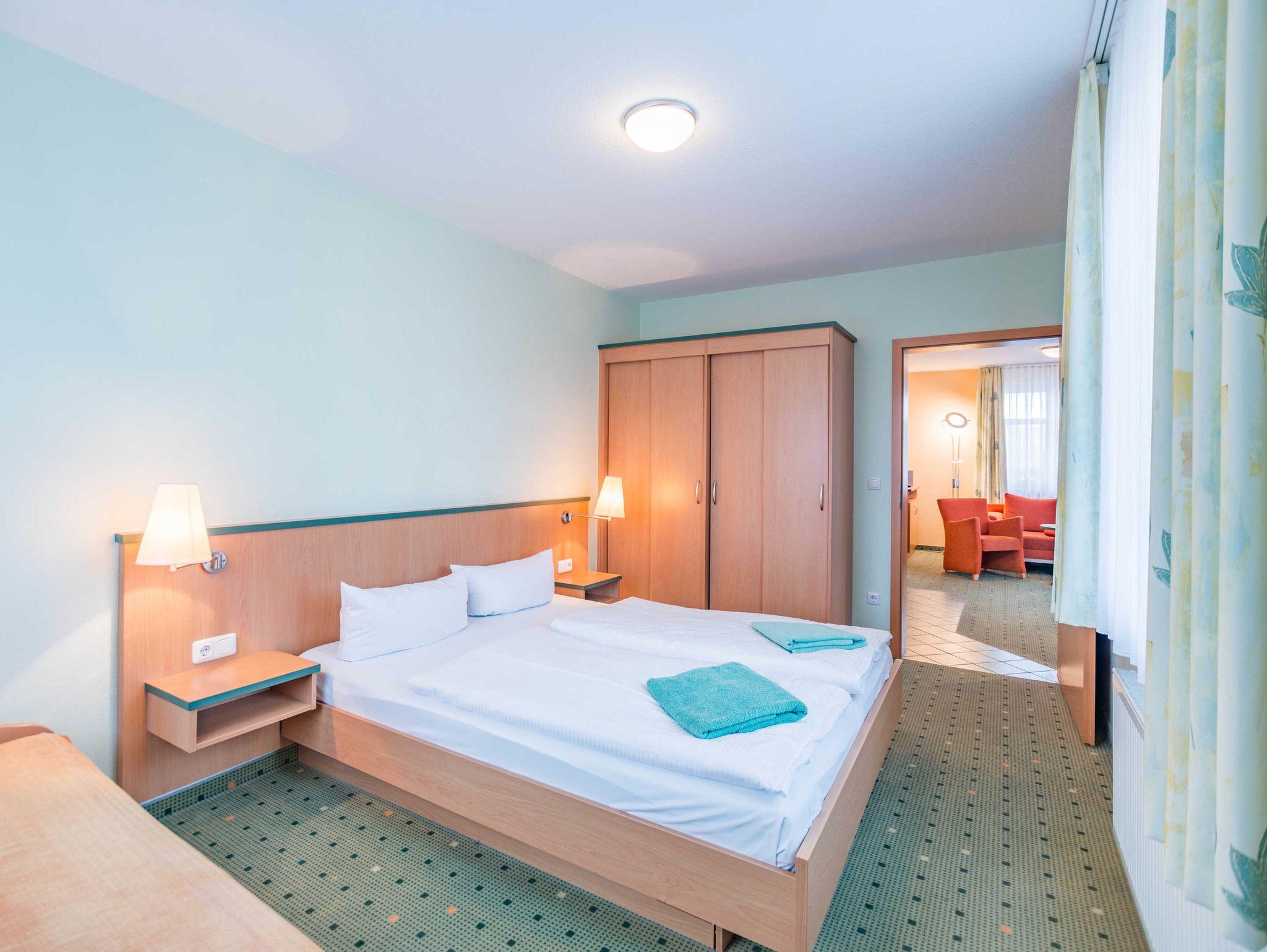 Das 2-Zimmer-Apartment mit Teppichboden befindet sich in der 2.Etage des Hauses Waldeck. Mit rund 50 m² Wohnfläche und einem Balkon zur Nordseite, besteht das geräumige Apartment aus einem Wohnzimmer mit Schlafcouch und einer voll ausgestatteten Küchenzeile mit Geschirrspülmaschine, Kühlschrank, Mikrowelle, Zwei-Platten-Cerankochfeld, Kaffeemaschine, Wasserkocher und einem Toaster. Das Schlafzimmer verfügt über ein Doppelbett und ein Einzelbett, darüber hinaus bietet es genügend Platz für ein Kinderbett. Im Badezimmer befindet sich eine Badewanne, ein Fön wird Ihnen zur Verfügung gestellt. Das Apartment ist für maximal 3 Erwachsene und insgesamt 4 Personen geeignet.