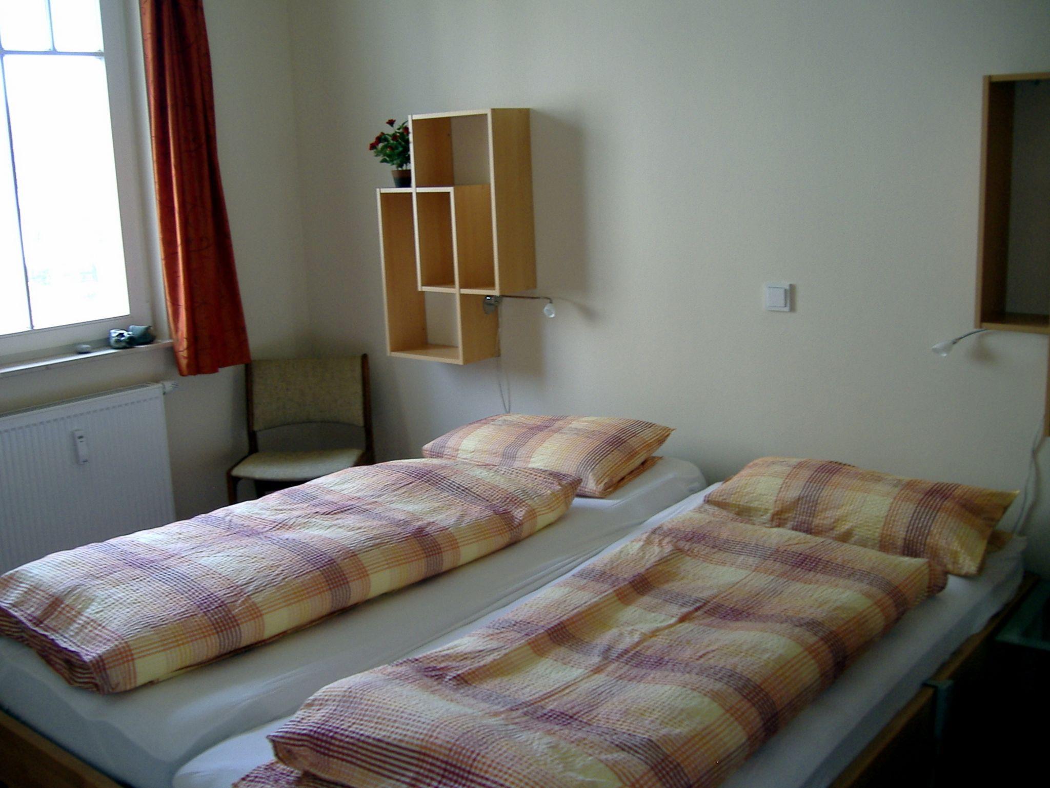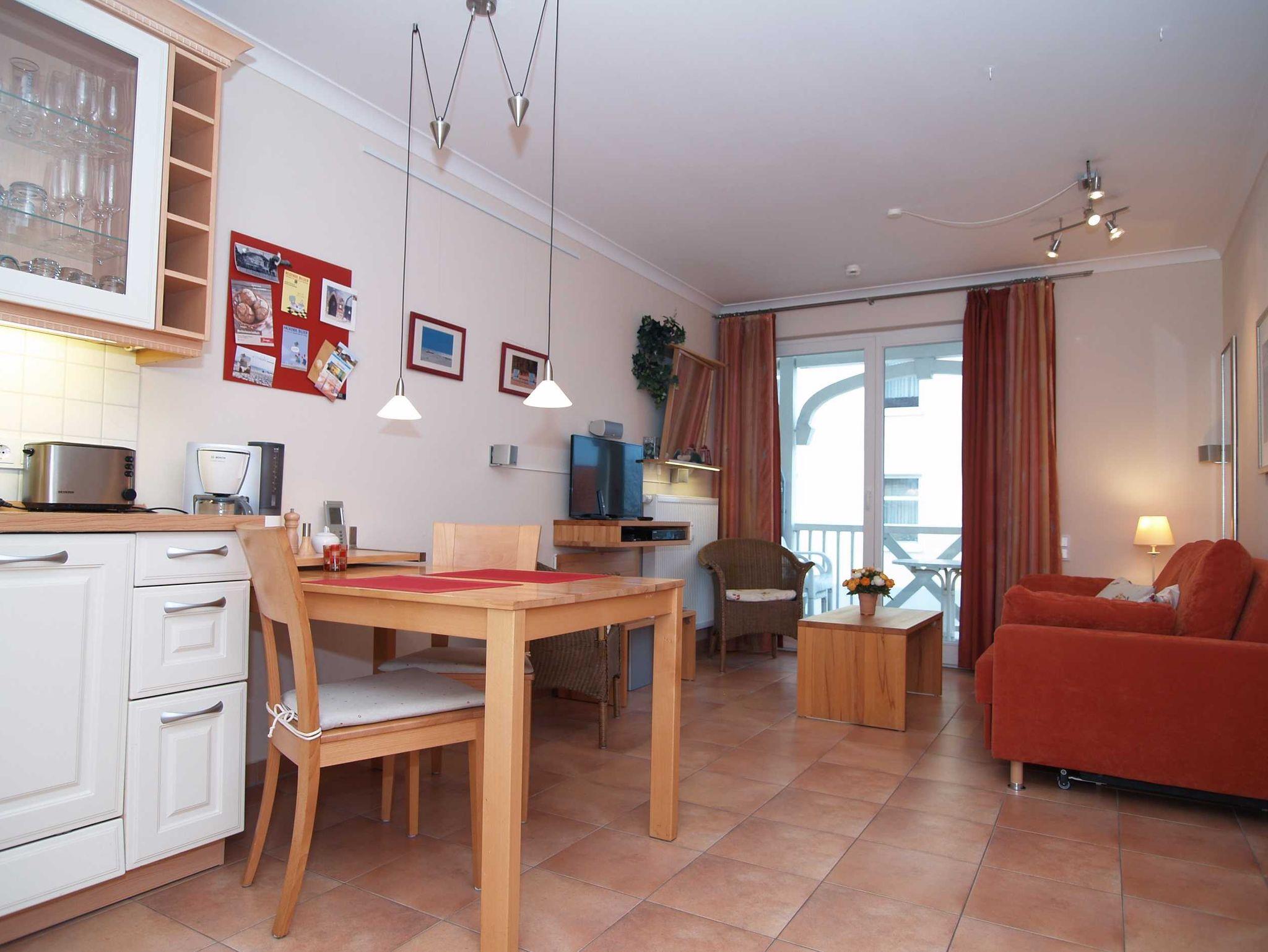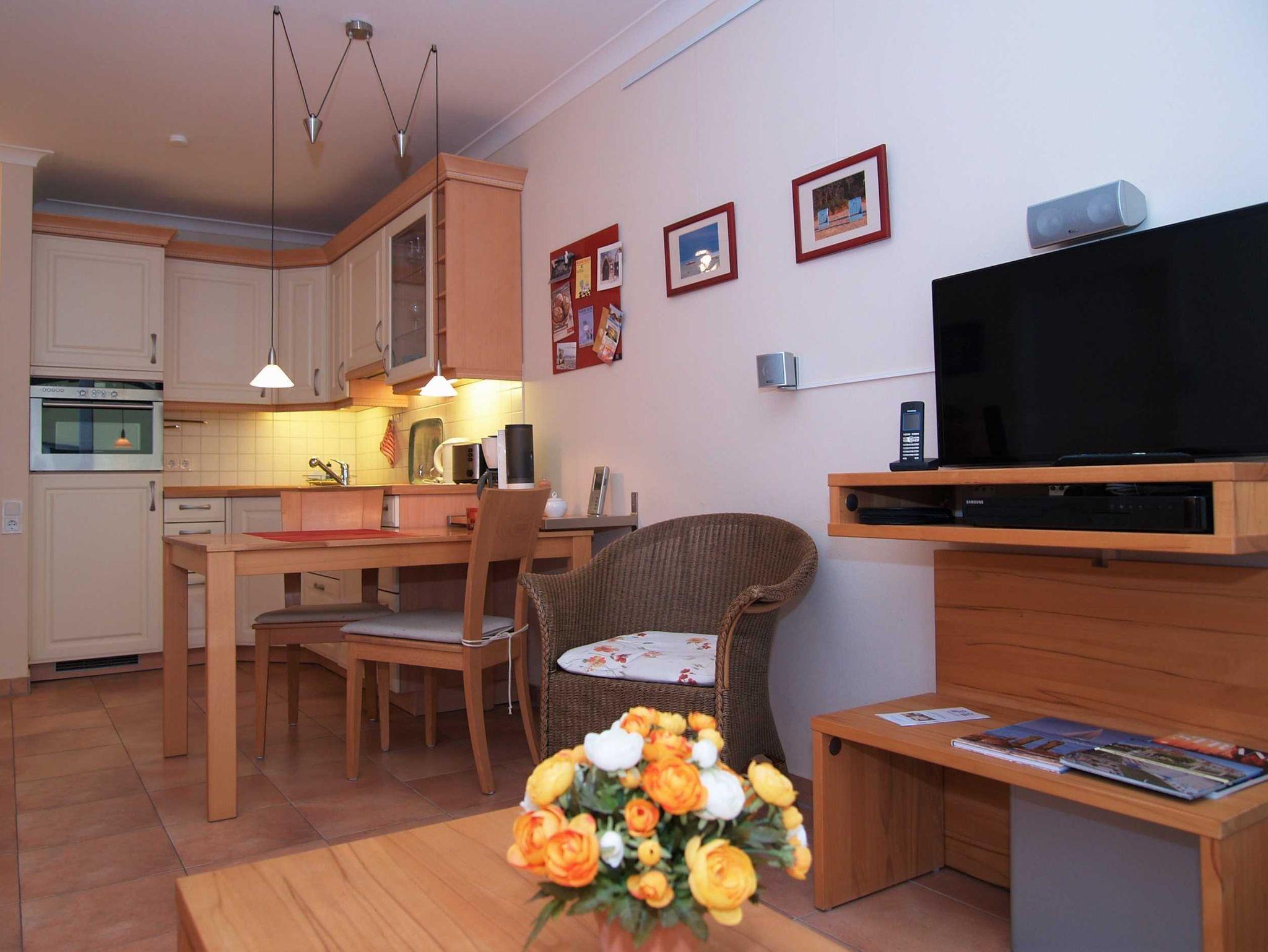 Sie wohnen in einer 2-Raum-Wohnung von ca. 39 m² Größe, die sich im ersten Obergeschoss befindet. Das Wohnzimmer ist ausgestattet mit Küchenzeile (Induktionsherd mit 4 Kochstellen, Geschirrspüler, Mikrowelle), bequemer Sitzgarnitur, Radio und TV-Gerät. Ein Schlafzimmer mit großem Doppelbett und Kleiderschrank sowie das Bad mit Dusche und WC vervollständigen das Gesamtbild dieser Wohnung.