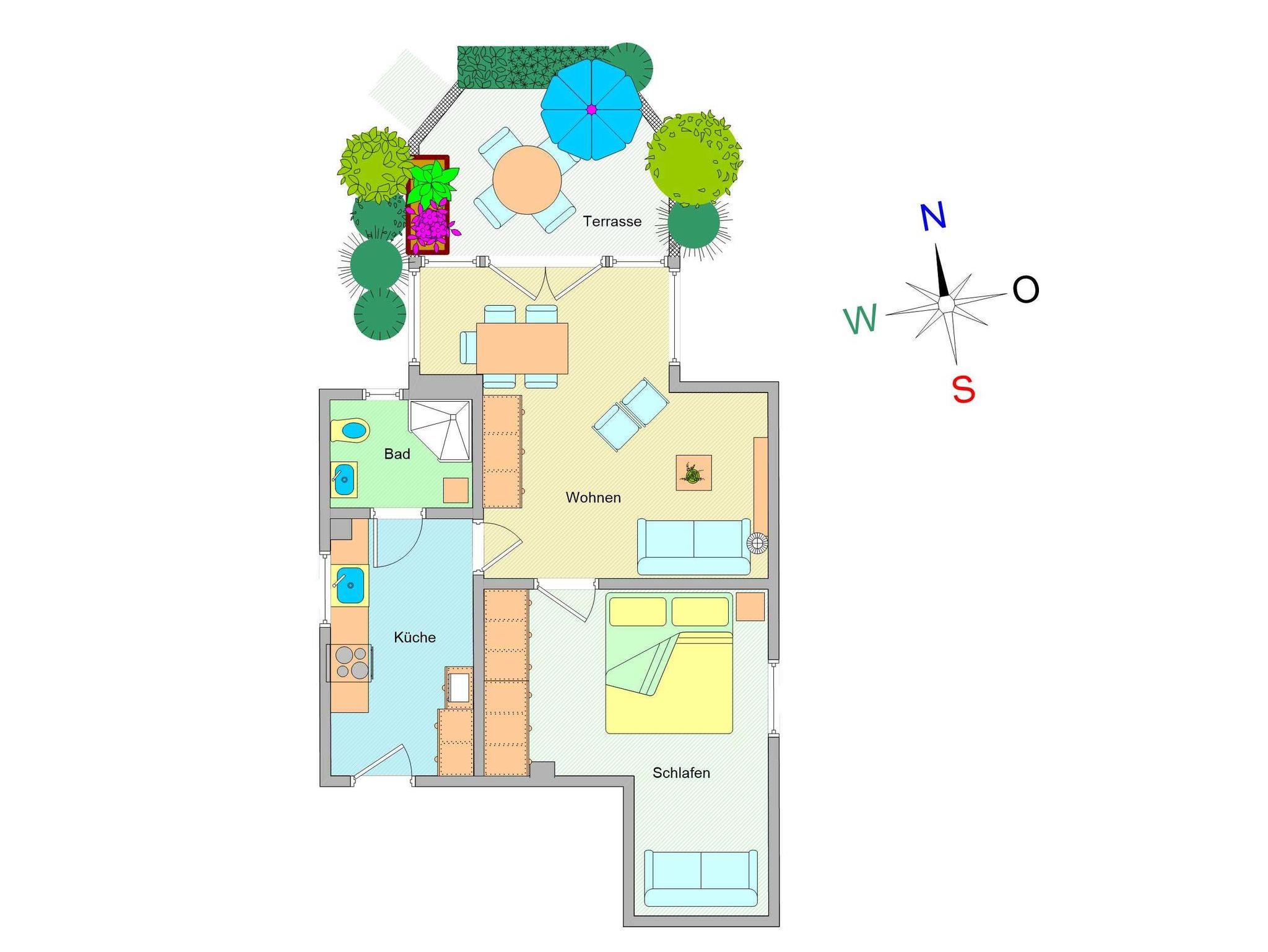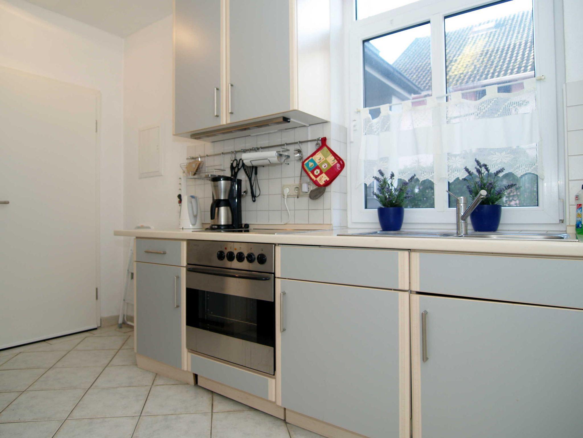 Sie wohnen in einer ca. 48m² großen 2-Raum-Wohnung, die sich im Erdgeschoss einer Villa befindet. Der Wohnraum ist ausgestattet mit einer Schlafcouch, einer Essecke und TV. Von hier gelangen Sie auf die nach Norden ausgerichtete bepflanzte Terrasse. Die separate Küche ist mit allen wichtigen Küchenutensilien ausgestattet. Im Schlafzimmer finden Sie ein Doppelbett und einen großen Kleiderschrank. Das Bad mit Großdusche und WC vervollständigt das Gesamtbild dieser Wohnung.