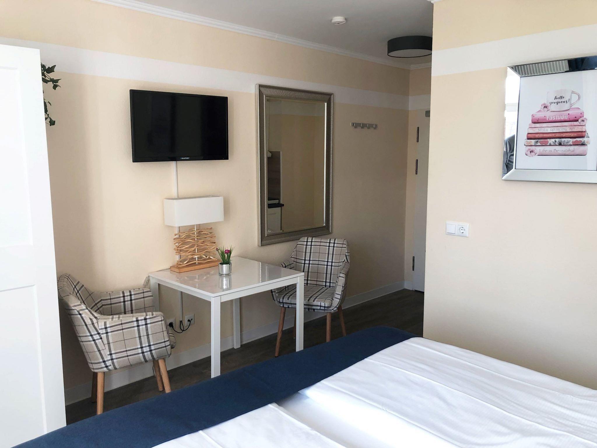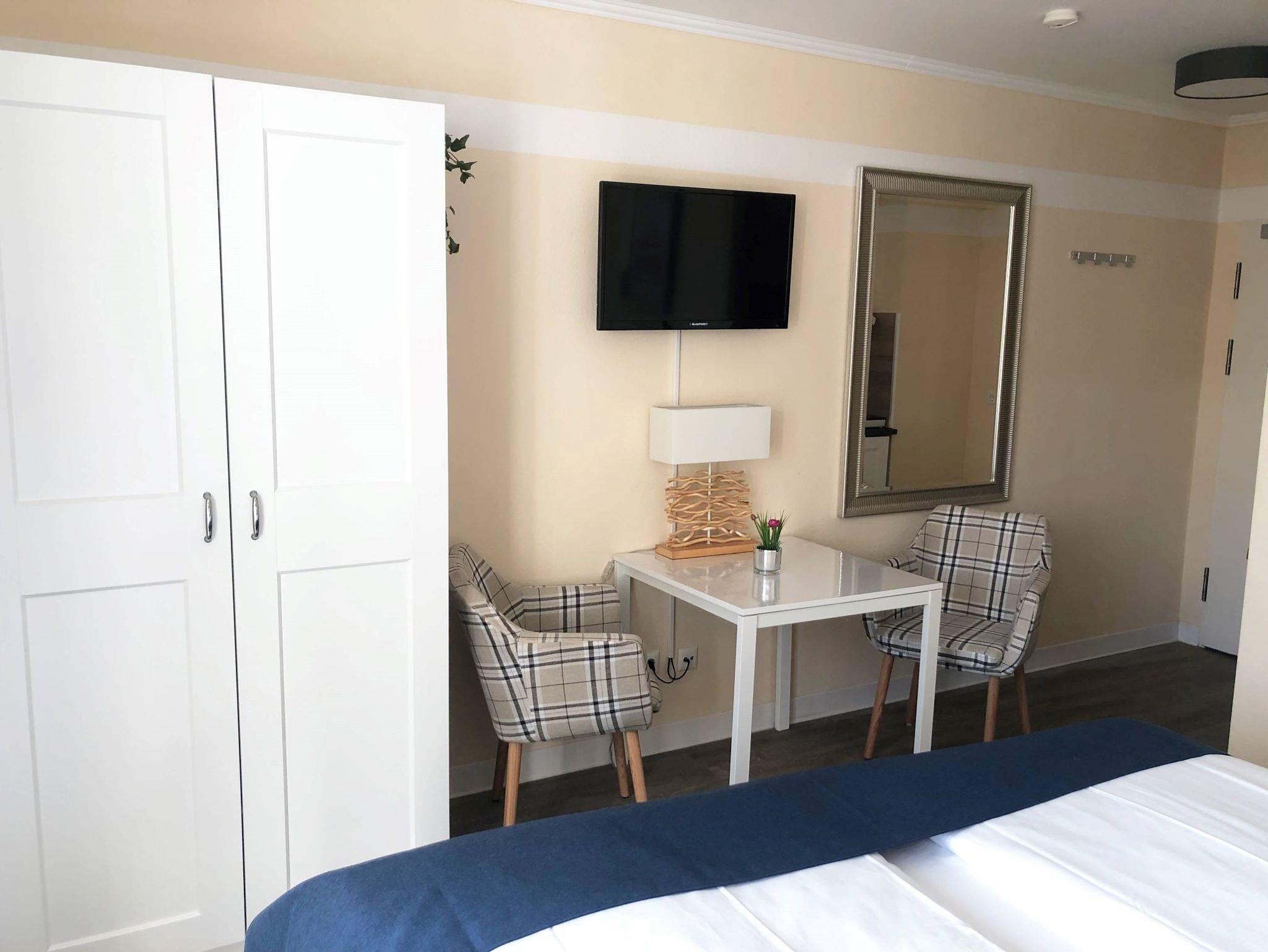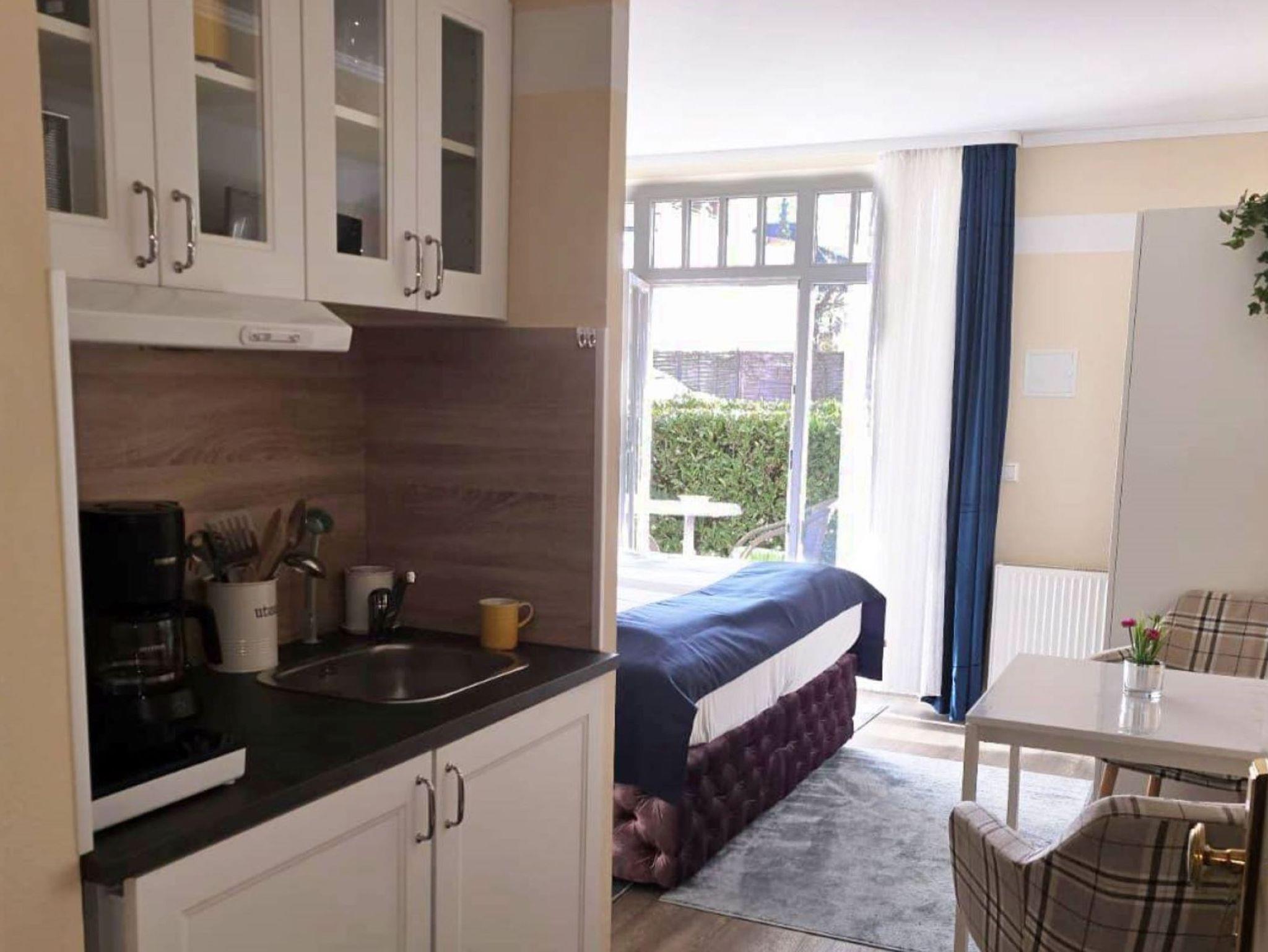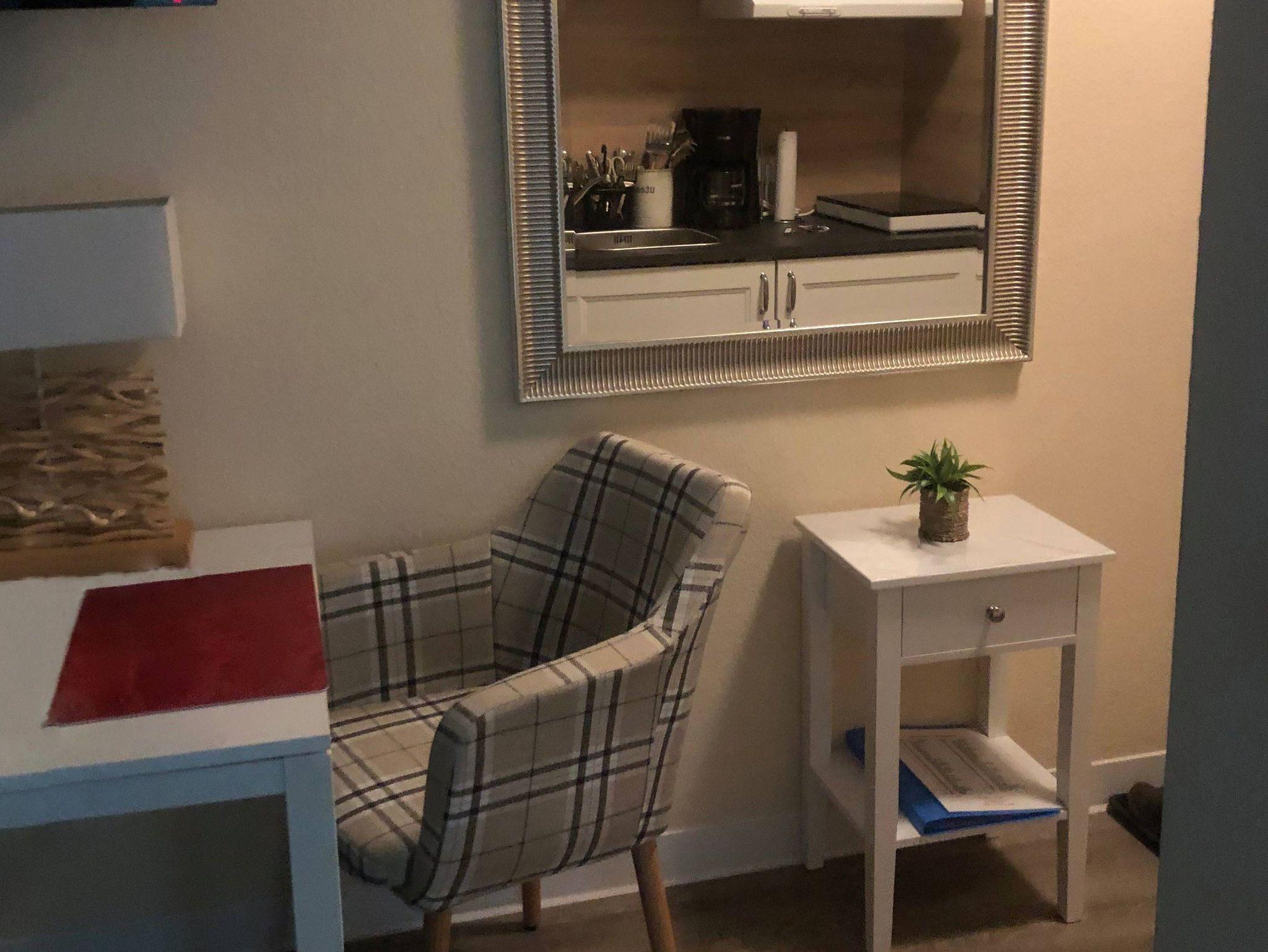 Das Studio verfügt über eine kleine Küche mit zwei Platten Induktionsfeld, Kühlschrank mit Gefrierfach, Kaffeemaschine, Wasserkocher, Toaster sowie einer kompletten Geschirr Ausstattung und Kochgeschirr. An der Wand befindet sich ein Flachbild TV, kostenfreies WLAN ist verfügbar. Die kleine ebenerdige Terrasse lädt zu einer gemütlichen Pause ein.