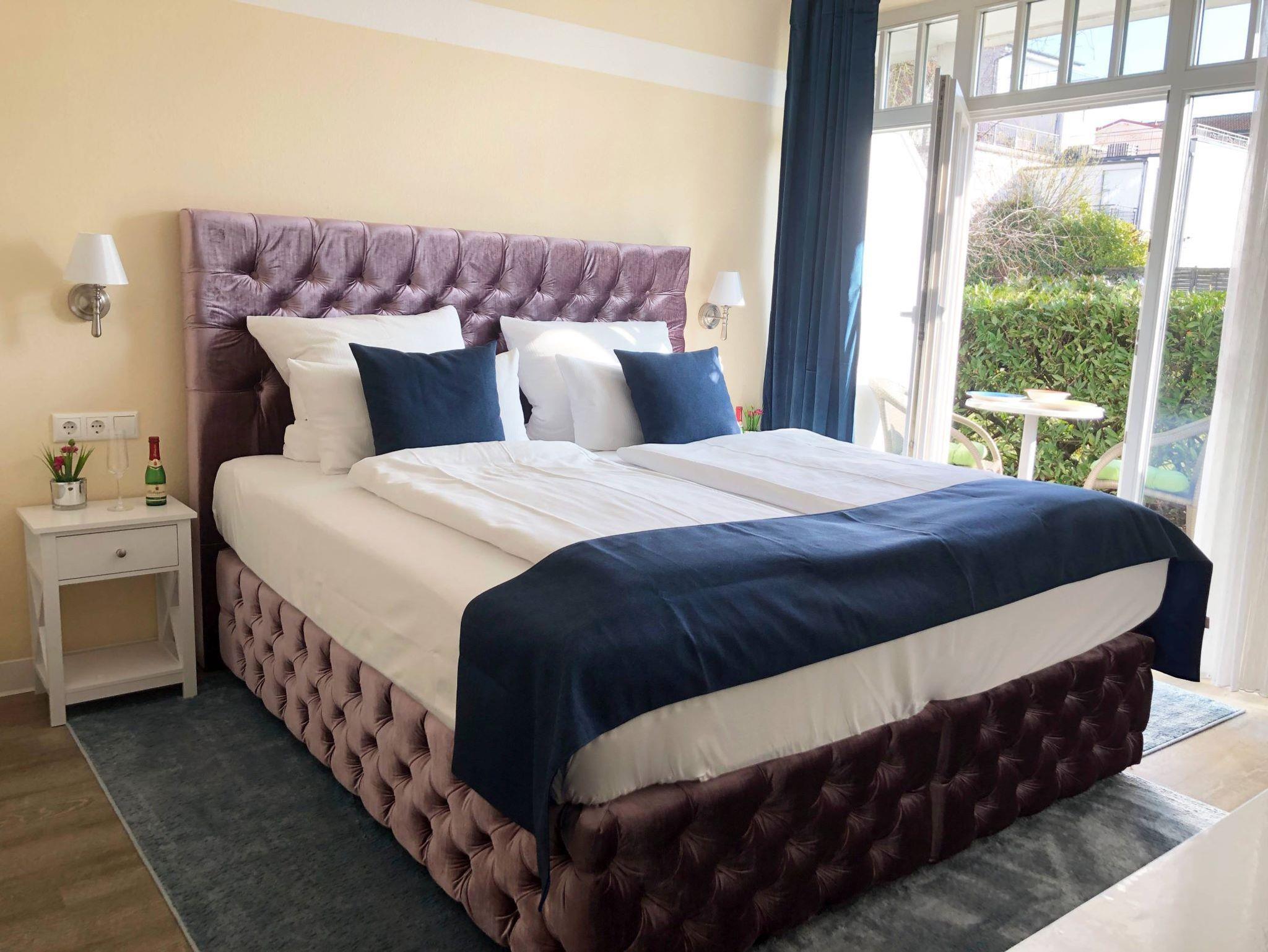 Das Kingsize Boxspringbett (1,80 x 2,00 m) mit zwei separaten Matratzen und mit einer Auswahl verschiedener bequemer Kissen, lädt zu einer entspannten nächtlichen Erholung ein.