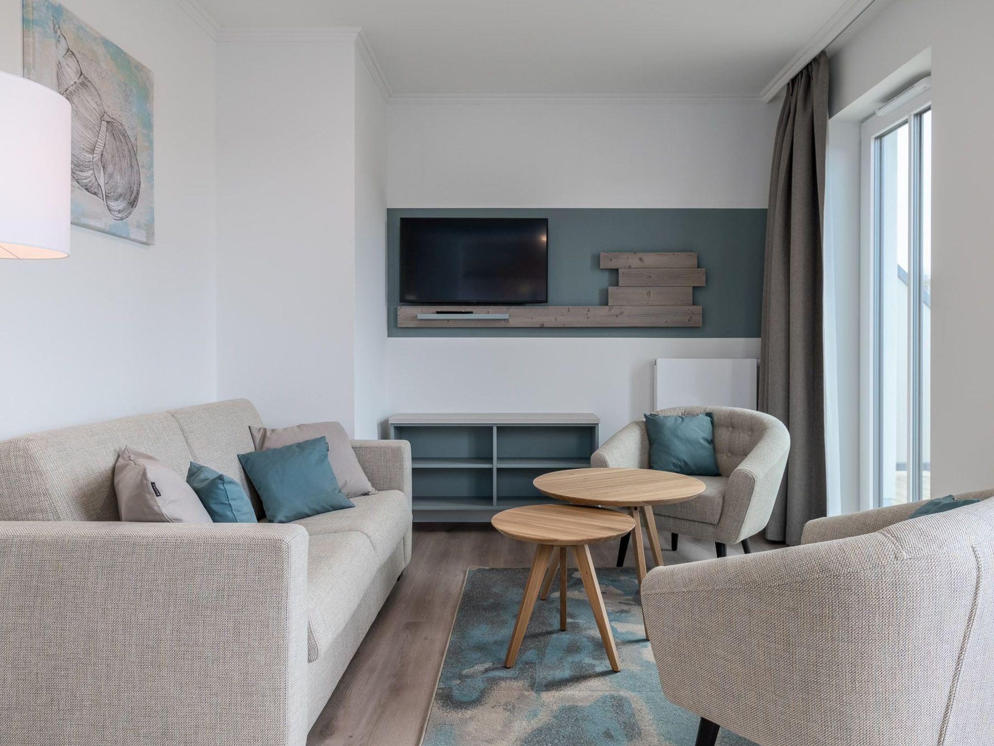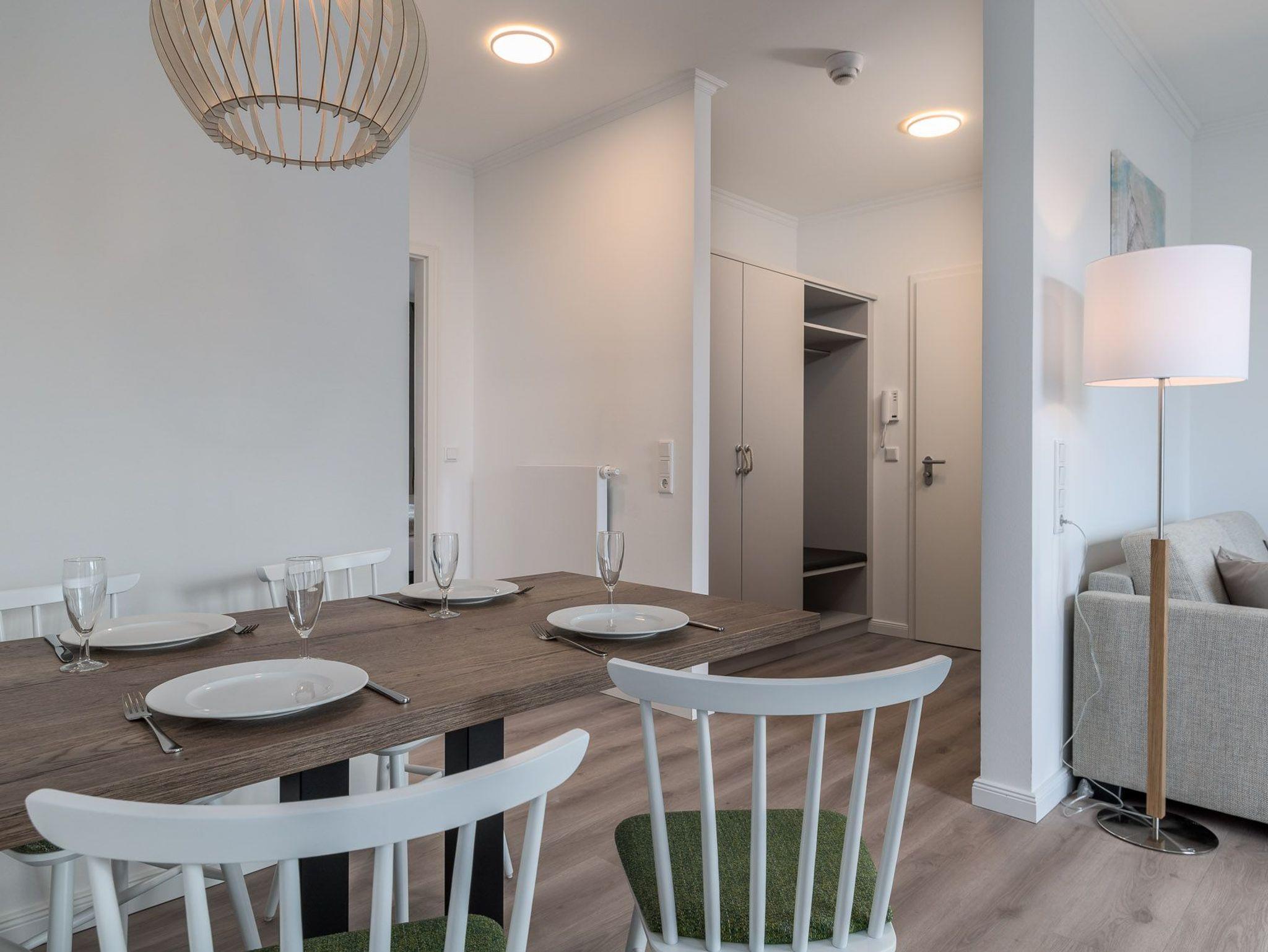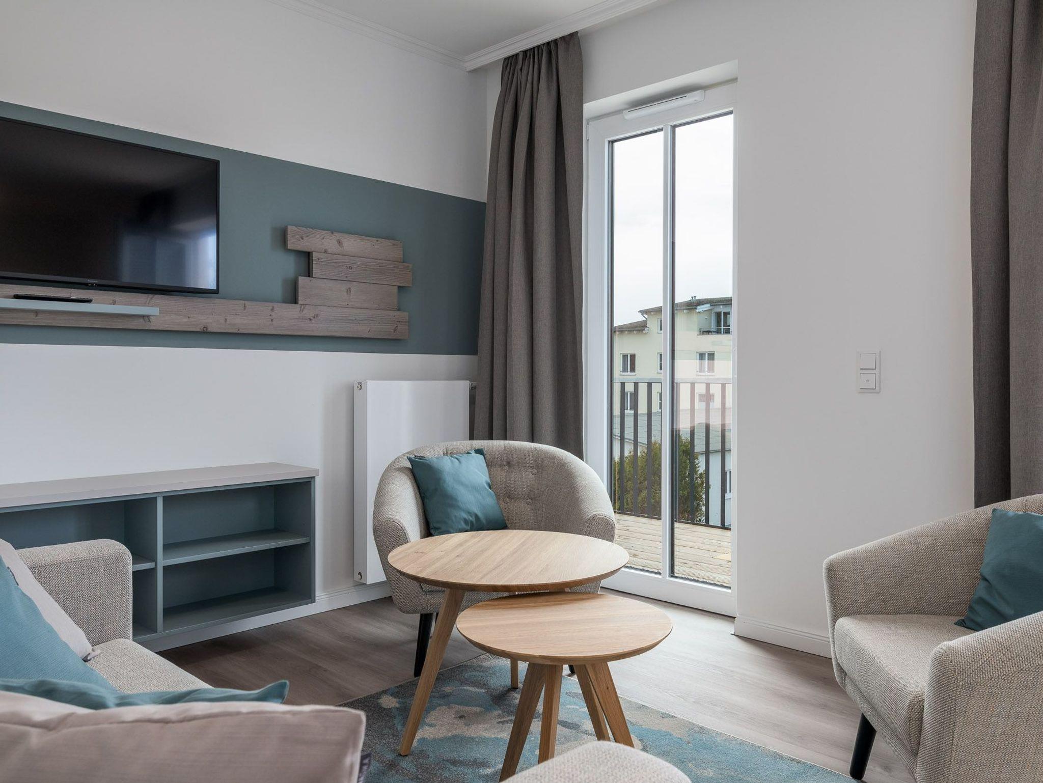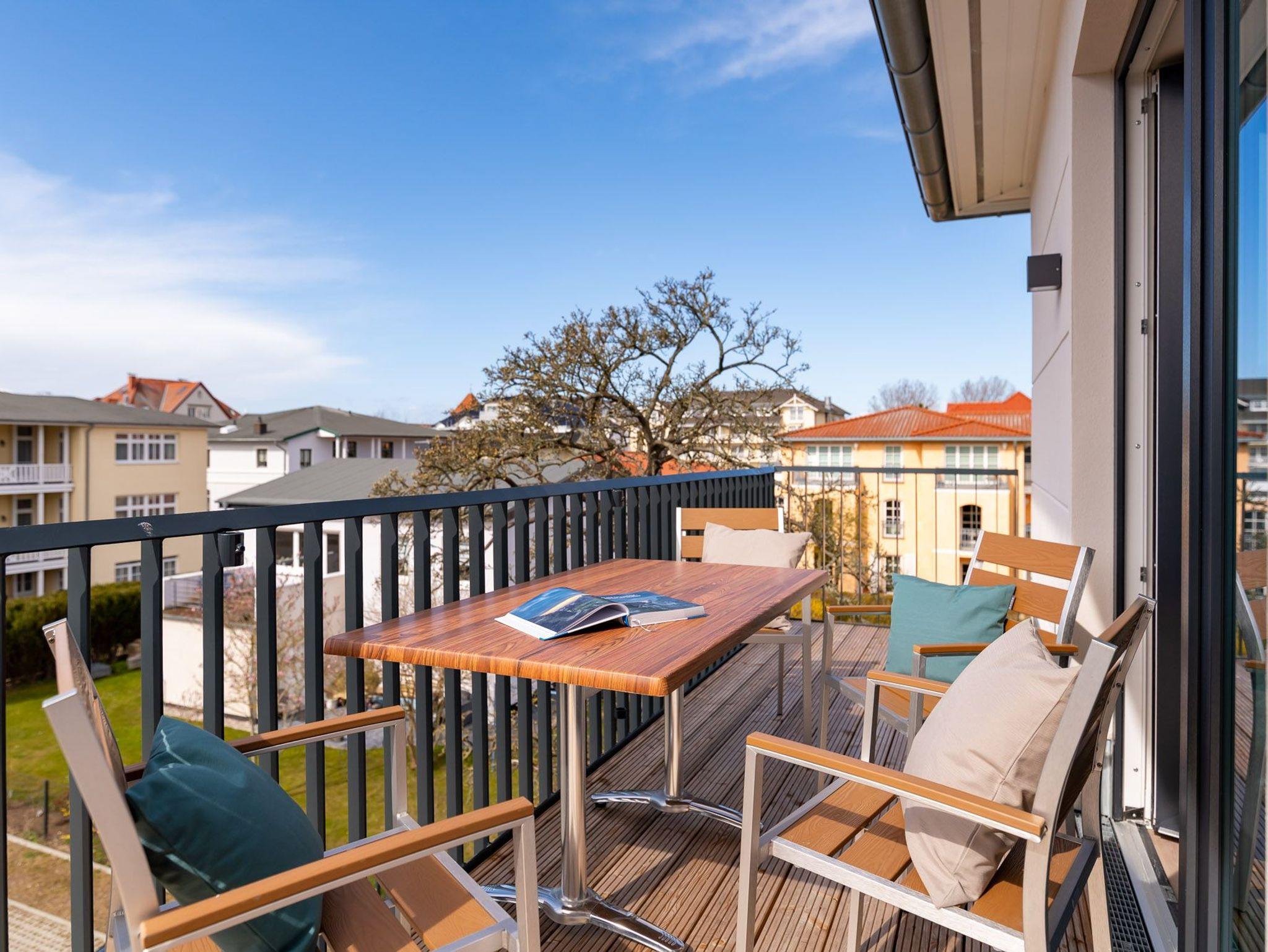 Das Einzimmer-Apartment bietet genügend Platz für 4 Personen und befindet sich im 2 Obergeschoss und ist bequem mit dem Fahrstuhl zu erreichen. Außerdem verfügt es neben seiner Wohnfläche von ca. 57 qm auch über einen großen Balkon mit Balkonmöbeln.