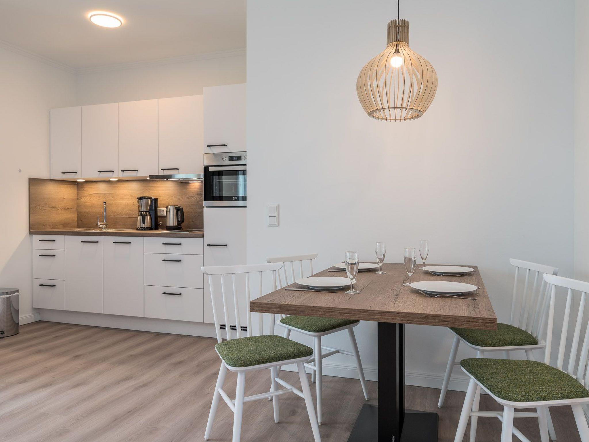 Das Bad verfügt über eine Dusche, einem Haartrockner und einem Handtuchtrockner. Zu Ihrem Apartment gehört ebenfalls ein großer und lichtdurchfluteter Wohn- und Essbereich mit offener Küche.