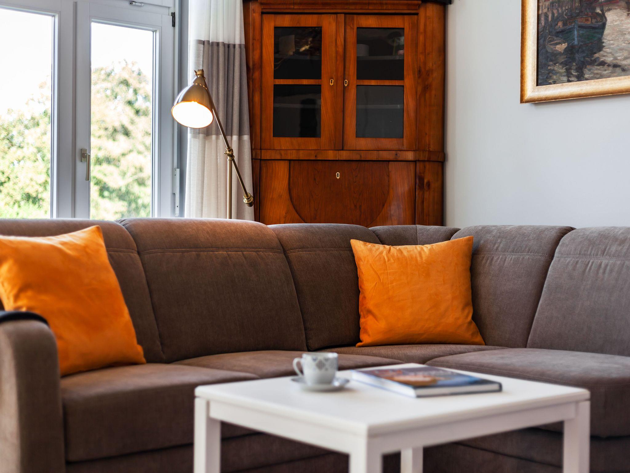 Wohnzimmer mit Couch, Esstisch, Küchenzeile, Kabel-TV, Radio und passwortgeschütztes WLan