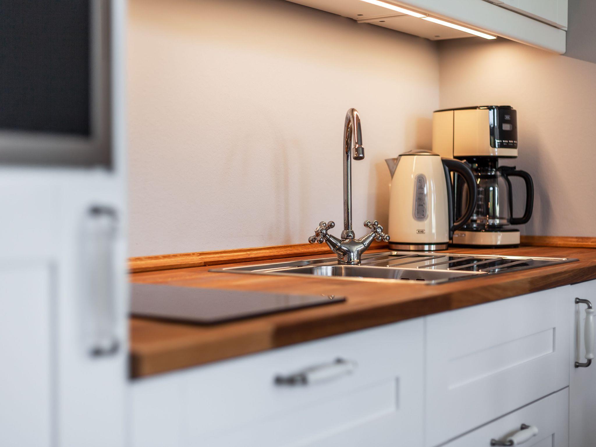 Küchenzeile mit Mikrowelle, Zweiplattenceranfeld, Kühlschrank mit Gefrierfach, Wasserkocher, Toaster und Kaffeemaschine