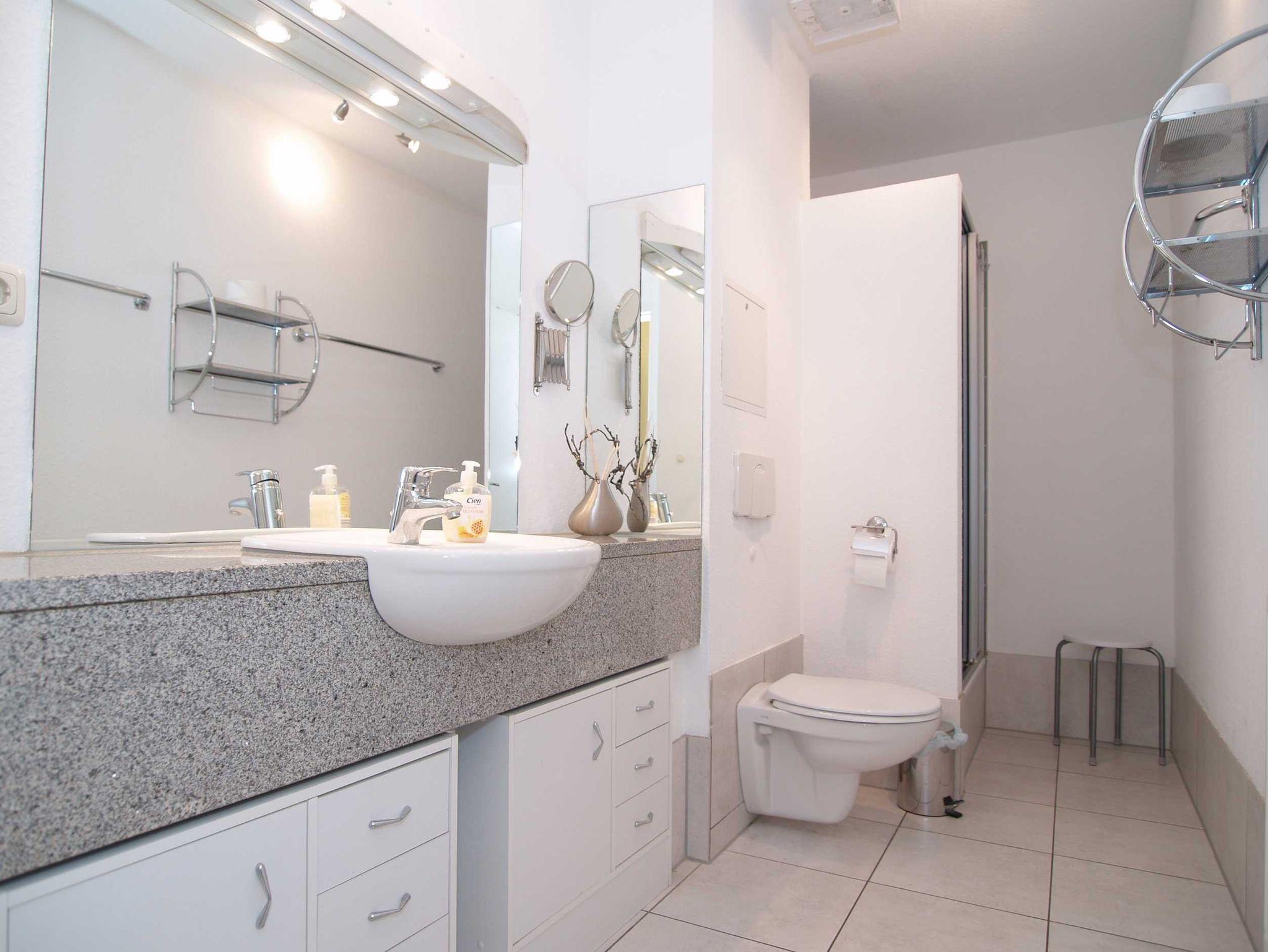 Abgerundet wird das Gesamtbild durch das moderne Badezimmer, das mit einer Dusche und WC ausgestattet ist.