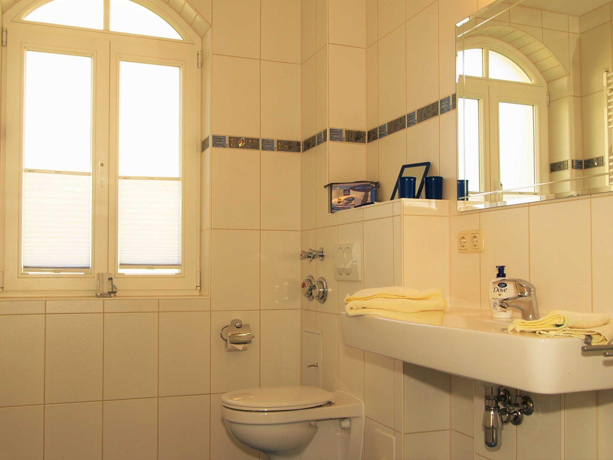 Im großzügigen hellen Schlafzimmer befinden sich ein Doppelbett (2 x 90cm x 200cm) sowie ein großzügiger Kleiderschrank für Ihre Urlaubsgarderobe und eine kleine Sitzecke. Von hier können Sie ebenfalls die nach Westen ausgerichtete Terrasse betreten. Im gefliesten Tageslichtbad mit Dusche und WC haben Sie dank des Handtuchheizkörpers immer kuschlig warme Hand- bzw. Duschtücher.